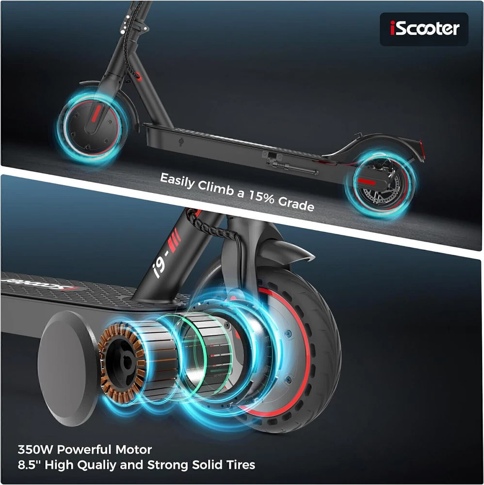 STORE NEW ARRIVALS ADD TO FAVORITE VIEW FEEDBACK CONTACT Store New Arrivals Add to Favorite View Feedback Contact Iscooter Electric Scooter, 25/22/18 Miles Range, 25/18.6/15.6 MPH Top Speed, 800W/500W/350W Foldable Commuting Electric Scooter with Double Braking Systems and APP for Adults and Teens Description Included Components i9 Electrcic Scooter Style i9(350W, 18miles) Number of Items 1 Age Range (Description) Adult Warranty Type Limited Package Weight 14.09 Kilograms Brand Name iScooter Brand iScooter Material Aluminum Suggested Users Ages 14 and up Frame Material Aluminum Handle Height 76 Centimeters Wheel Material Rubber Number of Wheels 2 Wheel Type Pneumatic Item Package Dimensions L x W x H 43.5 x 21 x 7 inches Manufacturer Zhejiang jinpan import and export co.,Ltd Brake Style Front Braking, Rear Braking Handlebar Type Fixed Grip Type Ergonomic Item Weight 10.9 Kilograms Charging Time 6 Hours Special Feature APP Controller, Non Slip Deck, foldable, Double braking system(Electronic brake+disc brake) Weight Limit 220 Pounds Item Dimensions LxWxH 42 x 17 x 44 inches Wheel Size 8.5 Inches Color Black Maximum Distance Range 18 Miles Recommended Uses For Product Commuting Model Name E9PRO Product Dimensions 42"L x 17"W x 44"H 【Cost-Effective Electric Scooter for Commuters】Discover an affordable and efficient commuting solution with our high-performance electric scooter adults. 350W electric scooters offers a maximum speed of 15.6mph, making your daily commute faster and more cost-effective. The Cruise Control System ensures a smooth and enjoyable ride. The scooter for adults has a maximum load capacity of 220lbs, catering to a wide range of riders. 【Long-lasting and Safety 】Equipped with a high-capacity 36V/7.5AH battery, our scooter electric boasts a travel range of 18 miles. With a quick charging time of 3-6 hours, you'll have more time on the go. Prioritizing your safety, it features warning taillights and ultra-bright headlights with a range of up to 15 meters, enhancing visibility during nighttime rides. The double braking system, including disc braking and EABS regenerative anti-lock braking, ensures a secure riding experience. 【Smart APP Control】Take control of your ride with the free KCQ APP, available for both iPhone and Android. Connect your adult electric scooter via Bluetooth and manage features such as lock/unlock, light control, gear adjustment, start mode selection, cruise control, and more. The smart APP enhances your riding experience and simplifies scooter operation. 【Foldable and Convenient】Experience unparalleled convenience with our one-step folding design that allows you to fold the scooter in just 3 seconds. Perfect for city commuting, campus travel, and office commutes, the scooter can be easily folded and weighs only 26 lbs, making it compact enough to fit in a car trunk. Elevate your family trips with this foldable electric scooter, providing unmatched convenience and joy. 【Quality Assurance by iScooter】At iScooter, we are committed to delivering premium, affordable, and reliable products. Enjoy peace of mind with our 12-month or 180-day warranty for different parts. If you have any questions, our dedicated customer support is ready to assist you. Your satisfaction is our utmost priority. Make your life more wonderful with iScooter's Foldable Electric Scooters. Product Description If you are looking for one special gifts for your childs or friends, We think that our i9 electric scooter will be the perfect one! Folding: 42''x17"x19" Unfolding: 42”*17“*44“ 1 36V/7.5AH Battery 2 Smart APP 1 Headlight &Taillight 2 Dual Braking Systems 3 Solid Tire&Mudguard Tips: Safety first! Always remember to wear helmets and knee pads How fast can electric scooters go? iScooter i9 electric scooters can go about 15.6mph with 2st gear, 9mph with 1st gear. What are the benefits of an electric sooter? The benefits of electric scooters are that they are affordable, high cost-effective and portable to save your time to find a parking space or wait for subway. They can also save you money on gas because they can be charged quickly. How long do e scooters last? With proper care and maintenance, an e scooter can last anywhere between 2 to 5 years or even longer. How do I choose my scooter electric? You can focus on the following factors: Rider's weight, Ease of installing, Battery life, Top speed you prefer, the weight of sooter and Appearance. Why there are different top speeds with same scooter. The factor of influencing the top speed: Rider's weight, the condition of road and weather, daily maintenance, etc. RECOMMEND FOR YOU Add to Cart Add to Cart Add to Cart Add to Cart Add to Cart Add to Cart Add to Cart Customer Reviews 4.3 out of 5 stars 773 3.5 out of 5 stars 2 4.3 out of 5 stars 773 — 4.4 out of 5 stars 285 4.3 out of 5 stars 773 4.4 out of 5 stars 49 Price $259.99 $ 259 . 99 $399.99 $ 399 . 99 $229.99 $ 229 . 99 $469.99 $ 469 . 99 $539.99 $ 539 . 99 $289.99 $ 289 . 99 $129.99 $ 129 . 99 Motor Power 350W 500W 350W 750W 800W 500W 70W Top Speed 15.6 mph 15.6 mph 15.6 mph 28 mph 25 mph 15.6MPH 6MPH Long Range 18 Miles 21 Miles 12 Miles 50 Miles 25 Miles 18 Miles 5 Miles Tires Type 8.5'' Honeycomb Tires 12" Pneumatic Tires 8.5'' Pneumatic Tires 10" Pneumatic Tires 10'' Off Road Tubeless Tire 10'' Honeycomb Tires 5'' & 3.5''PU Tires Hill Climbing Approx. 15% Approx. 15% Approx. 15% Approx. 20% Approx. 25% Approx. 15% / Charging Time 3-6 hours 5-6 hours 5-6 hours 8-9 hours 6-7 hours 3-6 hours 4-5 hours Package SIze 43*6*21 IN /110.5*16*53 CM 46*8.7*23.2 IN / 116*22*59 CM 43*6*21 IN / 110.5*15.5*53 CM 46.8*8.2*24 IN /118*21*60 CM 47.2*9.6*19 IN / 120*24.5*49CM 46*6*20.8 IN / 117*16*53 CM 25.6*9.2*9 IN /65*23.5*22.5CM Net Weight 26 LB/ 13.4 KG 55LBS/ 25KG 26.4LB / 12 KG 46.7LB / 21.2KG 51.2 LBS /23.25 KG 32.6 LB /14.8 KG 8.8LBS / 4KG Smart App ✔ ✘ ✘ ✔ ✔ ✔ ✘ ABOUT US We offer the best prices around on high quality products. Our E-store inclu