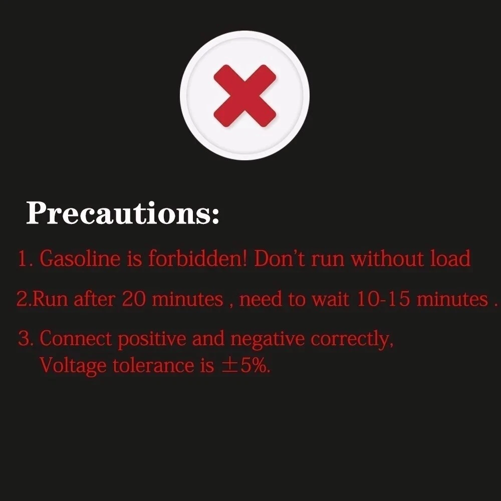 eBay Note: 1、Gasoline is forbidden ! 2、Don't run without load . 3、Run after 20 minutes , need to wait 10-15 minutes . 4、Connect positive and negative correctly , Voltage tolerance is ±5% .