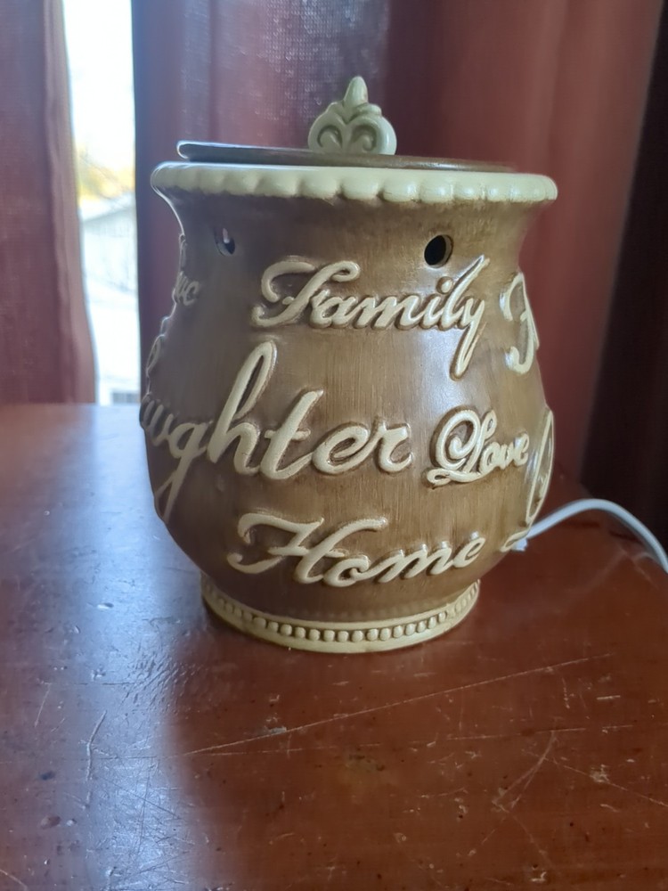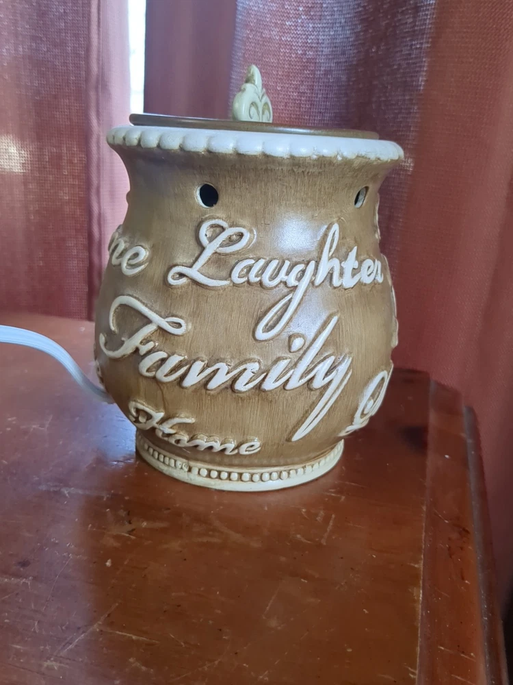 Add some warmth and ambiance to any room with this electric candle warmer. The warmer is made of ceramic and has a tan color and a modern style. It features raised writing of words and letters and is suitable for wickless tart/bar candles. This free-standing warmer has a round shape and measures 6 inches in height. It weighs 2 lbs and is easy to clean with a damp cloth. Perfect for teens and adults, this warmer is a great addition to any home decor, especially for holidays and food & drink themes.