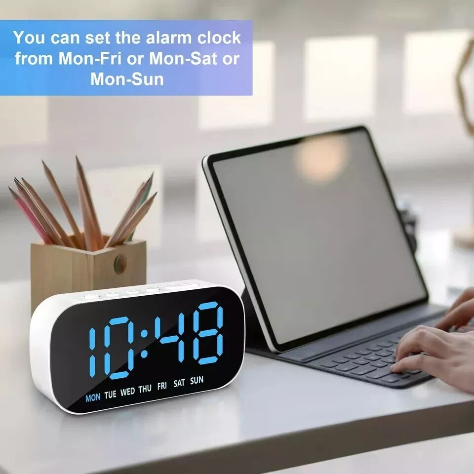 Free eBay listing template designed by dewiso.com Electric Digital Alarm Clock LED Large Display Battery Backup Snooze Powered and Time Memory: Digital alarm clock is a plug-in alarm clock that requires an external power source (excluding adapter) to be connected for power supply; 3 AAA backup batteries (not included) for storing time and alarm settings during power outage; Tips: Battery powered requires pressing a button to wake up and view the time Regular Features: Alarm clocks for bedrooms display time, day of the week, date, temperature (need to press the button to switch), includes 5 minute snooze time loud alarm clock for heavy sleepers adults, 12/24 hour time format, dual alarm, 5 levels of brightness; If there are any areas where you do not know how to operate, please consult us at any time, and we will do our best to solve the problem for you! Adjustable Brightness Alarm Clock: There are 5 levels of brightness for your options (day time); The small digital clock for bedroom will enter into night-mode and dim automatically at 10:00pm~6:00am to protect your eyes at night and save energy, create an peaceful environment for sleep Dual Alarm Clock and Snooze: Clock for bedroom have three alarm modes to choose from: Mon to Fri, Mon to Sat, or Mon to Sun; When the desk alarm is beeping, simply press any button to pause the alarm to get extra nap, long press the top snooze to stop alarm today, and it will still sound the next day Ideal for Gift and Home Decor: Intuitive and clear marked button, experience zero stress when setting the time or alarm, It’s an ideal gift for families, seniors, teens or friends; Easy to set alarm clock is also great for decorating your room as a desk clock Contact us We can be contacted at any time through eBay messages if you have any questions, comments or product requests. We will respond to you within 24 hours and do our best to help you out! We encourage our customers to contact us with any questions or concerns! We'd like to be sure you are completely satisfied with your purchase. 1NSTOCK