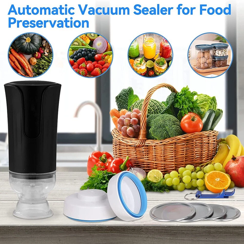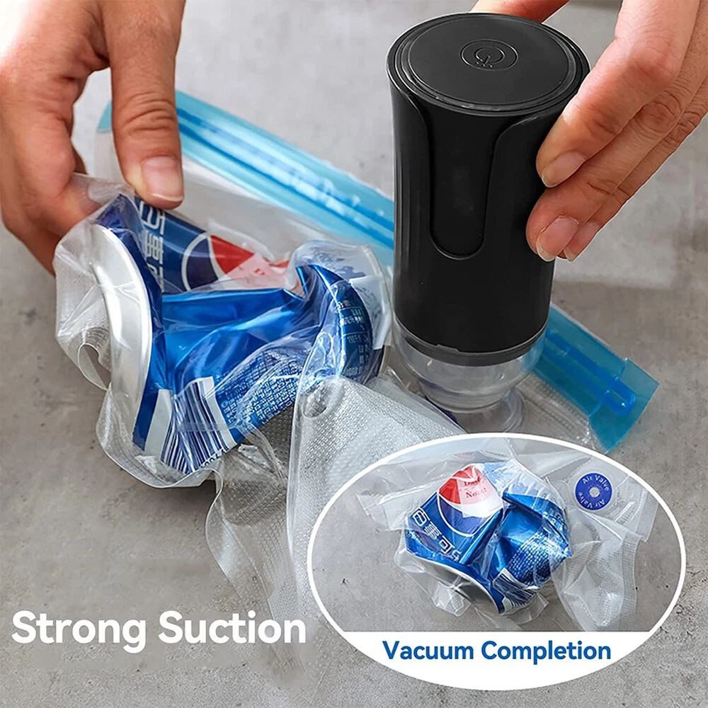 Electric Handheld Vacuum Sealer&Reusable Vacuum Food Storage Bags, Vacuum9427 The vacuum sealer is small, beautiful and generous. The vacuum pump is applicable to the food preservation of regular and wide mouth jar| Mason Jar with Accessory , the food preservation of sous vide|self-sealing vacuum bags, the food preservation of fresh-keeping boxes, and the vacuum storage and collection of clothes and quilt. The big mouth and small mouth of the vacuum pump can be used separately, compatible with vacuum devices of different specifications. The packaged food extends the freshness preservation time and is convenient for storage and transportation. It conforms to environmental protection requirements, is safe and reliable, and is beneficial to health. This food saver designed with fully automatic vacuum sealing operation, just aim the nozzle of the sealer at the suction valve of the bags and compress to suck the air out. The USB charging mode is convenient for home kitchen, office, outdoor picnic, camping and outing. Material: ABS colour: Black Package Contents: 1 x vacuum machine 1 x USB cable 10 x bags