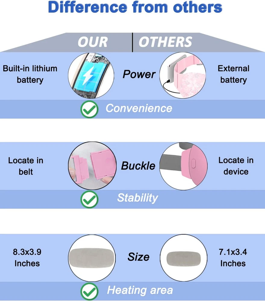 Store New Arrivals Add to Favorite View Feedback Contact Electric Heating Pad, Portable Cordless Menstrual Heating Pad with 4 Heat Levels and 4 Massage Modes, Fast Large Heating Belly Wrap Belt for Cramps, Back Pain Relief Gifts for Women Girls Her(Black) Description Item model number L-NGB-04-Black Color Black Brand Flyhorse Material Velvet Country of Origin China Item Weight 230 Grams Batteries 1 Lithium Polymer batteries required. (included) Special Feature Portable Package Dimensions 9.25 x 4.96 x 2.4 inches; 8.11 ounces Manufacturer Flyhorse New Design: The electric portable cordless heating pad has 4 heat levels and 4 massage modes, adjustable elastic belt with connect buckle and Type-C charging. Stable Buckle: The heating belt was designed with Seizing-up buckle. It let device stabler, no fall off any more. Moreover, it is more easily when using the device. Large Heating Area: The electric heating belt has enlarged the size to 8.3x3.9x1.0 inches, so that it has more heating area which can suitable for more part of your body such as belly, back, neck. Safety: The portable heating pad is designed to automatically shut down. If you fall asleep during use, our product will automatically turn off within 30 minutes when it detects that you have not made any movement, which can ensure your safety. If you want to use it again, just turn it on again. Best Gift for you: The menstrual heating pad is a good gift for friends and loved ones for any holiday or special event, such as Valentine's Day, Mother's Day, birthday, holiday, anniversary.(Note: The heating pad has more effective heating function. For the first use, we suggest starting from lowest temperature level, then adjust the temperature level according to your feelings. ) Product Description Flyhorse Electric Heating Pad Flyhorse Electric Heating Pad 3S Heating up No waiting for the temperature Enlarged Heating Area Compare with old generation heating pad, this one has bigger heating area size No Noise Silent Design. Provide you comfortable feelings Effective Heat More effective and safer Flyhorse Electric Heating Pad Structure This device has massage and heating functions. Every function can work independently. You can choose both functions, or only one of functions. Adjustable elastic belt suits for most waist size. Portable and Cordless Design Convenient to take. Just put it in handbag and take it anywhere. 4 massage and 4 heating modes 4 different massage modes 104℉/118℉/133℉/149℉ Stable buckle No “Fall off” issue Buckle locates on belt, easily to open or close Bigger size Big heating area Type-C charging Cordless design, more convenient Easily to adjust the modes Stable buckle Soft velvet surface Type-C charging Ideal Gift Gift Suggestions Gift to daughter Gift to wife Gift to friends ABOUT US We offer the best prices around on high quality products. Our E-store includes media such as books, movies, music and games while offering electronics, toys, sporting apparel, clothing, tools, general home, garden items and more. SHIPPING We are always working hard to ensure your package arrives as soon as possible. Please understand that some factors like weather, high postal traffic, and the performance of shipping companies are outside of our control. We offer free shipping to the lower 48 states and ship within 2 business days of payment, usually sooner. We do not accept P.O. Boxes. Please provide a physical address. RETURNS We offer a 30-Day Return Policy on items which you are not completely satisfied with. You have the option for a full-refund or an exchange of the item. No returns are available on items shipped outside of the USA. PAYMENT We accept PayPal. CONTACT US This page content is yet to come Please ad us to your favorite seller and visit again later Thank You CUSTOMER SATISFACTION We try our very best to make sure every customer is completely satisfied. If there's a problem, message us! We're happy to help.