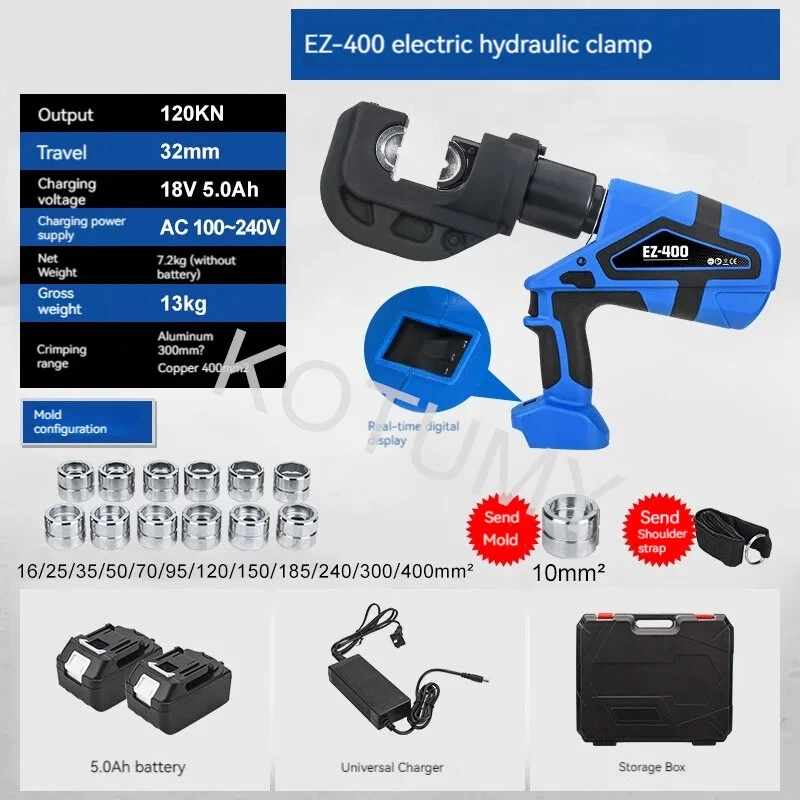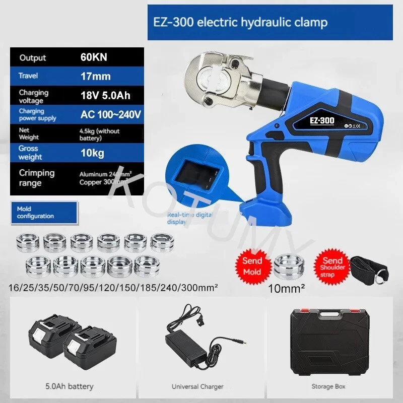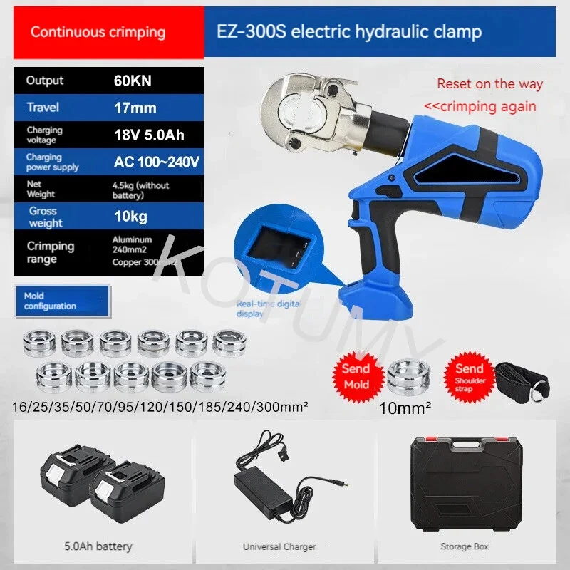 Product introduction: Model: EZ300 Output: 60KN Stroke: 17mm Charging voltage: 18V 5.0Ah Charging power supply: AC 100-240V Net weight: 4.5kg (excluding battery) Crimping range: aluminum 240mm ² Copper 300mm ²