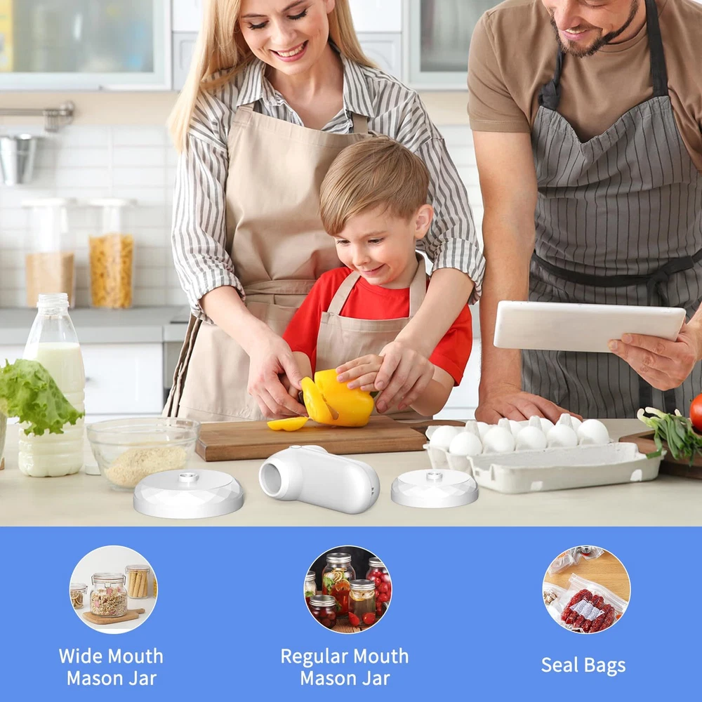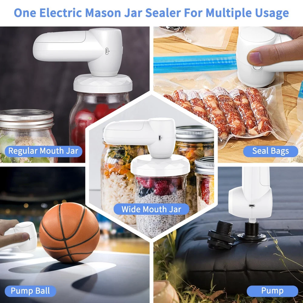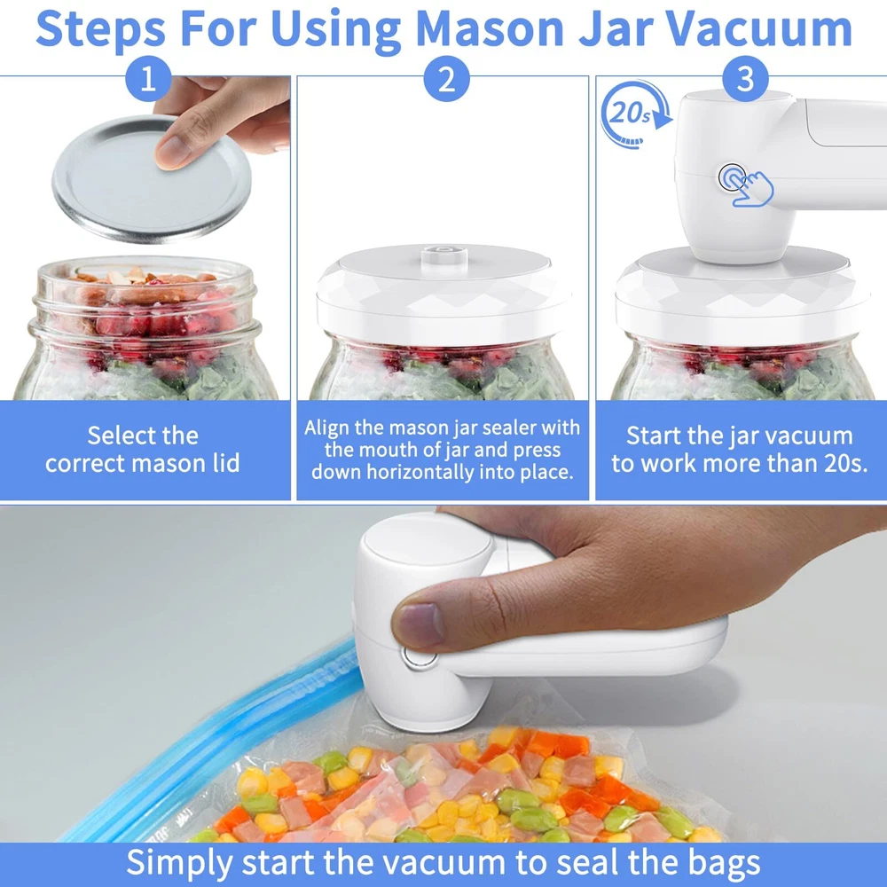 【Suitable for Two Types of Mason Jars】This Electric Mason Jar vacuum sealer for mason jars contains two sizes of mouth seals for your daily use. The canning vacuum sealer has a split design, can select the corresponding seal converter for the wide mouth or regular mouth mason jars. 【Also Is Vacuum Sealer For Food Storage Bags】This mason jar vacuum sealer also is a vacuum sealer for preservation bags. This electric vacuum sealer kit can quickly and easily seal the food storage bags or any of the preservation bags of which have the valve knobs without the need for additional accessories. 【Easy to Use】It is time to say good to the old version of the bulky traditional sealers. This upgraded mason Jar vacuum sealer is versatile and efficient, very simple to operate. The canning vacuum sealer uses efficient vacuum sealing technology to keep your food fresh in seconds. 【Rechargeable Portable Vacuum Sealer】This jar sealer vacuum kit is equipped with a large battery, providing extended usage time and stronger suction for effortless vacuum sealing. The compact and cordless design of the mason jar vacuum sealer makes it easy to take with you anywhere, whether you are traveling or having a picnic, this one sealer kit will meet all your vacuum sealing needs. 【Perfect Gift Idea】 What is included? You will get 1*electric jar sealer, 1* regular mouth seal converter, 1* wide mouth seal converter, 3*regular mouth mason jar lids and 3*wide mouth mason jar lids, 1*charging cable, lid opener and user guide. This mason jar vacuum sealer kit is perfect for family or friends who loves cooking.