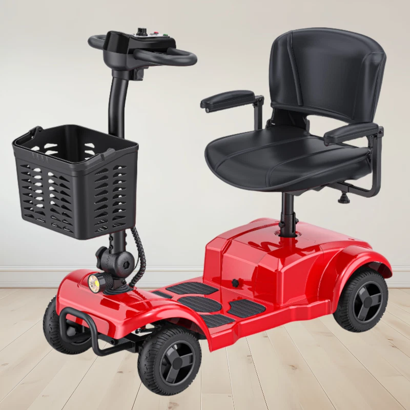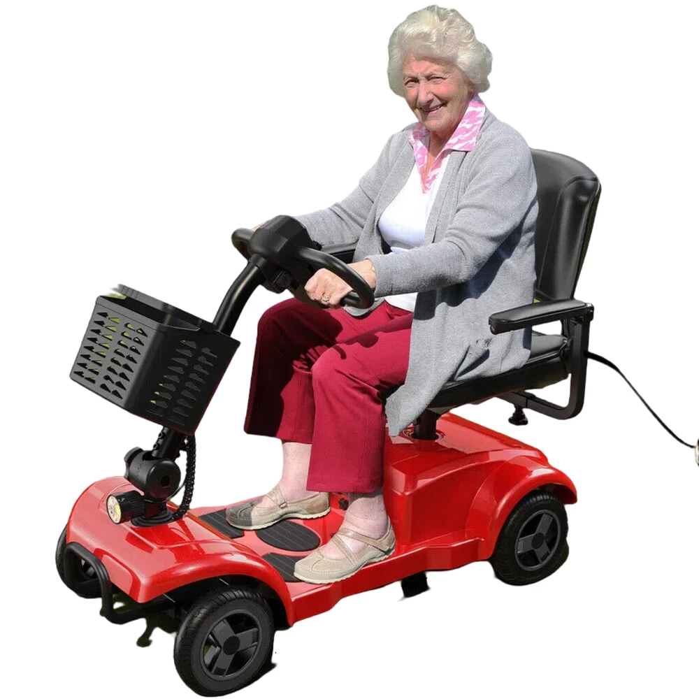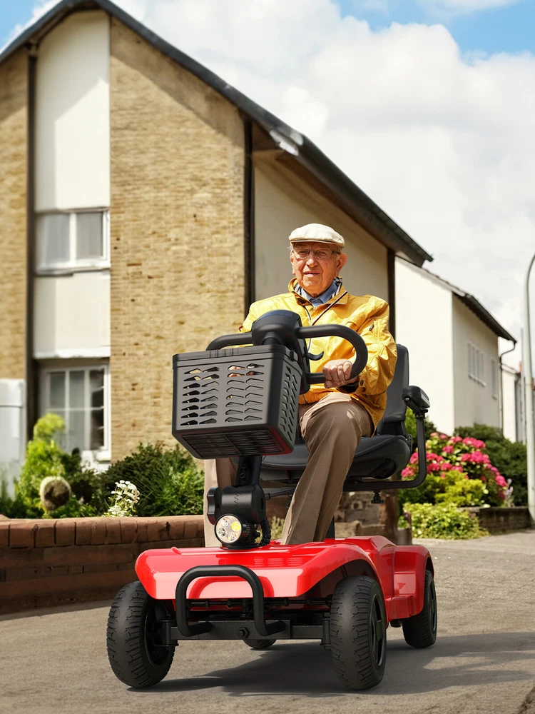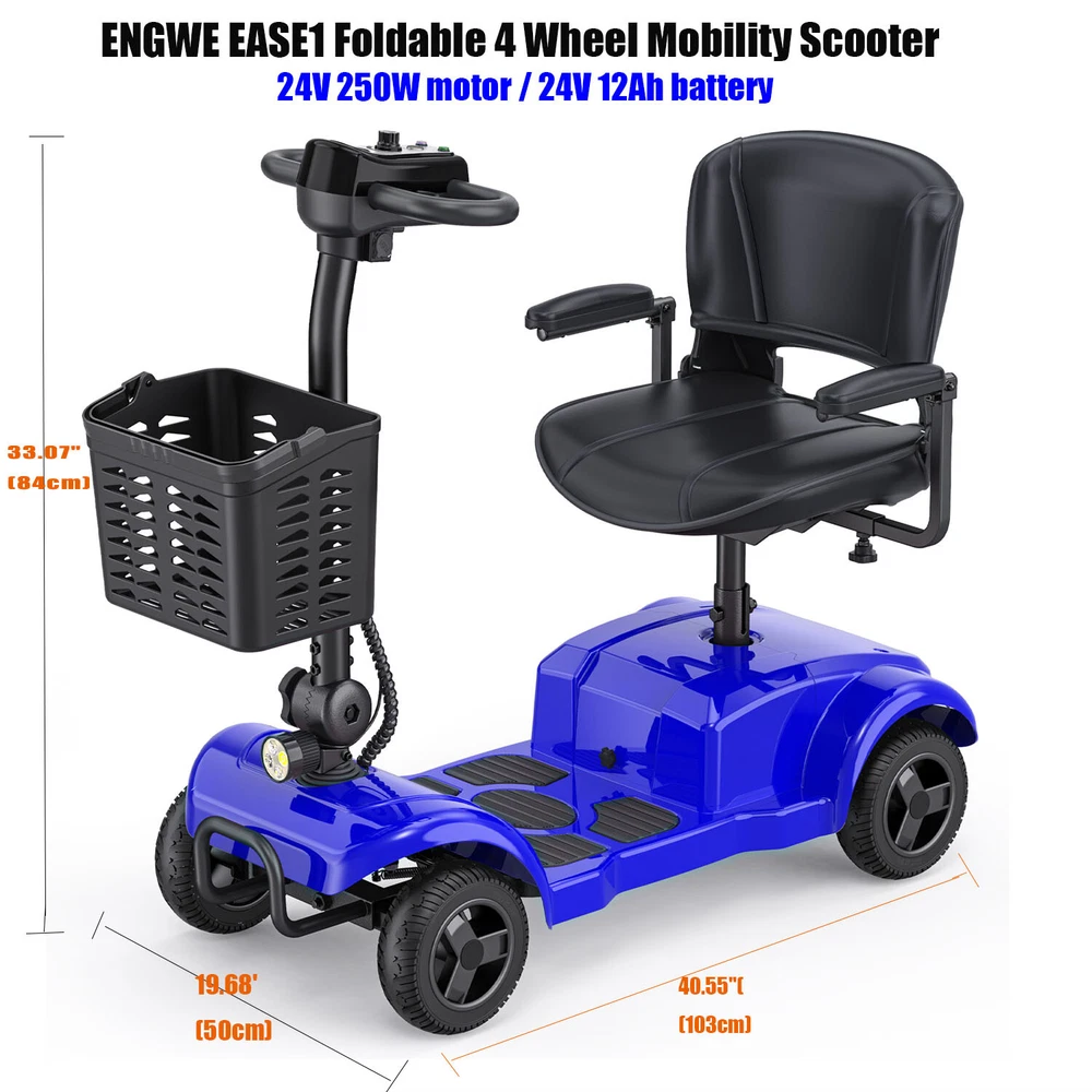ENGWE 4 Wheel Power Mobility Scooter Heavy Duty Travel with light 2024 upgrade 【Main Parameters 】 🛵 Max Weight Capacity: 300 lbs / Max Speed: 6 mph / Range: 20 miles per charge / Climbing Slope: 8º / Battery Capacity: 24V/12Ah 【Comfort Adjustable Seating 】 🛵 The spacious seat and backrest can provide gentle cushioning and support ; the height-adjustable seat can easily be customized to comfort your legs ; the scooter is also surrounded by two padded armrests that you can adjust them forward or backward for greater convenience when getting on or off the scooter. 【Safety First 】 🛵 The mobility scooter is equipped with four pneumatic tires and anti-roll wheels to give you more comfortable and smooth driving experience, even when the vehicle drives on moderately rough roads.And the scooter is designed with the intuitive control panel which is easy to operate. It is designed with electromagnetic brake which is easy to control and much safer. The scooter comes with headlights and brake lights to ensure safe driving. 【 Easy to Transport 】 🛵 It is easy to disassemble the mobility scooter into four separate pieces without tools, you can put them in the trunk of standard size vehicles and making your travel much more convenient and comfortable! 【INTUITIVE CONTROL PANEL】 🛵 Located on the tiller console, the control panel allows you to set the maximum speed with the variable speed dial, change from a forward to a reverse direction, turn on the headlight as well as produce a warning tone as needed. The display also includes a color-coded battery life indicator for checking the status of the battery at a glance. 【Slope Safety Mechanism】 🛵 The electric mobility scooter for seniors is designed with your safety in mind. Its default state is "parked", ensuring that it will remain motionless even on slopes. It is safe for people who cannot move quickly or for a long time on their own, such as people with mobility problems or the elderly. 🛵Our team is dedicated to providing excellent customer service to ensure you get the best scooter experience possible. Your mobility scooter has a 1-year warranty. If you encounter any problems, please feel free to contact us. We will reply within 24 hours and solve the problem as soon as possible. TECHNICAL SPECIFICATIONS Motor 24V 250W Max. Weight Capacity 265 lbs Driving Distance 15.5Miles Braking Electromagnetic Brake Climing Gradeability 158 Degree or more Battery 24V 12AH Seat Size 13.78"x15.75"x20.47" Product Size 40.55*19.68*18.89inches Scooter Weight 82Lbs(37.2KG) Package Wight 108 lbs Features Dual model can switch quickly. 4 Wheel configuration provides additional stability. Quick and easy disassembly into 4 easy-to-transport pieces. Height-adjustable swivel seat with fold-down backrest. Comfortable, Armrests are padded and adjustable. Comes with large metal carry basket. Solid, non-marking, flat-free tires for worry-free travel. Anti-tip wheels for greater safety. Headlight for enhanced safety. Delta tiller is easy to adjust; Ergonomic throttle control with easy freewheel operation. Seat back folds completely flat, which comes in handy when transporting or storing the scooter. Comes with easy to remove, quick connect battery pack that can be charged separately from the scooter. Warranty: Lifetime on frame, 24 months on electric controller and drive train components, 12 months on batteries. Folded size: 40.55*19.68*18.89inches Specifications Weight Capacity 300 lbs. Top Speed 6.5 mph Estimated Range 15 miles Max Climbing Angle 15° Turning Radius 53.75" Ground Clearance 2.5" Armrest Width, Operating Lever, 360° Rotation of the Seat (The seat's dimensions are 14.2" in width and 15.75" in depth.) Motor 24V x 250W Batteries 24V/12AH Battery weight 9.5kg Color Red Brakes Electromagnetic Freewheel Mode Yes Front Wheels 8" x 2" Rear Wheels 8" x 2" Anti-Tip Wheels Yes Base Weight 70 lbs. Seat Weight 23 lbs. Total Weight 110 lbs. Package including: Ease1 Mobility Scooter x 1 Front Basket x 1 Scooter Key x 2 Charger x 1 User Manual x 1. With the power mode, backward skidding will not occur even if the movement is stopped in the middle of an uphill slope, but please note that it is not recommended to stop running during the uphill process. Strong climbing ability allows for easy wheelchair access.