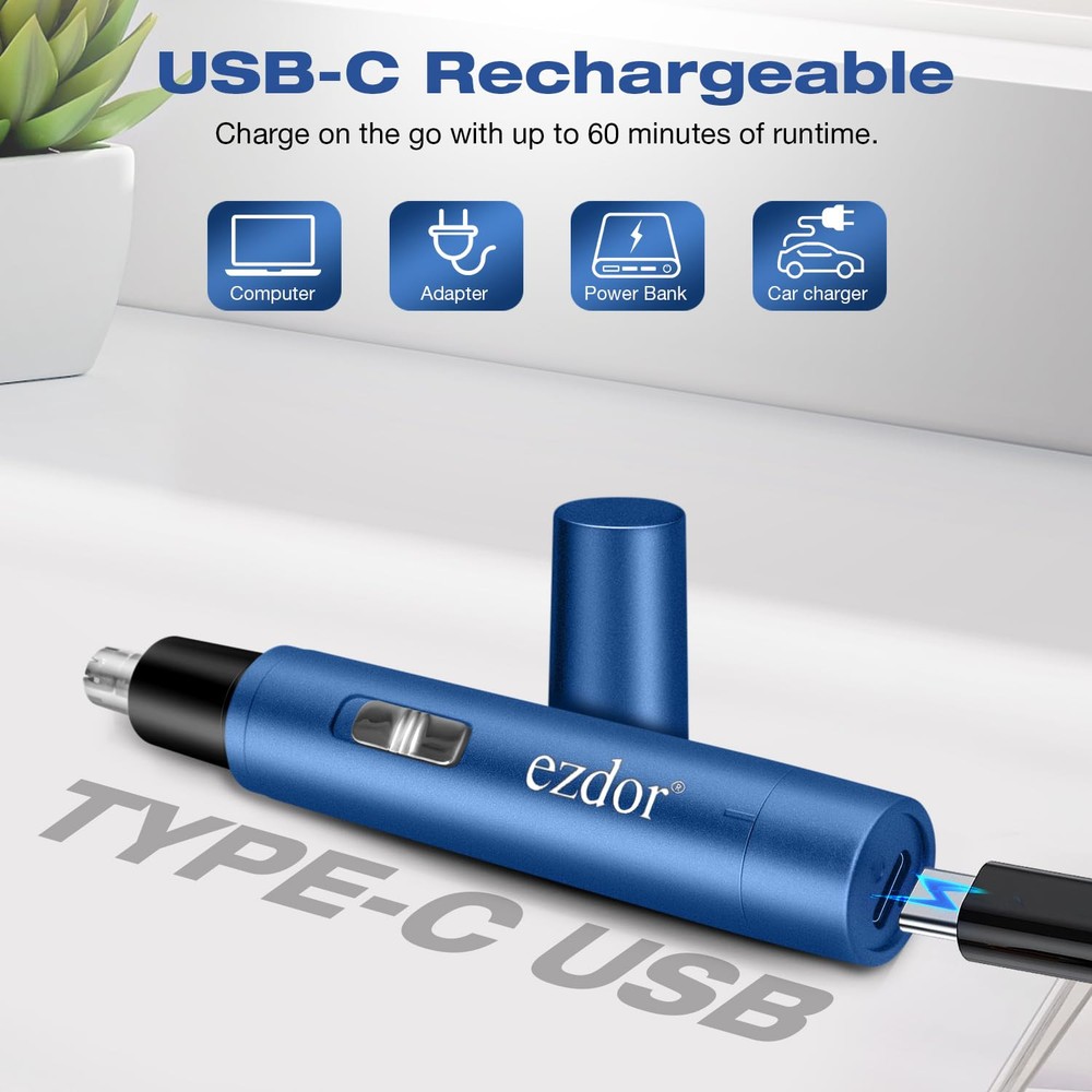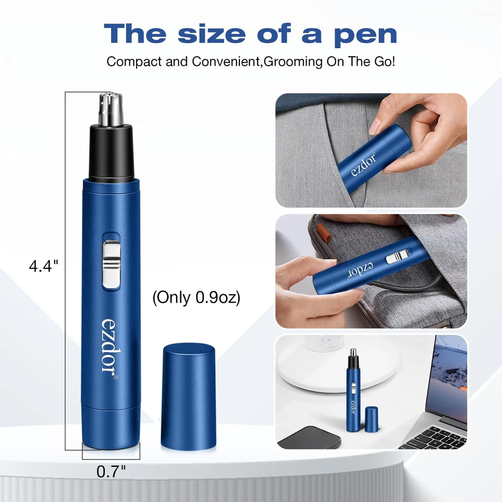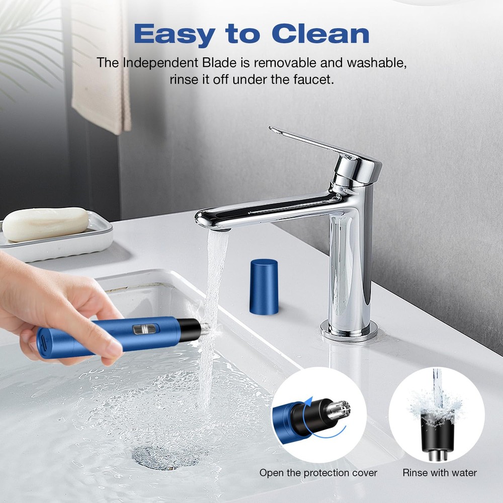 Nose & Ear Hair Trimmers: Professional Cordless Nose Hair Trimmer's blade system is made of high quality stainless steel, which can effectively and comfortably remove unwanted hair from nose, ears and face, one-touch on/off design, suitable for both men and women. Compact size: 0.7 x 4.4” Only 0.9oz Powerful & Painless: The allergy-resistant stainless steel nose hair trimmer features an upgraded copper-core motor that's powerful enough to work with the dual-edge spinning blades system to cleanly cut hairs without pulling almost painlessly. Can trim hair precisely and sharply. The blade system is designed to fit snugly in the nasal cavity, and the enhanced anti-allergy ability ensures a safer, more comfortable trimming experience SMOOTHER & SAFER TRIMMING: Nasal-specific stainless steel round blades with safety guard design and powerful motor powers a 360° rotating dual-blade system that smoothly passes through thick, coarse hairs. Operation noise is less than 50db, use the nose hair clippers freely. USB Rechargeable: Nose & Ear Hair Trimmers comes with a USB cable and built-in battery for easy charging. It can be charged anywhere with the included USB C charging cable, and its powerful fast-charging feature allows it to be fully charged in less than 2 hours, eliminating the hassle of replacing AA batteries too often! EASY TO CLEAN: The stainless steel blades of the nose hair trimmer are waterproof, remove the trimmer head directly from the body for cleaning, washable and removable trimmer head for easy cleaning and maintenance. Convenient body design comes with a dust cover to protect the trimmer head.