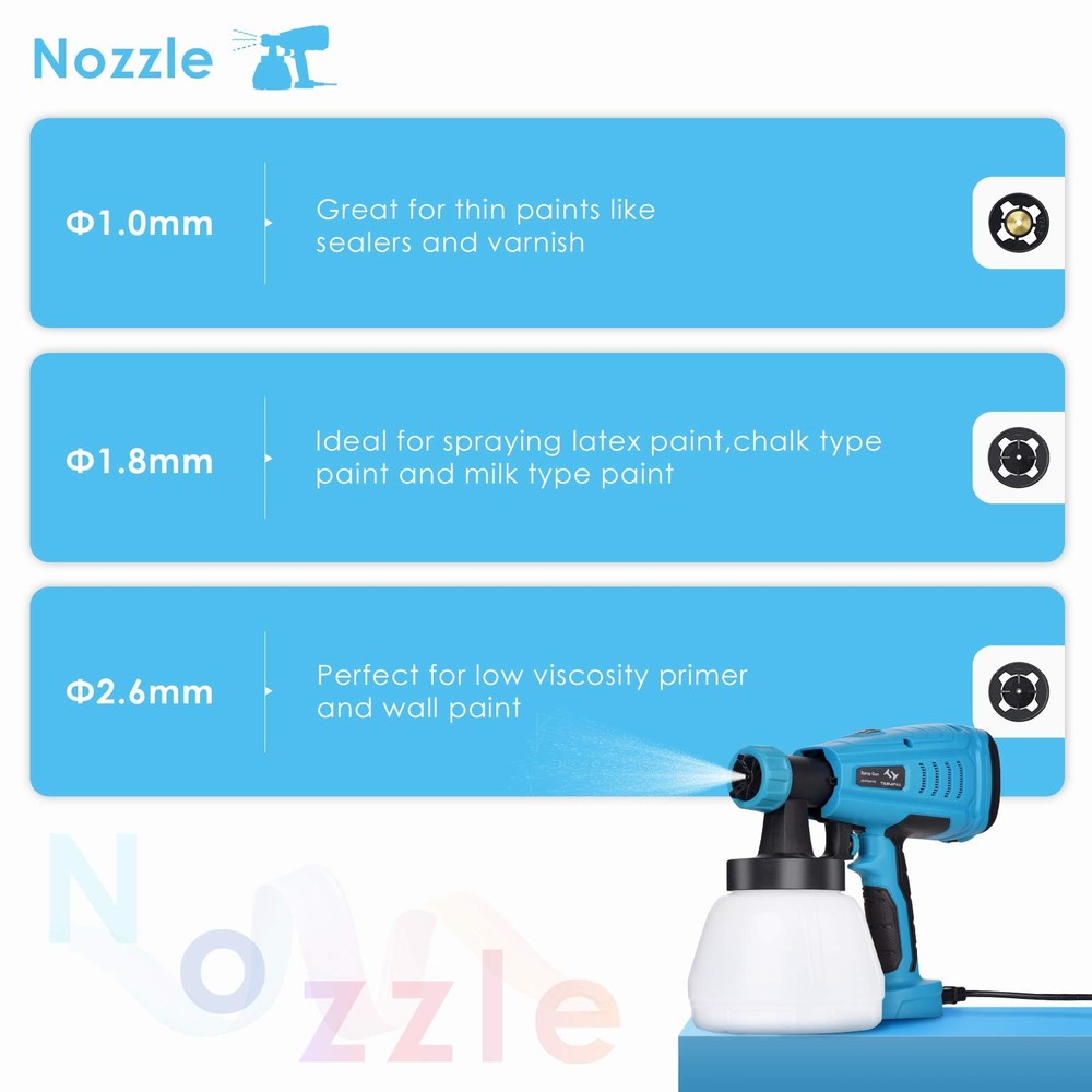 HVLP paint gun use for painting ceiling, fence, cabinets, wall, wood, chairs or crafts, it can be adjusted to 3 different spray patterns:horizontal/vertical/circular High Power And Large Capacity Electric Paint Sprayer : Tilswall HVLP paint gun provide excellent atomization effect and accuracy to support smooth and superior painting results. With 1300ml detachable container keeps you using it for longer time until the next replenishment. Tilswall spray gun is your best choice for painting ceiling, fence, cabinets, wall, wood, chairs or crafts Adjustable Flow Control: The flow current can be adjusted by the knob on the trigger to achieve the coating speed(0-1200m/min) and project size, then you can spray the coating accurately and evenly without brush marks, A variable air pressure control from 0 to 1200ml/min allows you to change the force the sprayer uses to release paint, finish the earliest possible time with a substantial horsepower. make you work more efficient 3 Spray Patterns & 3 Nozzle Sizes: Paint sprayer can be adjusted to 3 different spray patterns:horizontal/vertical/circular,and equipped with 3 size nozzles(1.00mm/1.8mm/2..6mm) 1.00mm great for thin paints like sealers and varnish, 1.8mm ideal for spraying latex paint, chalk type paint and milk type paint, 2.6mm perfect for low viscosity primer and wall paint Easy To Use And Clean: Tilswall paint gun use detachable design, all parts of the paint gun can be detachable, that is very easy to assemble when you want to start to paint, After you finish work you also can easy to clean machine, just remove container to wash, you don't need to remove whole paint gun 9.84ft cable & 120 din/s:9.84ft/3m cable : increases more accessibilty when you need more mobility; 120din/s supports high visocity for avoiding clopping easily which will cause the gun to spit and sputter, even for latex paint. Great for decks, fences, furniture, trim, sheds, railings and garages