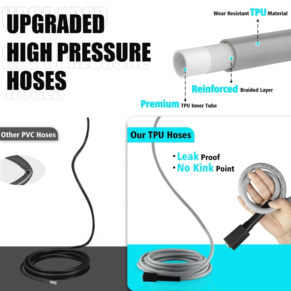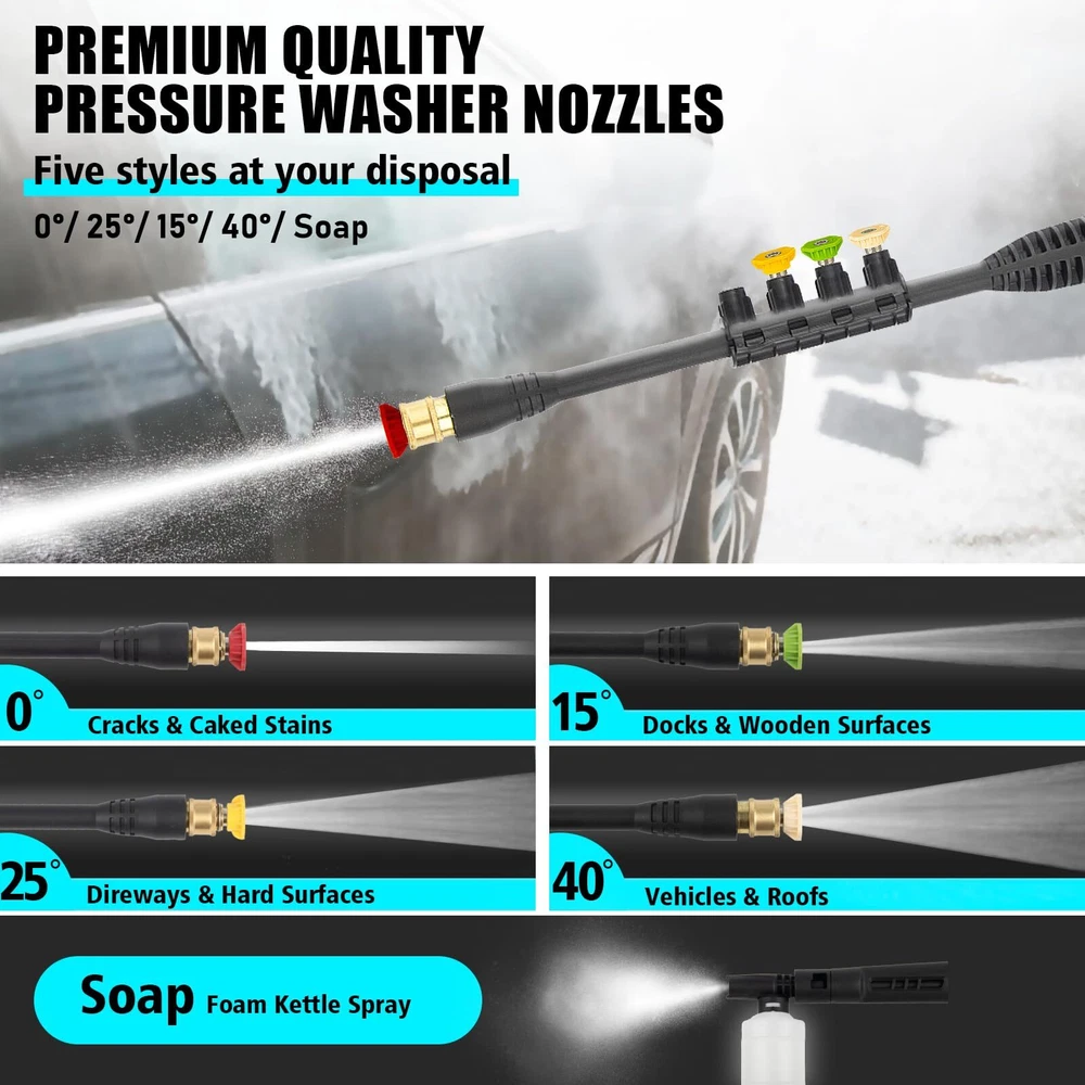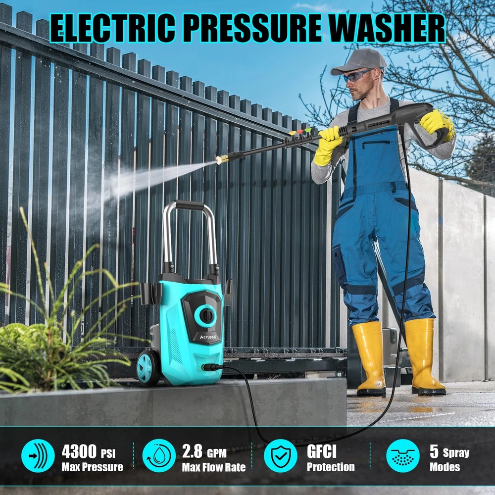 【POWERFUL HIGH PRESSURE WASHER】Generating up to 4300 pounds per square inch (PSI) of pressure with a flow rate of 2.8 gallons per minute (GPM), our electric power washer provide efficient and thorough cleaning a larger area in a shorter time. Efficient removal of multi year grime. 【4 DIFFERENT NOZZLES &FOAM CANNON】electric pressure washer with 4 quick connection nozzles(0°,15°,25°and 40°)0°delivers super pressure for concrete and bric with hard surface. 15° delivers high pressure for cleaning direways & hard surfaces. 25° tip delivers medium pressure for decks & wooden surfaces. 40° tip delivers low pressure for vehicles & windows. Soap tank can achieve foaming effect in an instant. 【UPGRADED HIGH PRESSURE HOSES】We have upgraded the high pressure hoses. New developed material to prevent kink when you wash for extra distance requirement, easy management, and roll-up. TIPS: Please lay flat to full length before using it, then it will be moved and store very easily. 【3 WATER-SUCKING WAYS】The electric high pressure washer can choose bucket self-priming water or pool self-priming. At the same time, you can also connect faucet self-priming. (connect faucet not included) 【UPGRADED DESIGN DETAILS】This pressure washer attaches a 35-foot power cord with inline GFCI for use.It helps you control and check the power using. In addition, this electric pressure washer adopts metal spiral interface design to prevent water leakage and we have also upgraded the handle to make it be more humane. 【PROFESSIONAL AFTER-SALES SERVICE】Our customer support team is available 24/7 to address any questions or concerns you may have within 24 hours.