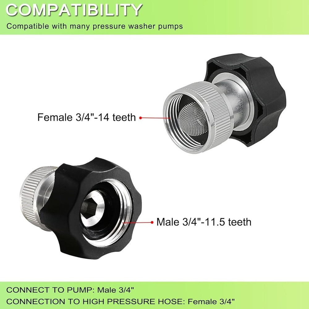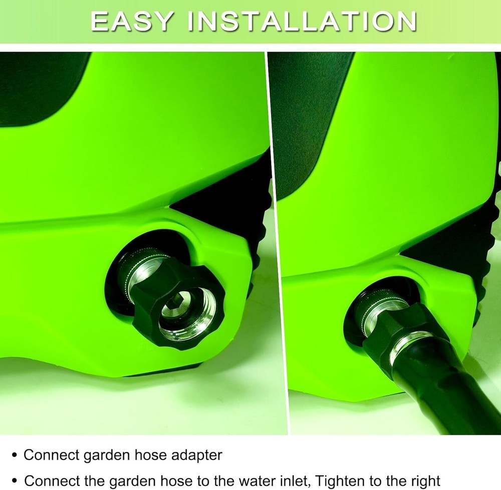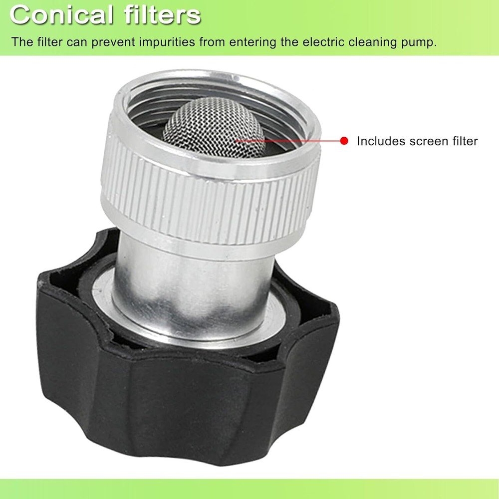 Universal Adapter: 3/4” Garden hose connection adaptor. Made of: Aluminum pressure washer for maximum durability. Built-in Filter: The filter can prevent impurities from entering the electric cleaning pump. Leak-proof: Advanced technology to ensure the high precision of thread and no leaks.