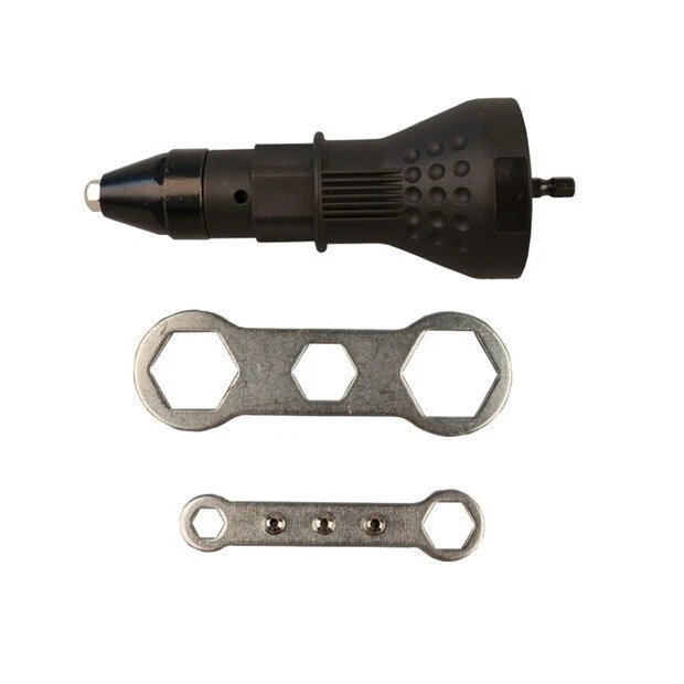 New and high quality. What you get: 1 x Rivet adapter 2 x Wrench Attention: The power tool is NOT included. The rivet does NOT apply to the drill with impact function. 1cm = 0.39in = 10mm, 1in = 2.54cm = 25.4mm. 1%-3% size difference is allowed cause measured by hand. Due to the different monitors, the picture may not reflect the actual color of the item. Usage: (Pick the right size opening for your rivet, there are 4 to choose from. ) ღ Attach the tool to cordless drill. ღ Hold the tool, before it starts to grab the rivet, hit reverse on your drill until you feel click. The rivet can be fitted in once the teeth widen. Put the rivet in the tool and slowly hold the handy part of the tool and pull the drill trigger, when you feel it start to grab the rivet. ღ Put it in the hole that you wish to rivet and keep holding the handy part and hit the drill at full. ღ Once the rivet pops, keep holding the handy part of the tool and hit reverse on your drill. ღ The teeth will widen and the old rivet shaft will drop to the ground. Put your drill back in the forward position and rinse and repeat. Details: ♥ Function: riveting ♥ Material: plastic + metal ♥ Big wrench: 13.5cm/5.35"" ♥ Small wrench: 10cm/3.94"" ♥ Working with power drill: ≥1.5N.m ♥ Riveting tool: 16 x 5.8cm/6.30"" x 2.28"" ♥ Nozzle size: 2.4mm, 3.2mm, 4.0mm, 4.8mm "