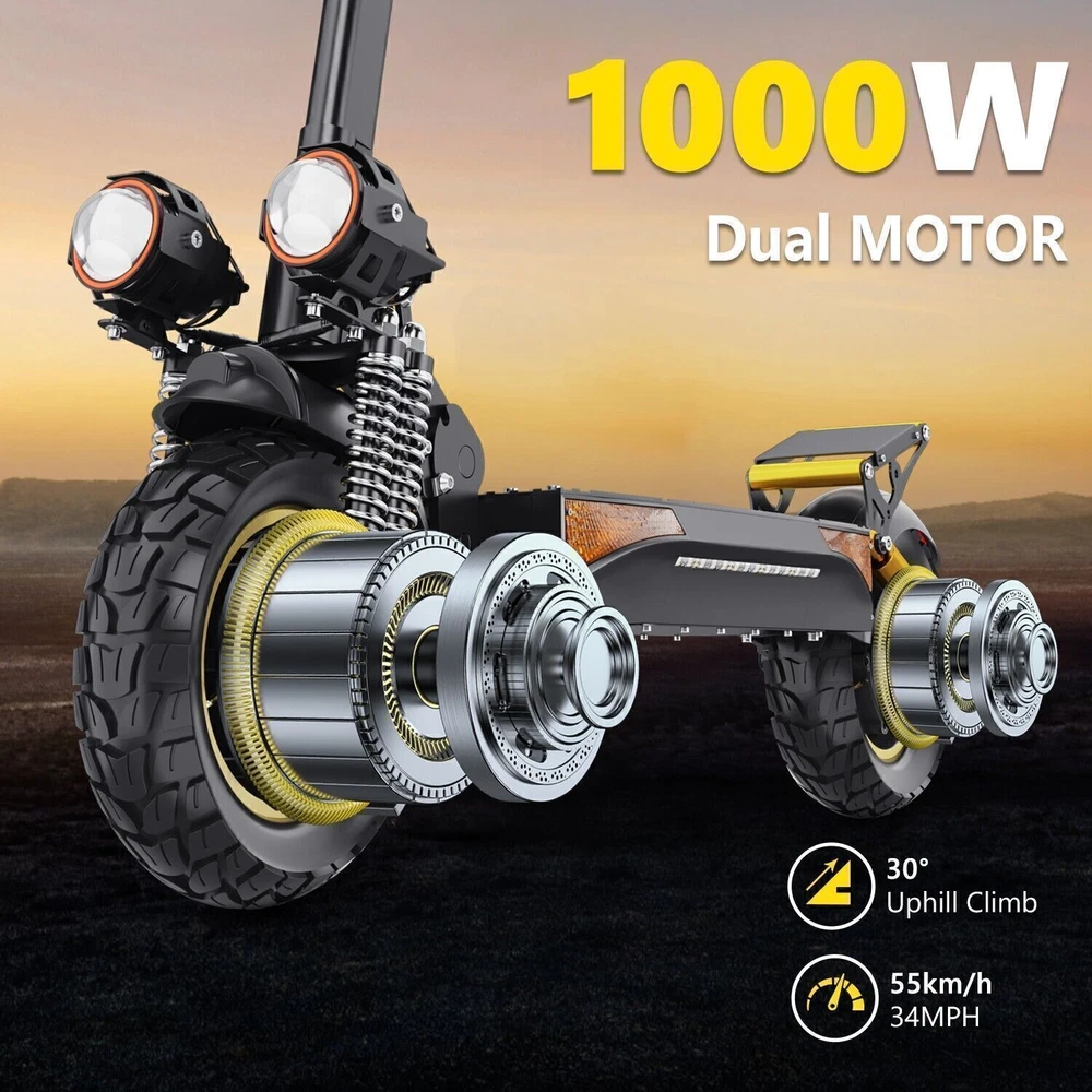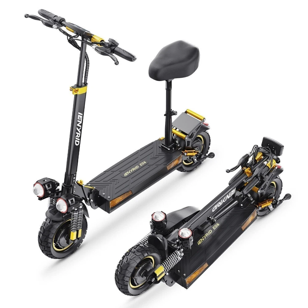 2OOOW Adults Electric Scooters 1OOOW Dual Motors Drive 48V Max Speed 37Mph Long Rang Fast 28-34Miles Commute Off Road E-Scooter 2023 Upgraded iENYRID Electric Scooter ES6 Foldable Electric Scooter comes with a 960Wh (48V 20.8Ah) battery assisting 28-34 miles cruising range. ES6 becomes an excellent choice for high-quality and comfortable riding. It is suitable for commuting to work, shopping in supermarkets, mountain cross-country and traveling. Powerful Motor & Long Lasting Battery ES10 electric scooters f With powerful Dual 1OOOW Motors, detailed parts, detachable seat and foldable design,, brings faster acceleration and climbing ability to this electric scooter, which can reach 35 mph max and max 30°climbing angle. Comfortable Commuting IENYRID ES10 adult off road electric scooter comes with upgraded 10-inch off-road tires and front and rear dual suspension to ensure max comfort even on bumpy roads. Also, the aviation-grade aluminum frame is stronger and lighter, which makes the scooter much more elegant to look at and handle as well. And it has a max load of 280 lbs. Foldable Electric Scooter Easy to fold and carry, carry it on public transportation or store it in your car to get to wherever you want. Dynamic, Easy storage in car trunks and other compact spaces, occupying little space and suitable for travel and transportation commute. IPX5 Super Waterproof & LED Intelligent Lighting System The waterproof frame and deck are tightly sealed against water, accredited with an IPX5 ingress protection rating painting. The head of the e scooter is equipped with three LED lights with different functions to ensure safe and worry-free riding at night. Specification: Model: iE-ES6 Battery: 48V / 20.8Ah(Shenzhen Chuangxingyuan and Dongmag A-grade batteries) Power: 1OOOW x 2 (40*3mm magnet Dual Motors) Display Screen: Color Max Speed: 34Mph Range: 24-34Miles Max Load: 120 KG Tire Size: 10 inch Tire Type: Off-road Air Tires (Front and rear 10-inch pneumatic off-road tires) Charging Time: 7-9 hours Frame Material: Aluminum Alloy Net Weight: 30.34 KG Gross Weight: 35 KG Package Size: 48.2 x 10.2 x 20.7 inch Brake: Front and Rear Disc Brake Light: Front LED Headlights, Cornering Lamp, Sidelights, and Taillights (One-piece headlight, built-in speaker, side red, green and blue colored lights, rear brake lights, front and rear turn signals with running water, with spotlight function (waterproof connector for headlight and tail light)) Adapter: Input: AC 100-240V ~ 50/60Hz 1.5A, Output: 54.6V 2.0A Note: The maximum load capacity is the maximum weight that the scooter can withstand. Instrumentation: ① Yongkang Zhe whale black and white screen instrument (do waterproof connector) ② Function: NFC card brush instrument screen boot (with 2 NFC card), public mileage switching, 5 minutes of automatic resting screen, free to lift the speed limit, cruise control, a single mileage and total mileage clearing, zero-start (power on the display of 0 gears), fault code prompts, the stall stall display Frame: Aluminum frame Finger Pivot: Acceleration finger pivot is uniformly mounted in the right hand direction Pedals: Black one-piece pedals (brand logo printed) Brakes: front and rear power-off disc brakes, left and right e-brake lines with waterproof connectors. Seat Bag + Carrying Handle: Sponge memory seat (seat bag + base packaged as accessories, carrying handle installed in the E-Scooter) Risers: round risers with fixed latches Reflector: white front + yellow side + red rear Speed: factory set speed limit according to European regulations (maximum speed of 15.53Mph before unlocking, speed of 6.21/9.32/15.53Mph in three gears), the instrumentation needs to be equipped with a function that can be unlocked (maximum speed of 34Mph after unlocking, speed of 12.43/21.75/34Mph in three gears) Pure electric range range 27.96Mph~40.39Mph Max speed may vary depending on the rider's weight, riding style, ambient temperature, battery level, and terrain. This list breaks down the key specifications and details of the iE-ES6 scooter. Package Contents: 1 x Charger 1 x User Manual 1 x Electric scooter ''Warning: It is illegal to ride electric scooters on public roads (except under very specific circumstances), pavements or cycle paths. They are intended only for use on private land with the owner’s permission.''