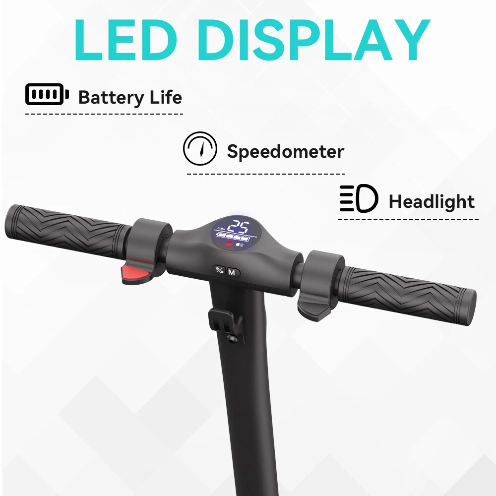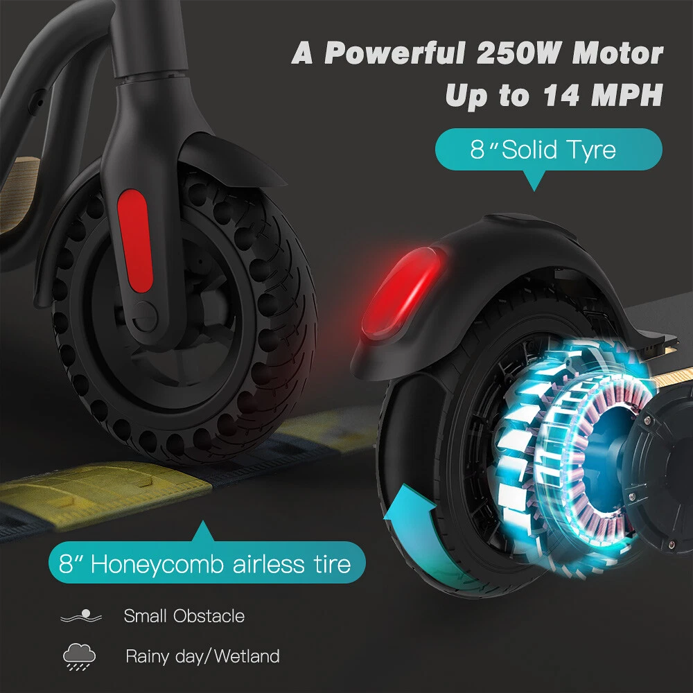 Main features: LONG RANGE BATTERY LIFE - Powerful 250W motor and 7.8 Ah/36V lithium battery pack that supports a speed of up to 15 Mph with a range up to 13 Miles. Updated large-capacity battery life, designed for commuters and longer distances. 8.0" HONEYCOMB & SOLID TIRES - Shock-absorbing rubber tires offer a smooth ride even over bumpy surfaces. PORTABLE FOLDING DESIGN - Electric scooter can be folded easily in 3 seconds with quick folding latch for easy carrying and storage. BATTERY INDICATOR AND LIGHTS - Battery indicator keeps to track battery life. Ultra bright LED headlight and taillight. Fast recharging about 5 hours. GEAR SHIFT SETTING - 1st gear for a 7 Mph comfortable ride or 3rd gear to get the 15 Mph fast experience. Extremely fun to ride and end boring commutes. Specification: Brand: Megawheels Model: S10 Dimension: Unfolding 105 x 43 x 118 cm; Folding: 105 x 43 x 48 cm Net Weight: 11.9kg Color: Black Frame Material: Aluminium Tires: 8.0" Honeycomb Front Tire & Solid Rear Tire Max Load: 100kg Max speed: 25KM/h Speed level: Gear 1--Max 10km/h ; Gear 2--Max 20km/h; Gear 3--Max 25km/h Mileage: 17-22km Grade Ability: 20 degree slope Working Temperature: -15°C-50°C Storage Temperature: -20°C-25°C Mode Type of Motor: Brushless hub motor Battery Type: High quality lithium battery Battery Capacitiy: 7.8 Ah Battery Voltage: 36V Charger Input Voltage: 100V-240V Charger Frequent: 50Hz/60Hz Charging time: 5 hours Package Contents: 1 * Folding Electric Scooter 1 * Battery Charger 1 * User's Manual NOTE:The appearance of the product you receive may vary slightly from the image shown due to differing production batches! Before use, please kindly read the schematic diagrams and assembly steps of manual to assemble the front wheel: 1. Step on the base, lift the fork firmly to remove the base. 2. Remove the rubber plugs on both sides of the front fork, and unscrew the front axle with the two 6mm hexagon wrenches in the package. 3. When installing the front wheel (please pay attention to the direction of the tread of the tire, as shown in the lower right or the inflation port to the right), and tighten the front wheel axle. 4. Plug back the rubber plugs on both sides of the front fork. Riding Skills: -Put your foot in the front of the scooter and the other foot on the floor before riding. -Make sure that the riding route is smooth. -Slide forward with the food standing on the floor before starting (like riding the scooter without power). -Immediately press the acceleration button and lean forward to avoid falling over backward due to inertia, so that the electric scooter will enter the working status. -Avoid pressing the handle with your body in the acceleration and deceleration process. Put one foot ahead and the other behind (like on the sliding plate/surfboard, put one foot ahead and the other behind by 70-90 for better comfort). -Turning – The turning principle of the electric scooter is the same with that of surfboard/sliding plate/skis. The handle shall be balanced with the body. Observe and make sure that turning is safe before turning. Tips: Before riding the scooter, please put one foot on the scooter deck and the other foot on floor and push the scooter forward by kicking the floor for some distance, in this way, the scooter will get some impulse to run forward. Note: This products have been certified under UL2272 safety standards. On Feb 1, 2025 at 14:02:44 PST, seller added the following information: