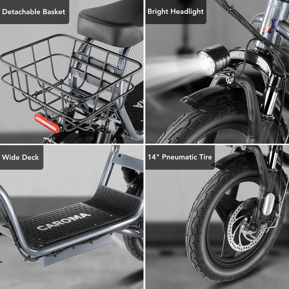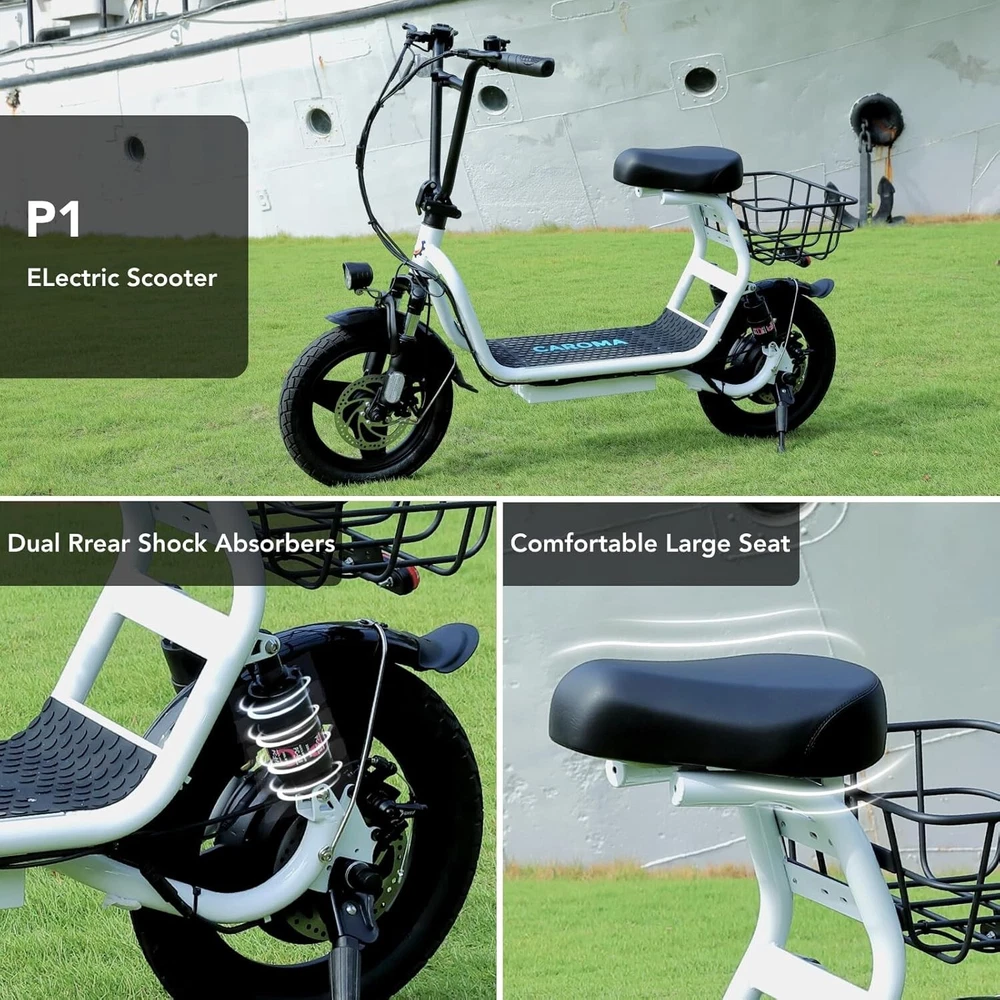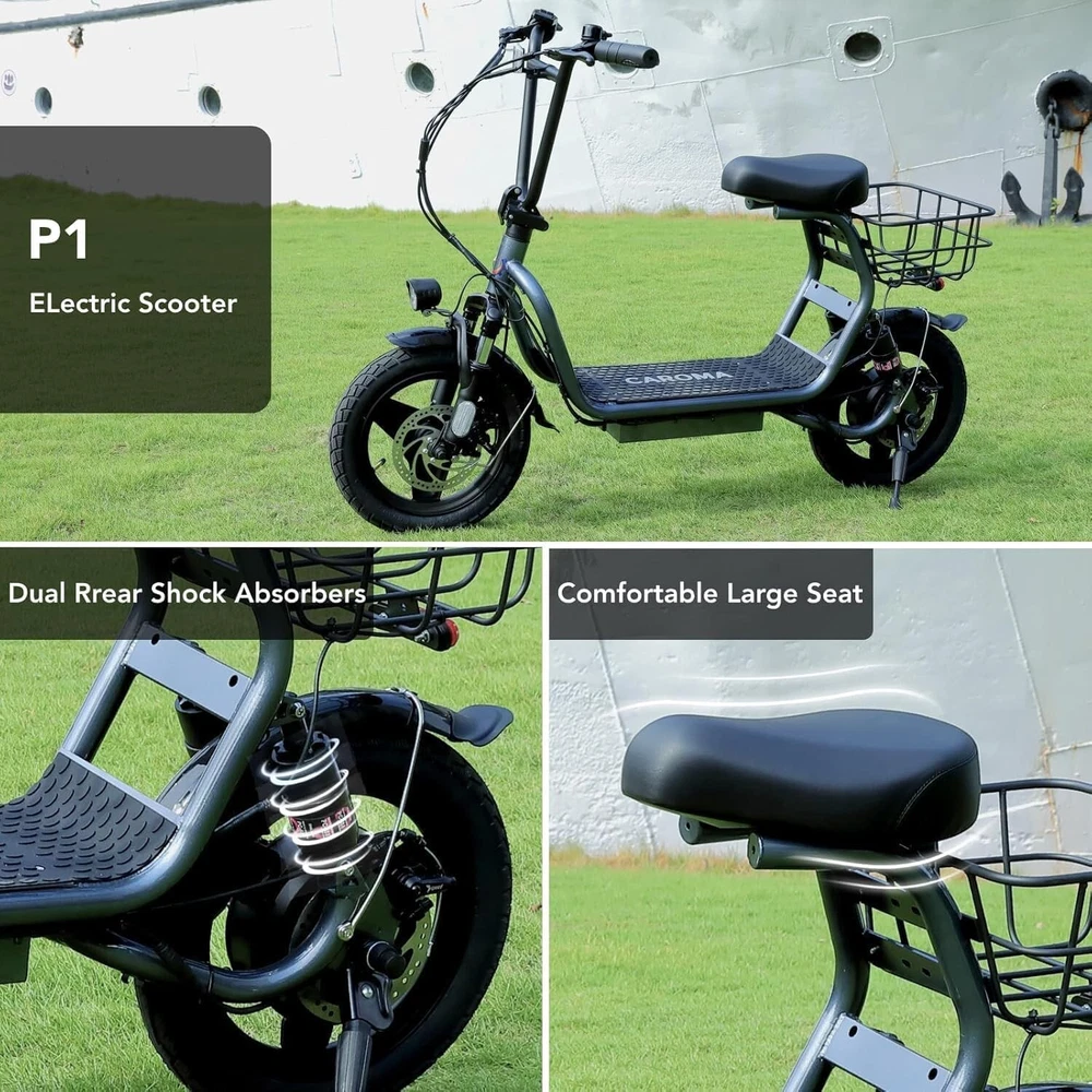 Product Description About this item 【1200W Electric Scooter & 48V 10Ah Battery】Caroma adult electric scooter comes with a 750W powerful motor(peak to 1200W) that delivers max speeds of up to 20 mph and a 20% hill grade climbing ability. The large capacity 48V lithium battery with regenerative braking gives you a range of up to 30 miles, which is ideal for anyone who wants to commute short distance for school or office and give the adults an active lifestyle. 【Multiple Suspension and 14" Fat Tires】The e scooter comes with multiple shock absorptions (front, rear suspension, and seat shock) that significantly reduce shock, making your ride more comfortable and stable. The 14" large pneumatic tires have excellent grip, high elasticity, and wear resistance. Meanwhile, this adult scooter comes with a large, soft seat and an extra-wide non-slip deck to make long rides a breeze. 【Foldable & Safe Electric Scooter Adults】This motorized scooter has folding design for increased portability and safety features like responsive and effective dual drum braking systems, bell, headlight and red tail-light, making it a portable electric scooter for commuting. It also has durable one-piece wheel hubs and a high-strength steel frame with a good weight capacity. The compact folded size makes it easy to store in car trunks and other tight spaces. (NOTE: Max load 300lbs) 【Smart Electric Scooter with Seat】 The Caroma P5 is an electric commuter scooter designed for adults. It has a basket above the rear wheels and can carry up to 30 pounds, making it ideal for quick errands and shopping. This electric scooter also features an LCD display that clearly shows the real-time power level of the ride. Meanwhile, the handle-mounted throttle allows you to control your riding speed easily and precisely. Electric Scooter with Seat & Basket The adult electric scooter is versatile and convenient, making it suitable for riders of different ages and experience levels.