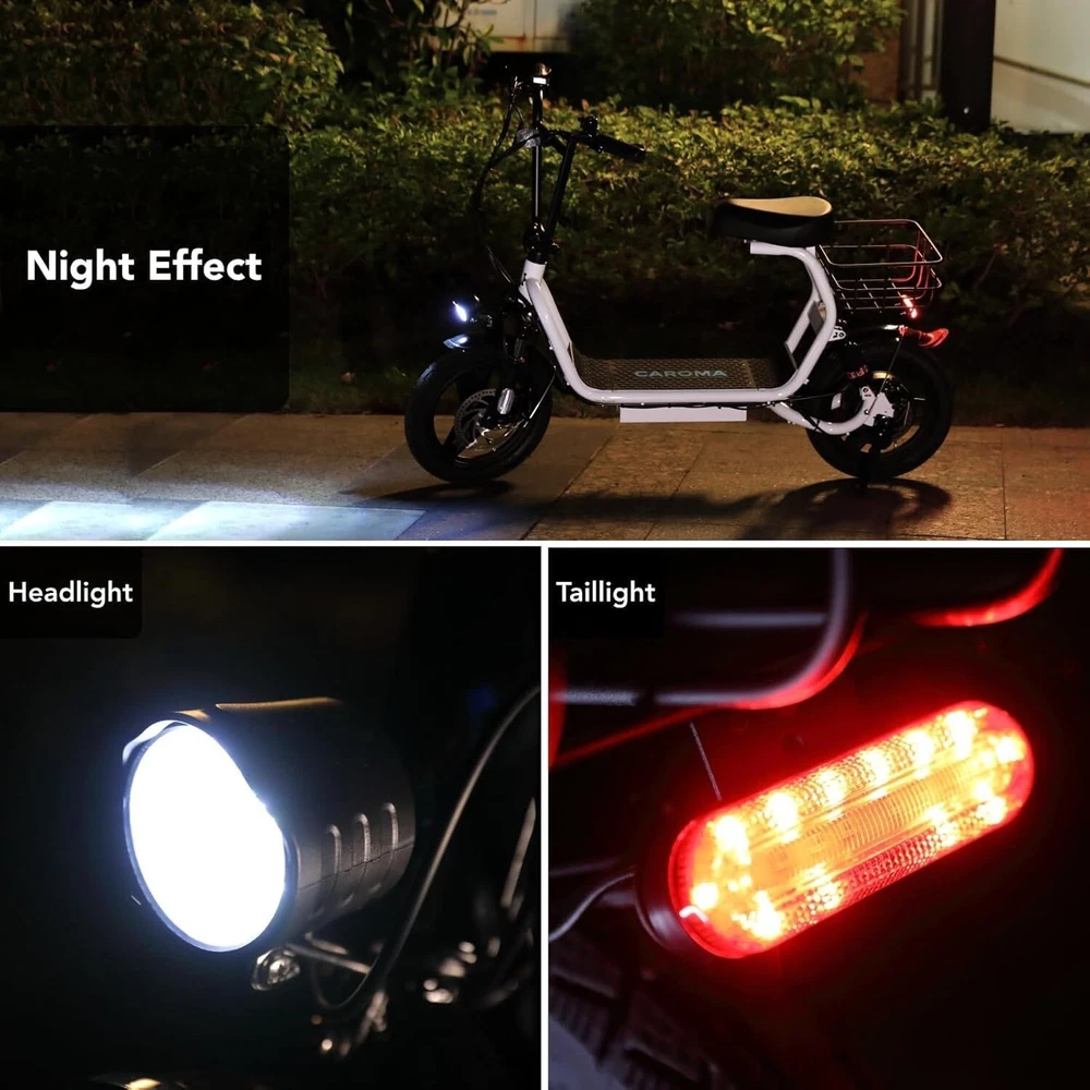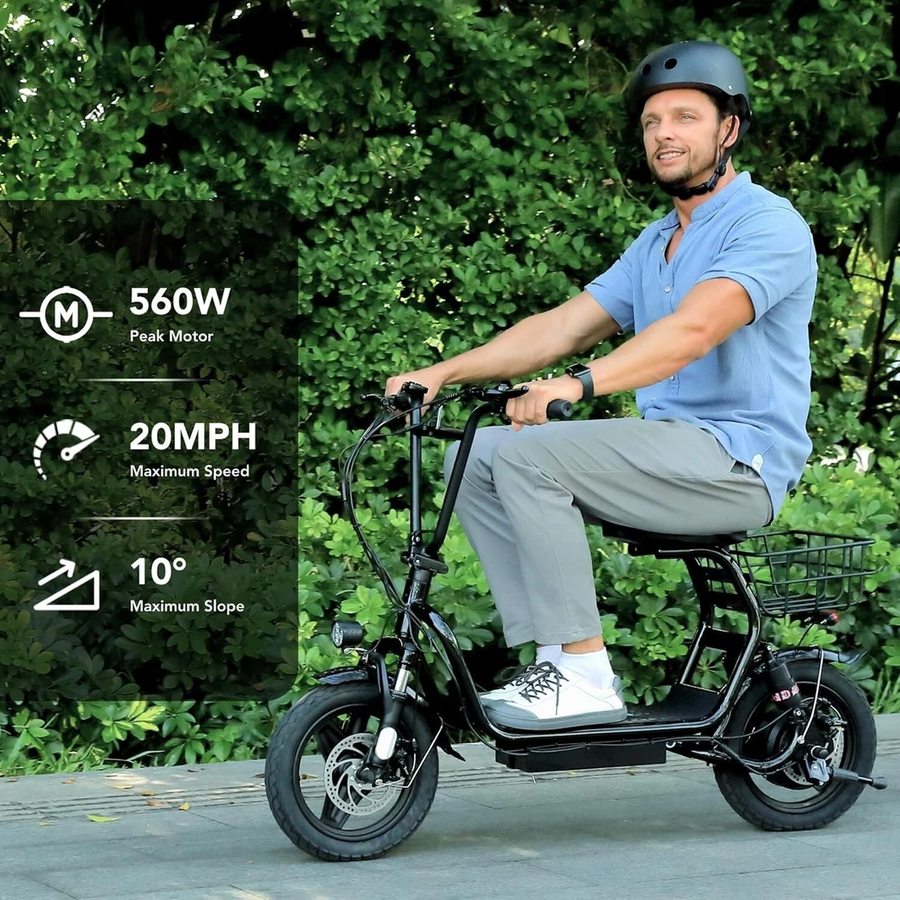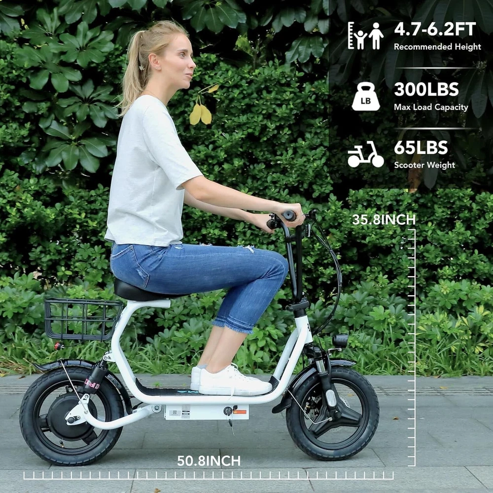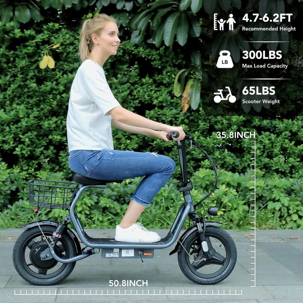 Product Description About this item 【1200W Electric Scooter & 48V 10Ah Battery】Caroma adult electric scooter comes with a 750W powerful motor(peak to 1200W) that delivers max speeds of up to 20 mph and a 20% hill grade climbing ability. The large capacity 48V lithium battery with regenerative braking gives you a range of up to 30 miles, which is ideal for anyone who wants to commute short distance for school or office and give the adults an active lifestyle. 【Multiple Suspension and 14" Fat Tires】The e scooter comes with multiple shock absorptions (front, rear suspension, and seat shock) that significantly reduce shock, making your ride more comfortable and stable. The 14" large pneumatic tires have excellent grip, high elasticity, and wear resistance. Meanwhile, this adult scooter comes with a large, soft seat and an extra-wide non-slip deck to make long rides a breeze. 【Foldable & Safe Electric Scooter Adults】This motorized scooter has folding design for increased portability and safety features like responsive and effective dual drum braking systems, bell, headlight and red tail-light, making it a portable electric scooter for commuting. It also has durable one-piece wheel hubs and a high-strength steel frame with a good weight capacity. The compact folded size makes it easy to store in car trunks and other tight spaces. (NOTE: Max load 300lbs) 【Smart Electric Scooter with Seat】 The Caroma P5 is an electric commuter scooter designed for adults. It has a basket above the rear wheels and can carry up to 30 pounds, making it ideal for quick errands and shopping. This electric scooter also features an LCD display that clearly shows the real-time power level of the ride. Meanwhile, the handle-mounted throttle allows you to control your riding speed easily and precisely. Electric Scooter with Seat & Basket The adult electric scooter is versatile and convenient, making it suitable for riders of different ages and experience levels.