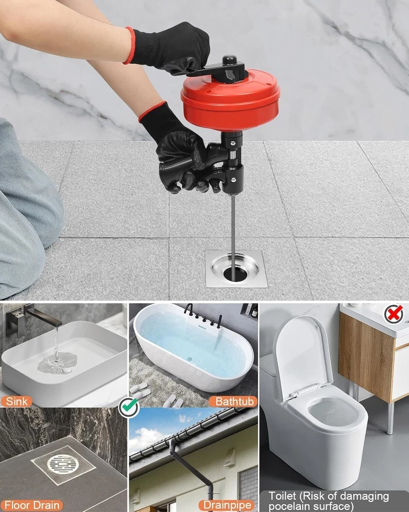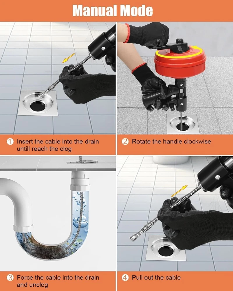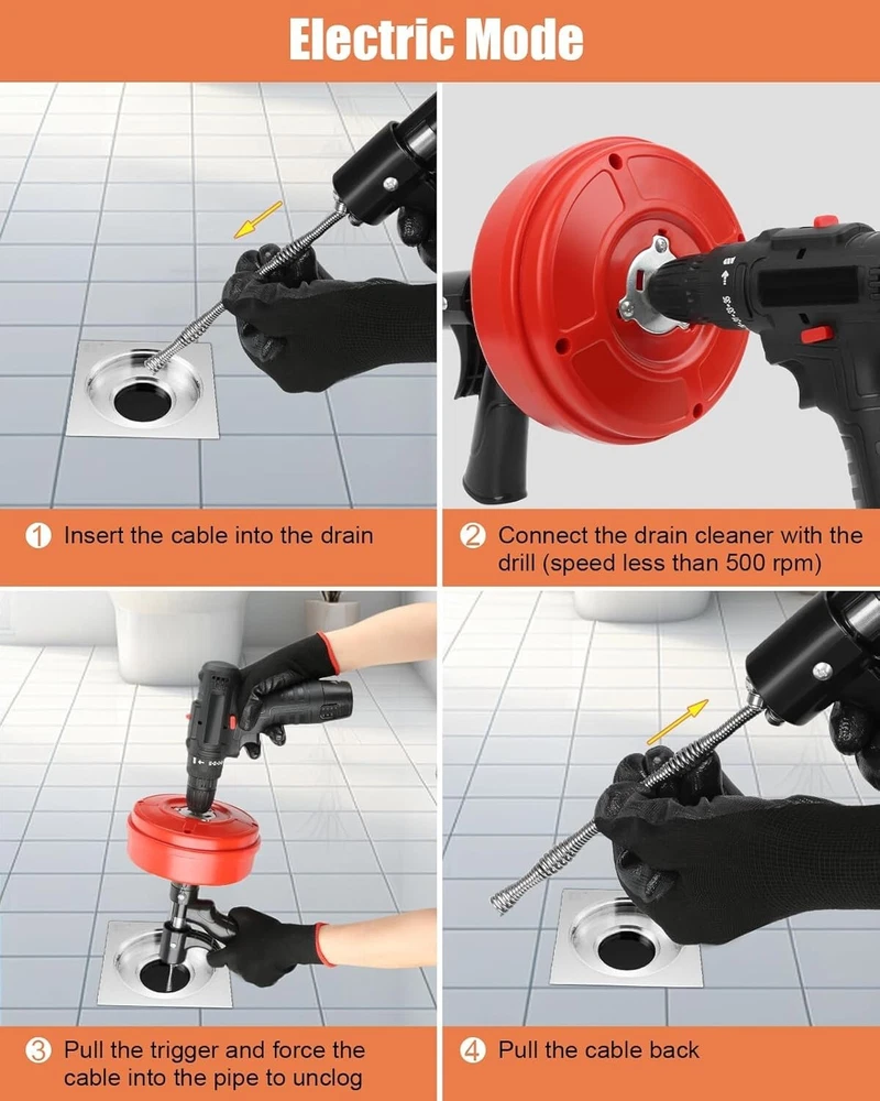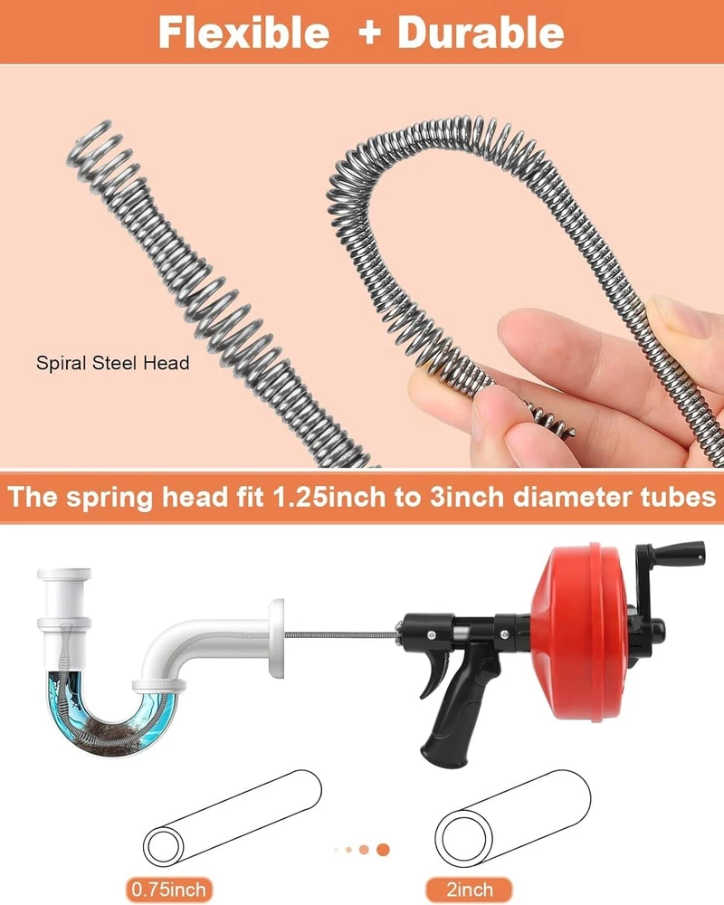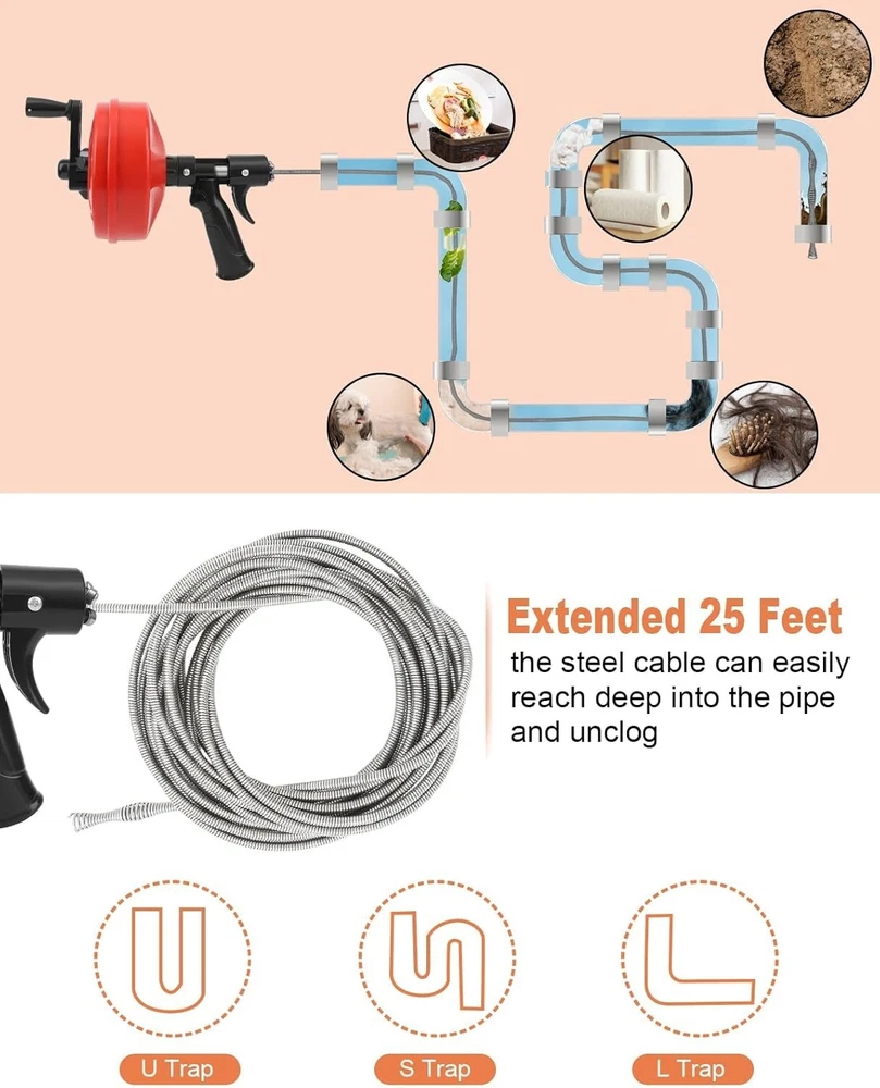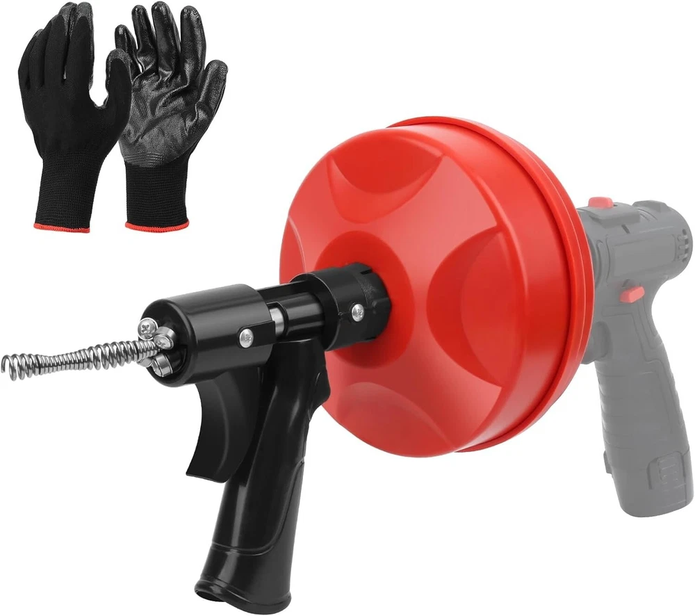 Multifunctional Drain Cleaner: Our plumbing snake drain auger is made for home use, it can quickly clearing debris from the most stubborn drains such as hair, food residue, toilet paper, grease, hair, and mineral blockage in sewers, floor drains, sinks, pipelines, bathtubs Manual or Powered Use: Our 25Ft. snake drain clog remover with drill attachment can be used manually or powered by an electric drill. Our drum auger fit with most electric drills, you simply attach the clog remover to the drill and start to unclog. (Please make sure its speed is lower than 500RPM) 1/4" Spiral Head: Designed for 1-1/4" to 3" diameter pipes, the 1/4" diameter steel snake with spiral head handles a range of drain sizes. Crafted for reliability, this tool helps prevent cable twisting or bending with a recommended usage distance within 4 inches of the drain opening Effortless Operation: Easily clear blockages by clockwise rotating the drum as indicated. Squeeze the trigger to advance the cable into the drain until you reach the blockage. If rotation halts, avoid simultaneous actions. Rotate without advancing or gently proceed to break the clog. After clearing, retract the cable by counterclockwise drum rotation while squeezing the trigger.(In addition, with this product, you family may save nearly $500 per year) Enhanced Design: Engineered with a robust ABS drum shell for lasting durability, this drain snake auger features an ergonomic pistol grip that allowing easy and comfortable use. Comes with a protective glove that offers an extra layer of safety, allowing you to confidently handle the tool while maintaining cleanliness