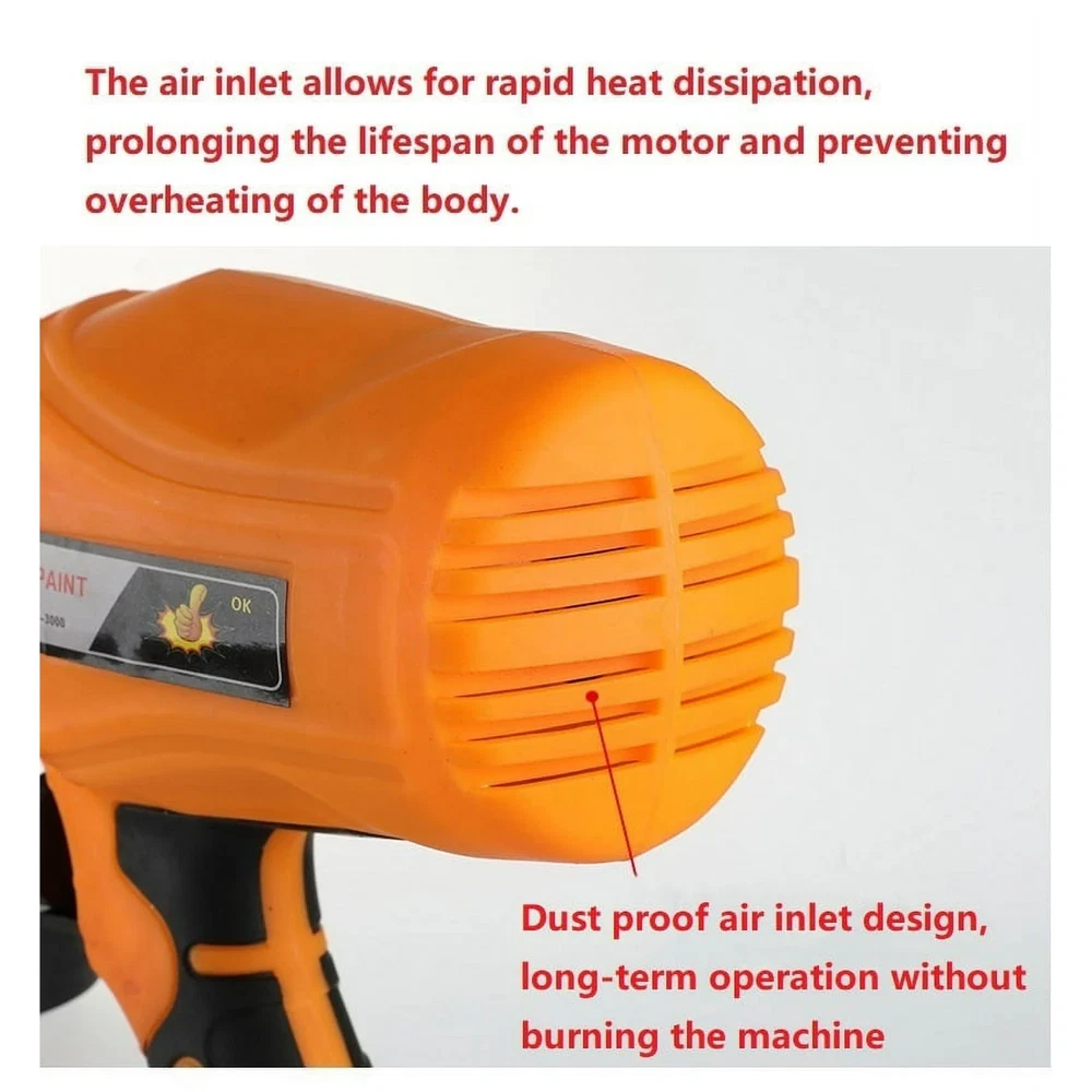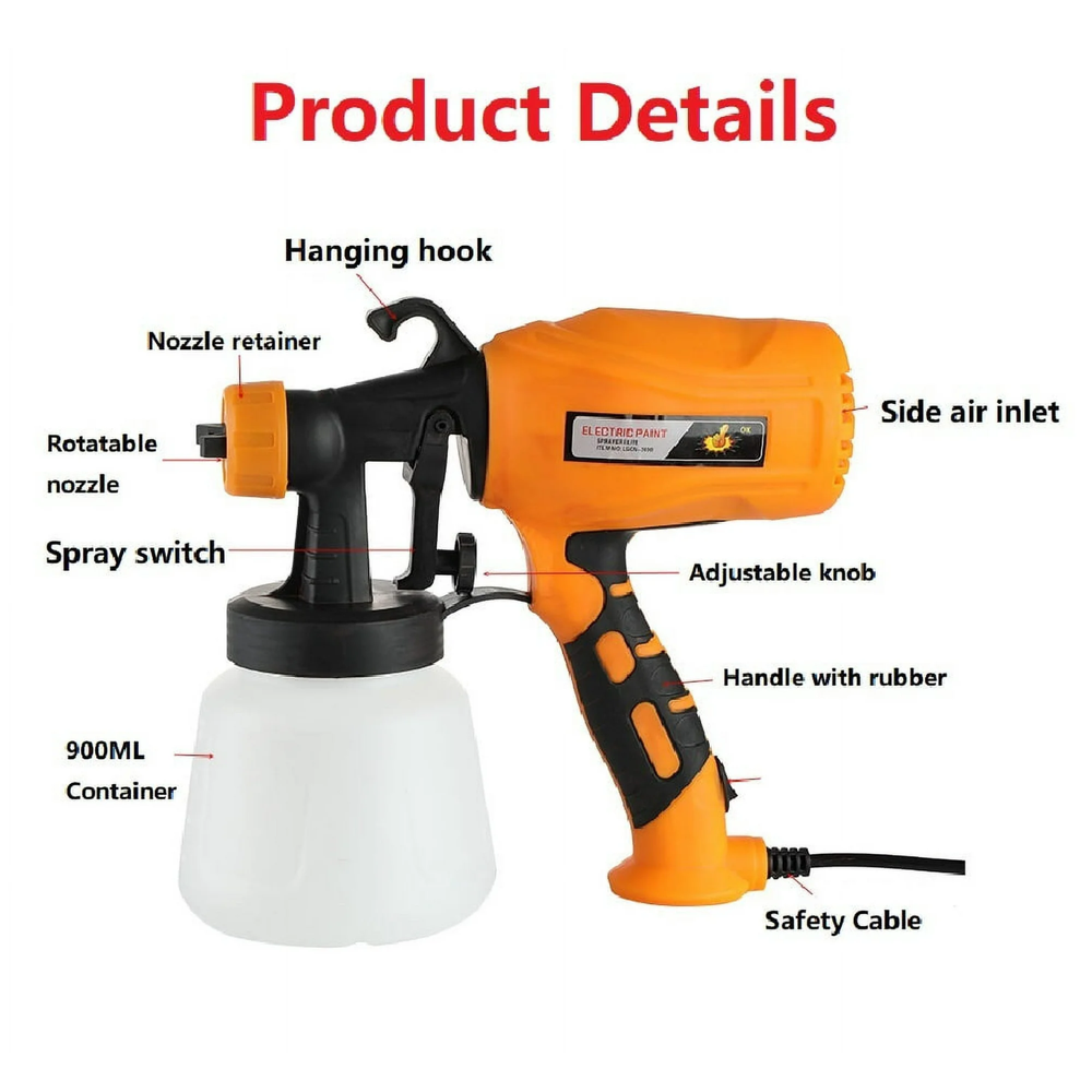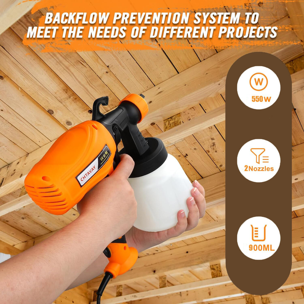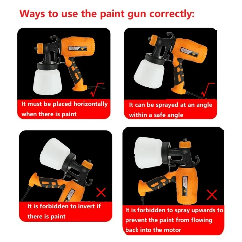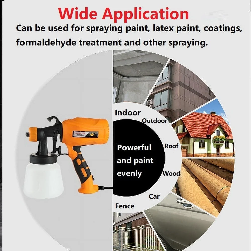 Descriptions: Advanced Technology & Careful Design:550W HVLP spray gun uses 900ml high capacity container to improve painting efficiency.The maximum viscosity has been upgraded and the spraying effect is also greatly improved, which can paint a smooth and superior finish. The output of the paint volume can be controlled by adjusting the flow control knob, which is suitable for different spray painted items and can spray where the roller can't reach. Upgraded Motor & High-Quality Materials:The motor uses a fuse with temperature protection. When a certain temperature is reached, the motor will automatically cut off the power supply to prolong the service life. Brass nozzles have superior performance than plastic nozzles, sturdy material, not easy to be clogged, and easy to clean. Double-layer insulation coat avoids any safety issues during operation. Dust Blowing Function & Easy to Clean:Before spraying,you can use the paint sprayer to blow away the dust/debris on the surface to get a better surface spraying effect. After painting, disassemble the motor part and soak and clean other accessories.It comes with a cleaning brush and a needle to unclog any hardened paint left in the nozzle part so that you can clean it easily and efficiently. Wide Range of Application Scenarios:550W paint sprayer equipped with 4 size nozzles for most painting projects,such as Fence,ceiling,walls,doors,garden tables and chairs etc .Can be adjusted to 3 different spray patterns:horizontal,vertical and circular,so that it can be applied to a wide range of application scenarios. Specification: Cable Length:1.7m Paint Spraying Volume:6.3(ml/s) Color:Orange Package List: 1x550W Paint Sprayer, 1x900ml Paint Container, 2xCopper Nozzles 1xFilter, 1xViscosity Cup, 1xCleaning Needle, 1xCleaning Brush 1xUser Manual