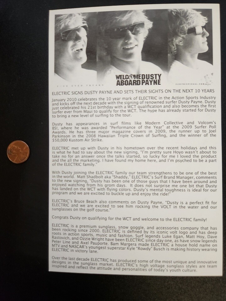 Home About Us view all listings contact us Shipping Menu Categories Snowboard / Skateboard / Ski / Surf Posters Random Nuggets Goggles Stickers Oakley Posters / Displays Vinyl CD's Oakley RX Frames Travel Bags / Backpacks Ladies Footwear Sunglasses Women Sunglasses Men Other Newsletter Add Sound Barrier to your Favorites and receive email newsletters about new items and special promotions. Sign Up Electric Visual 2010 Dusty Payne Surf Dealer Display Card Flawless New Old Stock Click Thumbnails to Enlarge Item description 100% original authentic Electric Visuals 2010 dealer promotional display card5.5"x8.5".Flawless NEW old stock mint condition. Photo shows front & back sides. Payment Shipping Returns About us Contact us Payment Credit Cards processed by PayPal Shipping MULTIPLE AUCTION WINS If you have won multiple auctions of mine PLEASE e-mail me before remitting payment so that i may combine items and re-calculate/adjust shipping charges. INTERNATIONAL BIDDERS "Import duties, taxes, and charges are NOT INCLUDED in the item price or shipping charges. These charges are the buyer's responsibility. Please check with your country's customs office to determine what these additional costs will be prior to bidding / buying. These charges are normally collected by the delivering freight (shipping) company or when you pick the item up – do not confuse them for additional shipping charges. We do not mark merchandise values below value or mark items as "gifts" – US and International government regulations prohibit such behavior." I ATTEMPT TO SHIP ITEMS SAME BUSINESS DAY THAT I RECEIVE PAYMENTS.I HAVE NO CONTROL OVER TRANSIT TIMES/CUSTOMS DELAYS.WE TAKE CARE OF BUSINESS CORRECTLY ON THIS END.APPRECIATE YOU UNDERSTANDING ALL THIS ON YOURS....THANX!! >>>PLEASE<<<....when sending payment via PAYPAL make sure that your address is in ENGLISH CHARACTERS.this is VERY important.otherwise,my shipping program will NOT recognize the jibberish and the whole process grinds to a halt while i attempt to contact you to get it straightened out. Returns 30 days money back or item exchange, buyer pays return shipping. About us Since 1985 we`ve been bustin` 30 footers, hustlin` and slingin` the goods in The Green Mountains.Keep your bloodshot eyes peeled as we are constantly adding freshly garnered gear! Contact us Click here to send us a question! Home About Us View all listings Contact us Shipping Copyright © 2018 Sound Barrier . All Rights Reserved. eBay Templates by OCDesignsOnline