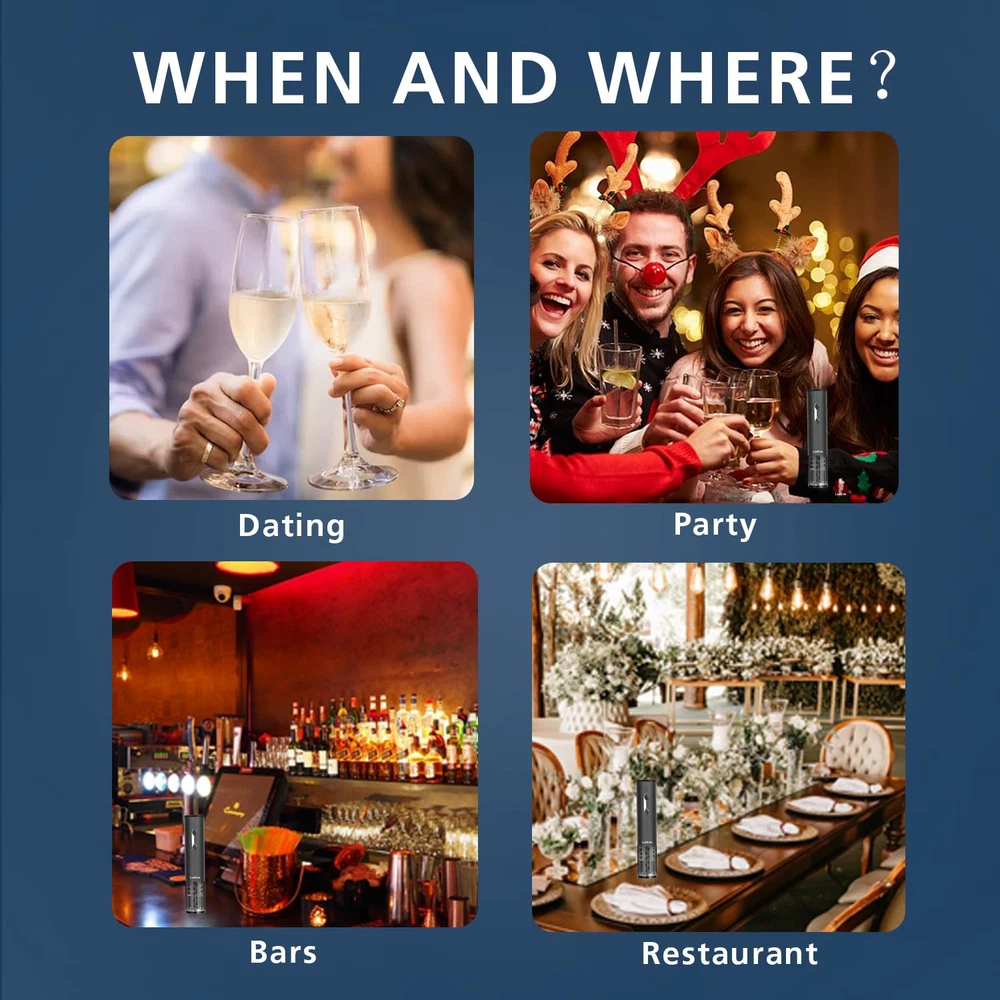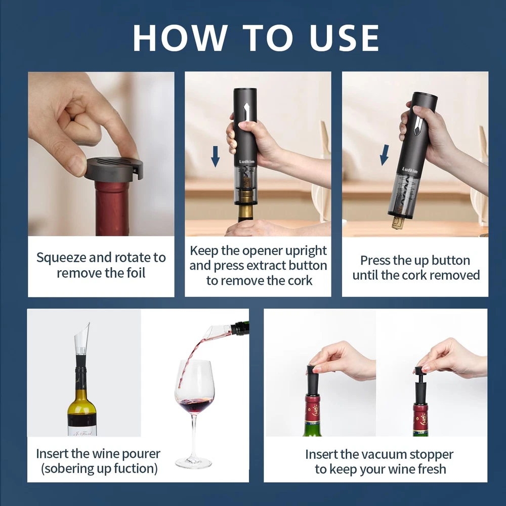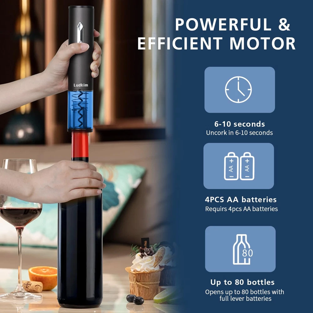 Exquisite All-In-One Set--has put together a surprisingly affordable set with this electric wine opener, which includes a foil cutter, wine pourer,and 2 vacuum stoppers. It’s a one-stop shop for your wine opening, pouring, and resealing needs Battery-operated Wine Openers --While this is a battery-powered device, four AA batteries (not included, sadly) will keep things going in 8 seconds and for 100 bottles. It offers the advantage of more bottle capability on one set of batteries and the ability to swap them out on the go Easy to Operated--Place the wine bottle opener, press the down arrow to remove the cork in just a few seconds, and then press the up arrow to release the cork from the screw. It features a see-through section that also allows you to see the cork as it’s removed Indulge In Premium Wine Goodness--With the aerator pourer, you can effectively infuse oxygen and achieve a more enhanced flavor profile while pouring, and can prevent dripping and control the flow. And 2 Vacuum Stoppers can keep most opened wine fresh for up to one week A Must Have Gift for Wine Lover--our automatic wine opener set is an ideal gift for friends and family on Christmas, Thanksgiving, birthdays, weddings, housewarmings, anniversaries and other special occasions