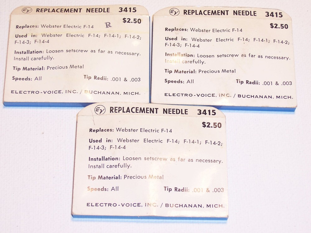 Electro-Voice 3415 Replaces Webster F-14 NOS Needle Stylus Qty. 3 FREE SHIPPING Brand new old stock condition. Please let us know if you have any questions. View more great items