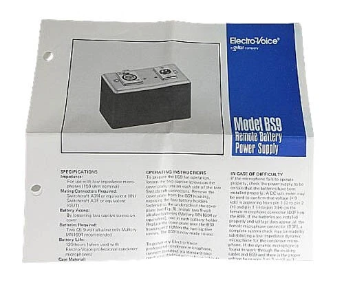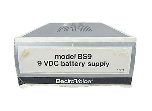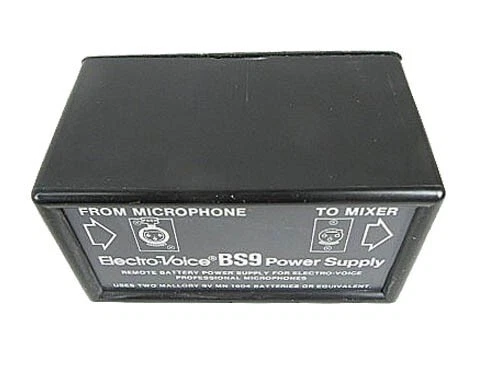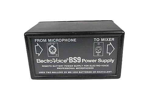 Electro-Voice Model BS9 Battery Power Supply - New Old Stock, Free Shipping The Electro-Voice BS9 is a battery operated remote power supply designed to power any Electro-Voice professional condenser microphone. The BS9 requires two standard 9-volt batteries (not included) for proper operation. The BS9 may be inserted in the microphone line anywhere between the microphone and the mixer input. The BS9 will work with any balanced or unbalanced low impedance input. A rugged steel box nested within a durable polypropylene case provides maximum protection from normal field abuse. This Electro-Voice BS9 remote power supply is new old stock and has been stored in our warehouse for 15+ years. It comes with its original box and data sheet. To install the 9V batteries, remove the two flat head screws on either side of the XLR connectors. We offer a 7 day guarantee on our equipment. If the unit does not work or quits within 7 days of receipt, we will repair or refund your money at our discretion. Free Shipping! (within the Continental United States only)