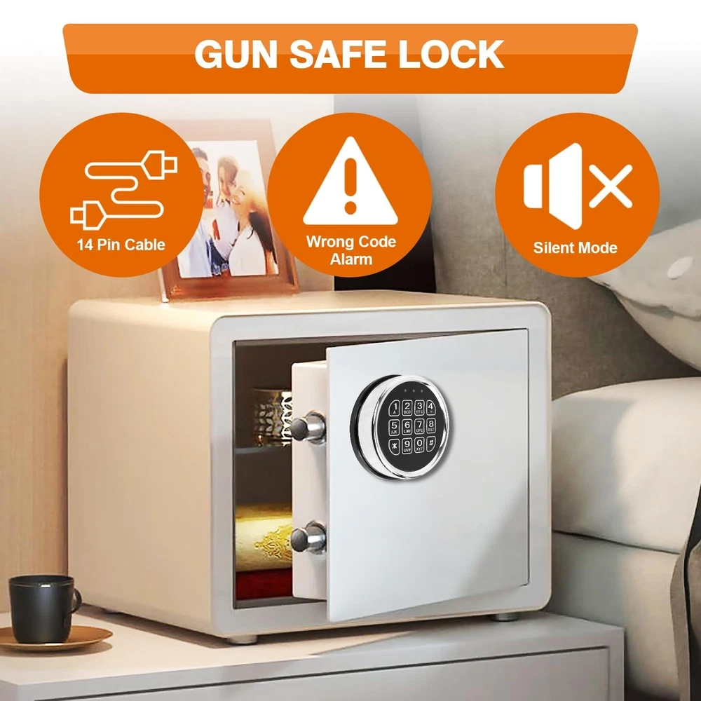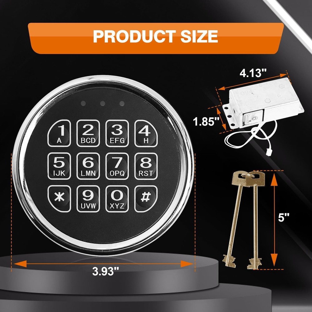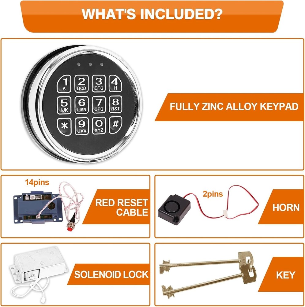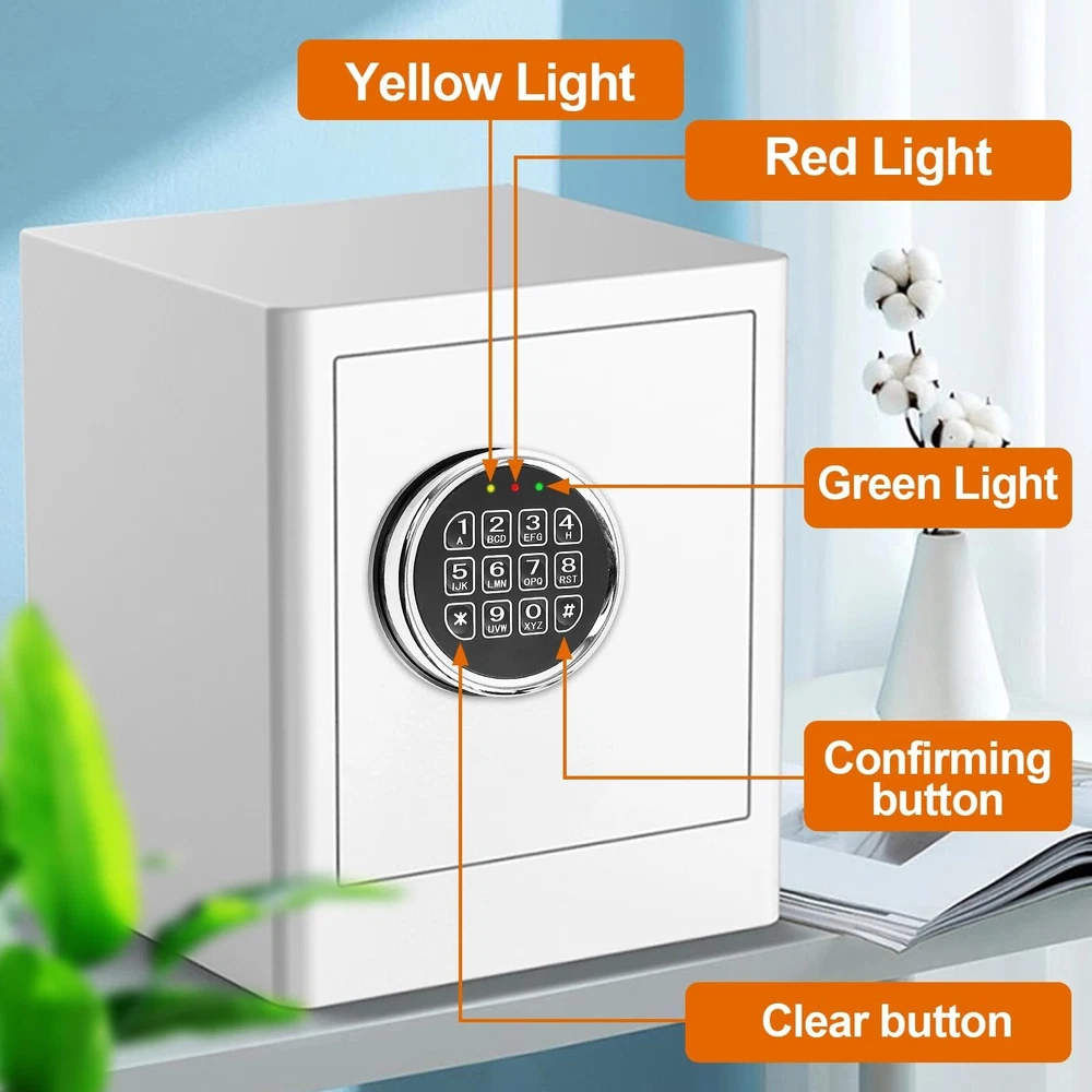 Electromagnetic lock includes 2 super control keys, 3-8 digital codes can be set, 3 different colors of lights indicate different states High-grade zinc alloy fireproof plate, surface electroplating treatment is not easy to rust, waterproof keys to provide protection Suitable for all kinds of home safes and lockboxes, hotel safes, cabinet safes, gun safes, pistol safes, etc Very easy to use, allows manual reset, ultra low power consumption one 9V battery lasts one year Note: This product does not include a battery, you need to purchase a 9v battery by yourself