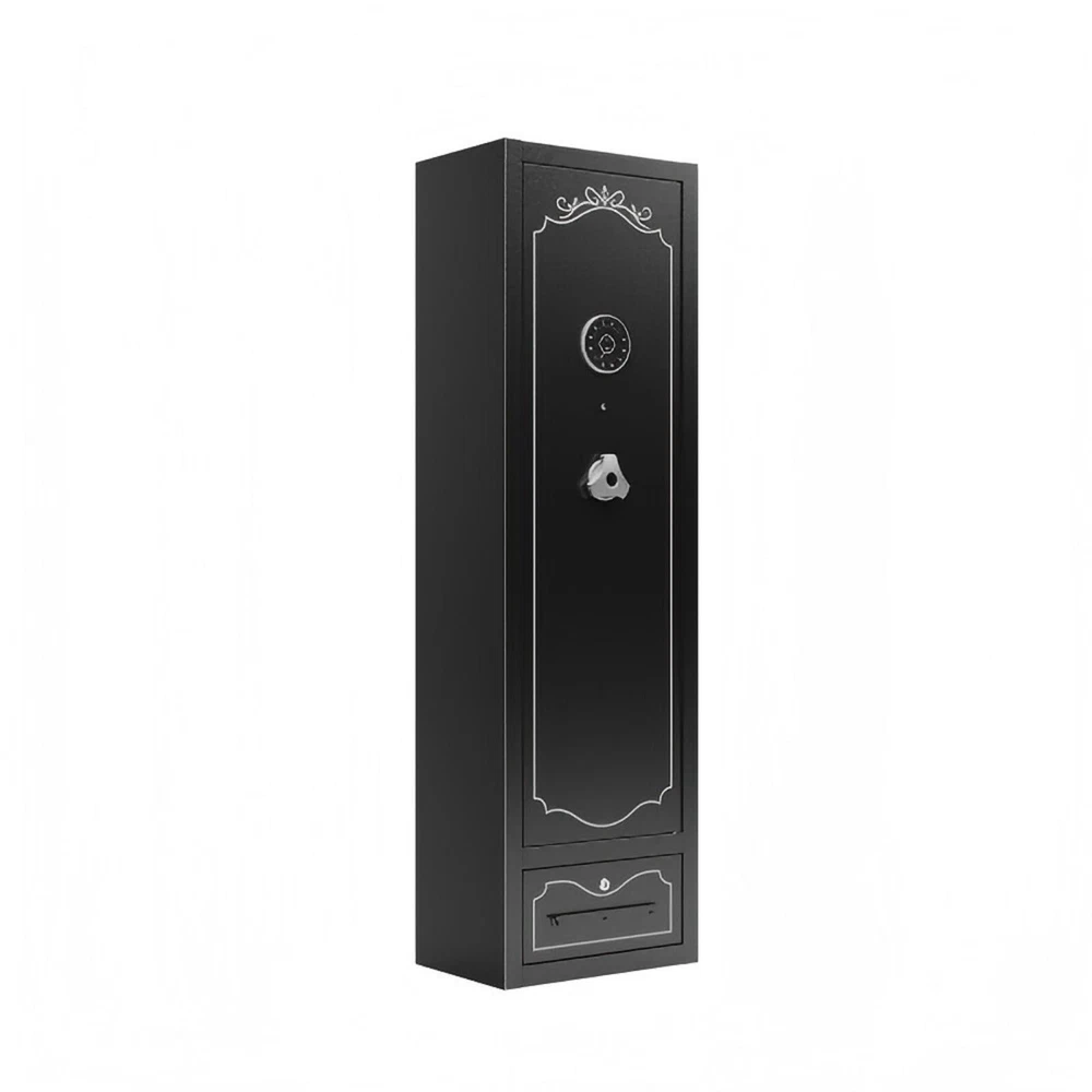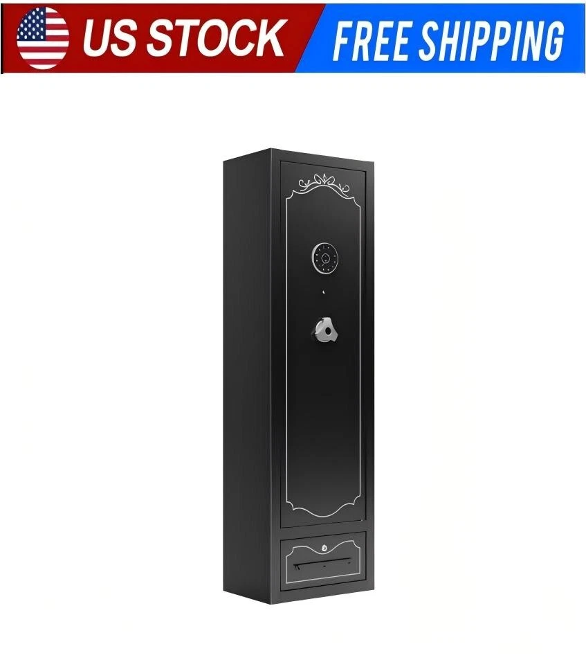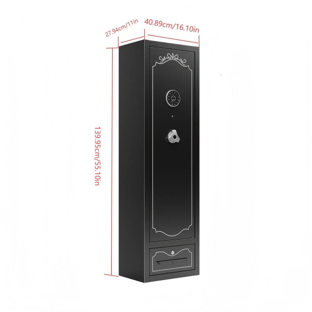 Dear customers, to celebrate the opening of our store, we will be launching the following promotional activities: 1. Customers who purchase all products in the store for over $50 can enjoy a 5% discount; 2. Each person can enjoy the right to use the coupon three times; Additionally, our store supports a 30 day return and exchange policy; 4. Some products are free of shipping. Wishing you a pleasant shopping experience~ Specification Product Information Product Type: General Item Product Name: 8 - Gun Capacity Rifle Safe. Holds Rifles, Pistols, Shotguns. Digital Lock for Quick Access. Removable Shelf. Special Gun Rack for Scoped Rifles. Plus, a Handy Storage Drawer Main Color: Black Main Material: Steel Product Dimensions Assembled Length (in.): 11.00 Assembled Width (in.): 16.10 Assembled Height (in.): 55.10 Weight (lbs.): 76.50 Package Size Length (in.): 18.50 Width (in.): 14.80 Height (in.): 57.90 Weight (lbs.): 90.00 Product Features Holds up to 8 rifles/shotguns, fits up to 48” long guns with/without scopes. The internal shelf is removable and flexible to adjust the space to fit different length guns. Constructed of 1.4 mm cold rolled steel plate, sturdy and durable. Bottom locking drawer, super convenient for storing cameras, documents, jewelry, bullets and other small items Support 3 - 8 digits password setting, two sets of password backup. Batteries are not afraid to run out, can be turned on with the key or external battery compartment. Built-in LED light, enter the code automatically light up, easy to get the gun at night. Supports silent mode, press the “11#” button to switch. Also equipped with 2 detachable gun racks