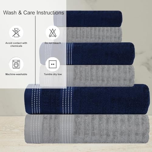 Return Policy Fast Delivery Trusted seller Elegance Collection Towels 550 GSM 2 Bath Towel 2 Hand Towel 2 Washcloths, Super Soft Egyptian Cotton 6 Towels Set for Bathroom, Kitchen & Shower - Navy Blue + Grey Product Description INGREDIENT: Set contains 2 Large Bath Towels of 27x54 Inches, 2 Large Hand Towels of 16x28 Inches, 2 Washcloths of 12x12 Inches. MATERIAL: Made of 100% cotton fabric and terry in nature provides excellent absorbency quality. TEXTURE: Our Towels are 550 GSM, made from natural materials which is safe for you and your family. Available in Six beautiful colours combinations to go with the décor of your home, spa, or gym. FUNCTION: Highly absorbent, yet light-weighted. Gives the body a soft, plush and fluffy feel while absorbing the moisture. CARE TIPS: The Towels are machine washable. Wash the towels in cold water before use. This will cause the cotton fibres to open up and give the towels better absorbency. Always wash towels separately from all other items of clothing to decrease transfer of towel lint to other clothing. Hang them up afterward in an area with good air or in direct sunlight. Shipping Returns Payment Shipping Shipping is FREE to all addresses other than APO/PO boxes in the lower 48 states. All our stock ships from US-based warehouses. Shipped via USPS or UPS (depending on location and package weight) Unless stated otherwise, all orders will ship within 24-72 hours of your payment being processed. Check our feedback to see the great reviews of FAST shipping we offer. Returns Seller does not accept returns Payment We currently accept payment via eBay managed payments only. Once payment is cleared, we will dispatch your shipment within 1-3 business days. Please refer to the "Shipping" tab for more information regarding shipping speed to your destination.