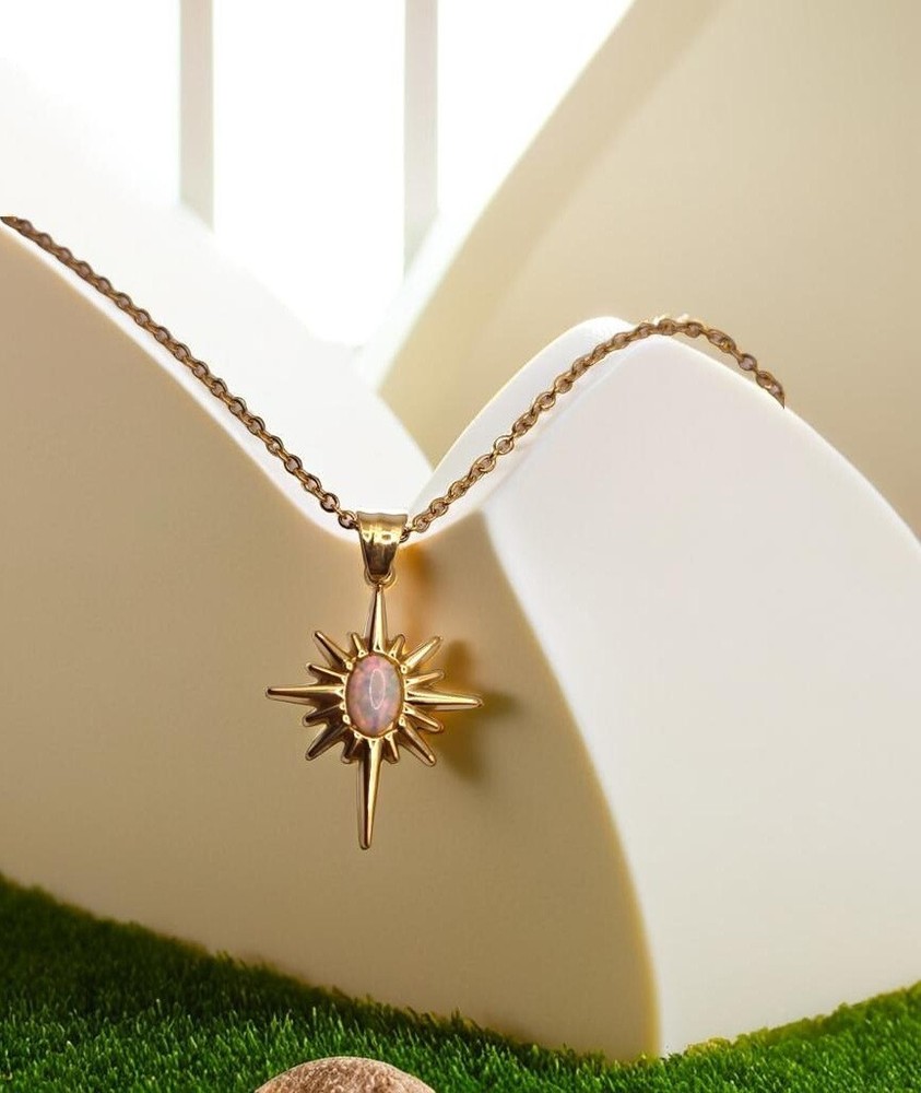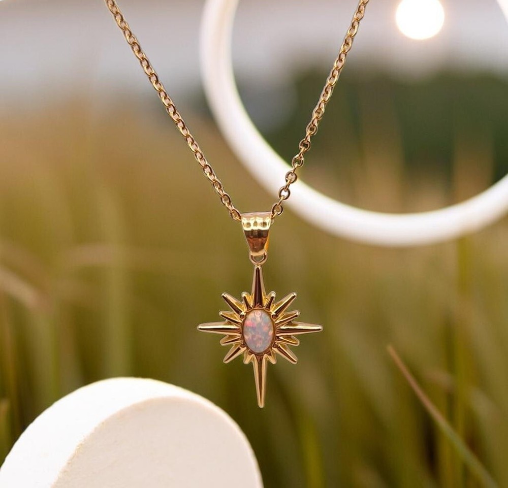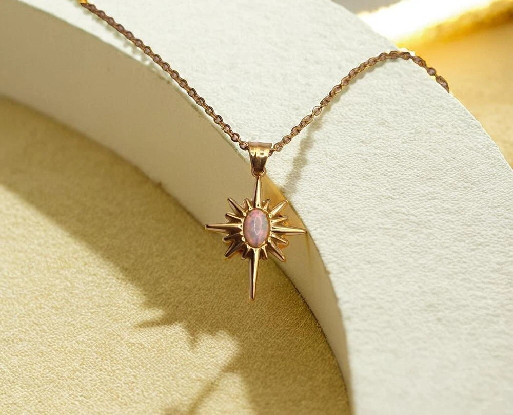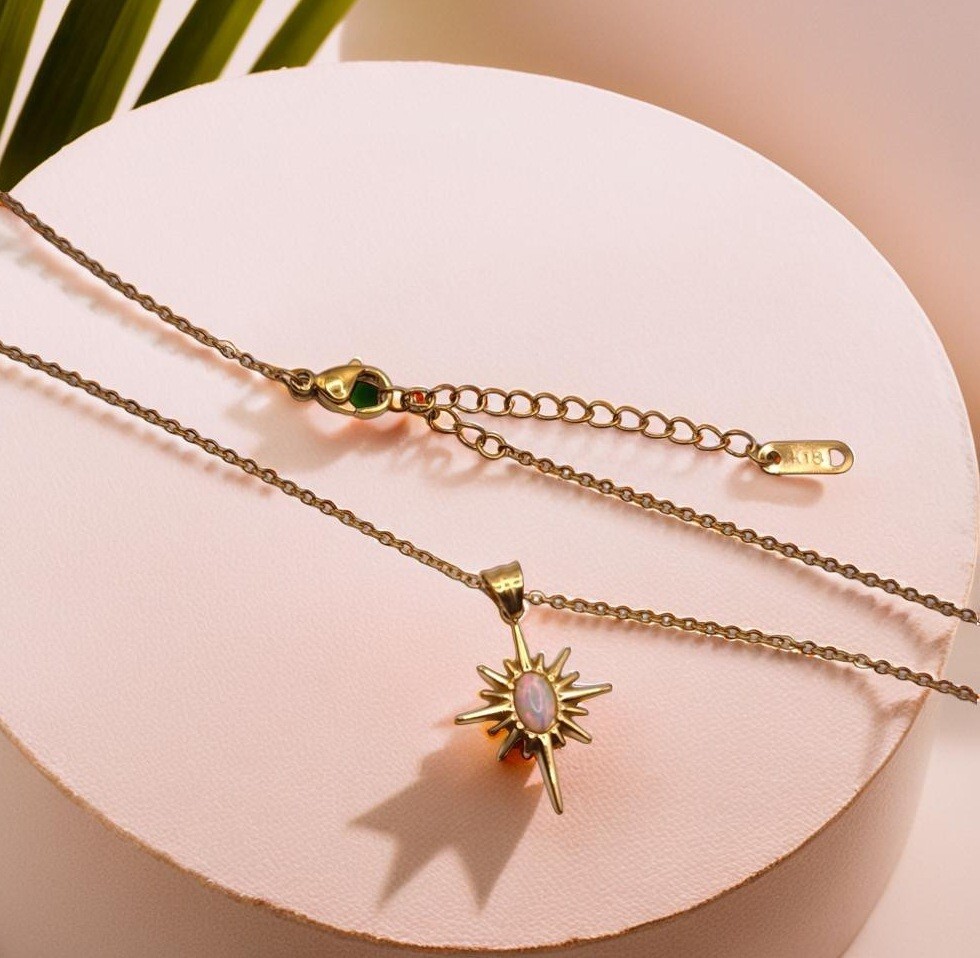Embrace the elegance of the 18K gold opal star necklace, where sophistication meets celestial charm. The necklace features a dazzling starburst pendant embellished with vibrant pearl opal, offering a serene and radiant glow. With a 45cm chain that is both stackable and adjustable, you can effortlessly customize the length to suit your style. Ideal for adding a touch of clarity and tranquillity to any outfit, this necklace is a perfect gift for her, whether for a milestone celebration or a thoughtful gesture. Its classic design and enchanting sparkle ensure it will be a cherished piece for years to come.