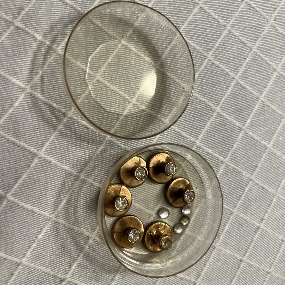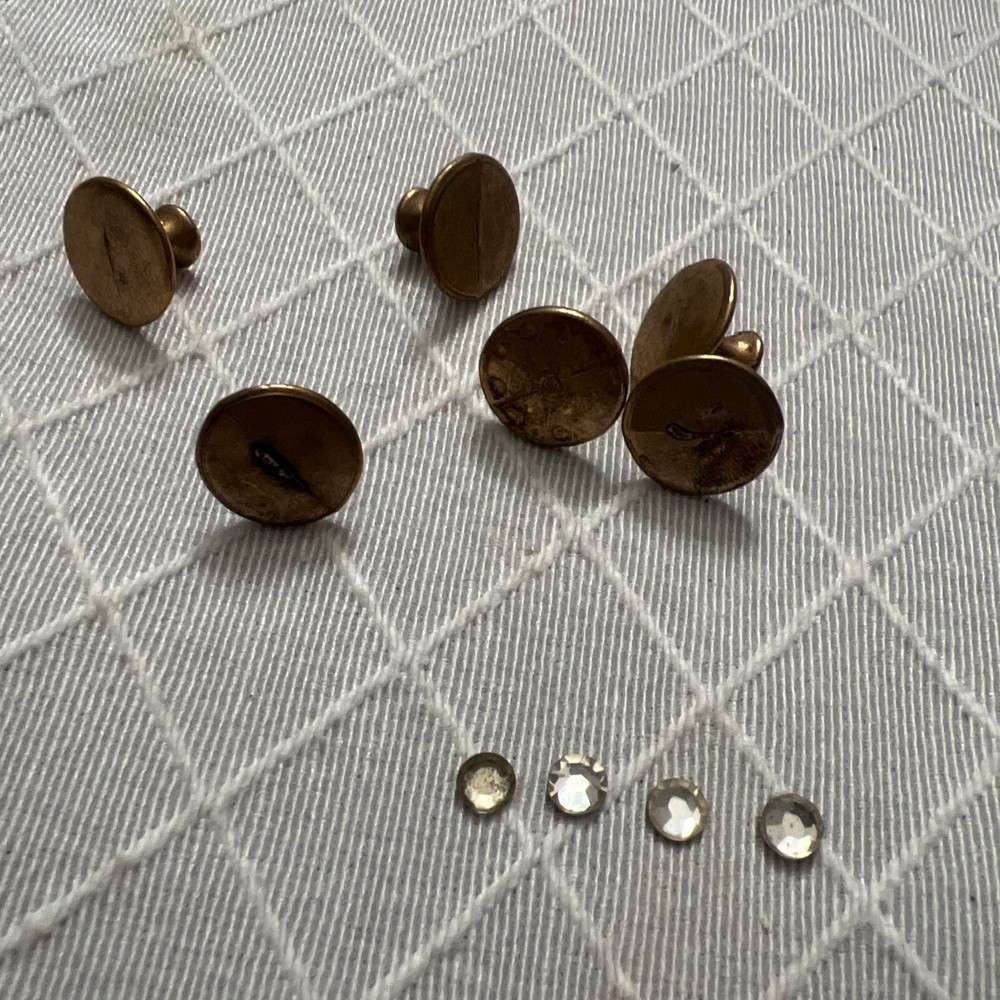 This vintage jewelry set includes 8 tuxedo buttons and cuff links made of goldtone brass with white round rhinestones. The set also comes with 3 extra rhinestones. The cuff links and buttons are designed for men and have a classic style, making them suitable for formal occasions. The pieces are crafted from brass with rhinestones, giving them a luxurious and elegant appearance. Perfect for adding a touch of sophistication to any tuxedo ensemble.