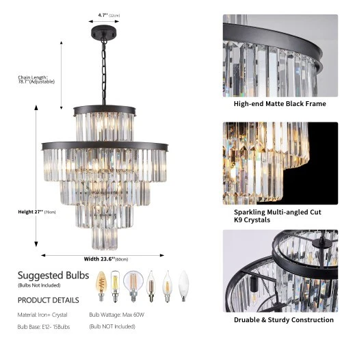 Description 23.6 Inches Black Luxury Crystal Chandelier:Composed of premium K9 crystals and black finish metal base, clear crystal prisms on large round iron chrome finished frames. Total of 5-tier sparkling crystals. Luxurious and contemporary design, perfect for home decor which will make your house look stunning. Size : Width 23.6" x Height 27.6" .Please ensure dimensions of this crystal chandelier light fixture is fit for your prepared space or not. Bulb Requirement:This crystal pendant light need 15 x E12 bulbs (Max 60-watt, This product does not contain a light source) .Ideal Indoor Decoration: This Modern luxury style chandelier is perfect for wide application, kitchen island, living room, dining room, enterway, hallway, foyer, corridor, stairway, bars, cafes, hotels, and restaurants, etc. Features Shine Bright Like a Diamond:selected the TOP K9 crystal and the highest standards in the industry have been adopted from the manufacturing stage. Modern Crystal Chandelier with finished is a beautiful piece. With its sophisticated beauty and stunning details will fits your every space. E12 Bulb*15 Required Chandeliers: compatible with E12 LED bulb, Incandescent, energy-saving, halogen, etc. The brightness depends on the bulb you put in, if you want brighter light, please use high-watt E12 bulb(60w max),The chandelier it’s compatible with dimmable bulbs and wall switch. Chandelier Light Fixture Size: Crystal chandeliers with 23.6 inches wide and 27.6 inches high. Please check the size of the chandelier lighting fixture before purchasing. Simple Assemble: Crystals come in 1 sizes, each crystal strand needs to be hanged one by one. When the chandelier lights up for a moment, everything is worthwhile all the effort will be transformed into your smile. Suggested Space Fit: Securely wrapped crystal high ceiling light fixture. light up your Living Room, Dining Room, Porch, Staircase, Foyer, Hallway, add some elegance to your home with this crystal chandelier ceiling light.