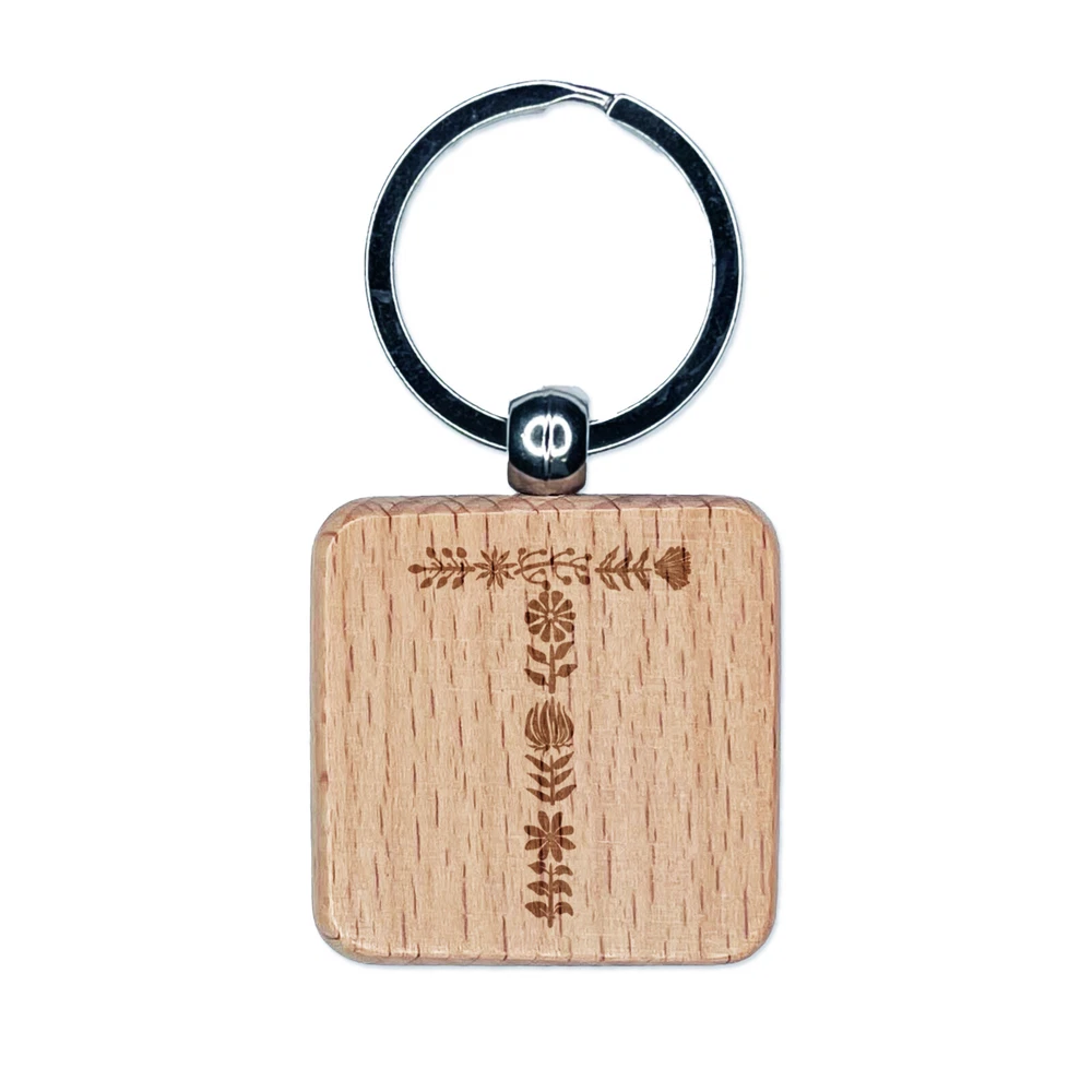 Elegant Botanical Floral Letter T Engraved Wood Square Keychain Tag Charm