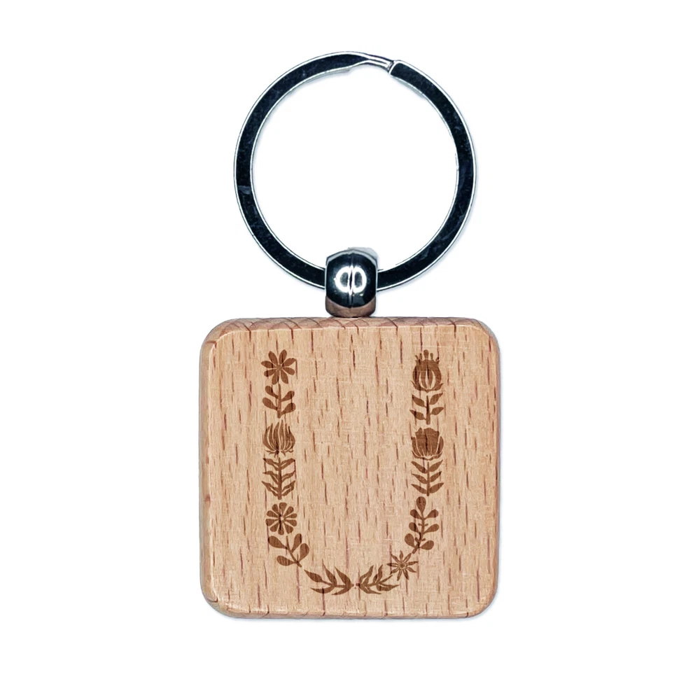Elegant Botanical Floral Letter U Engraved Wood Square Keychain Tag Charm