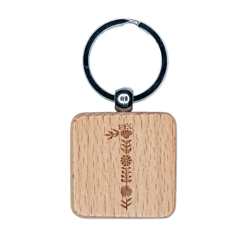 Elegant Botanical Floral Number 1 Engraved Wood Square Keychain Tag Charm