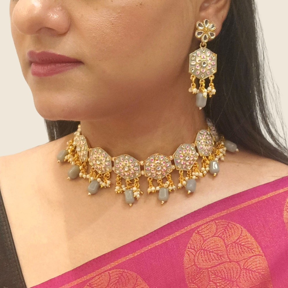 Elegant Efulgenz Meenakari Choker Set with Crystal Kundan and Faux Pearls