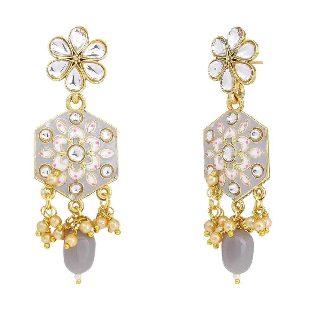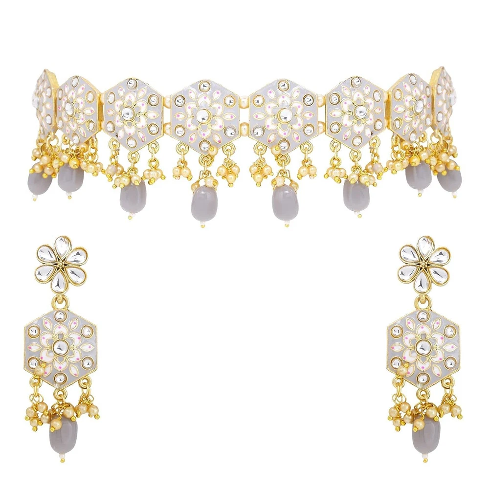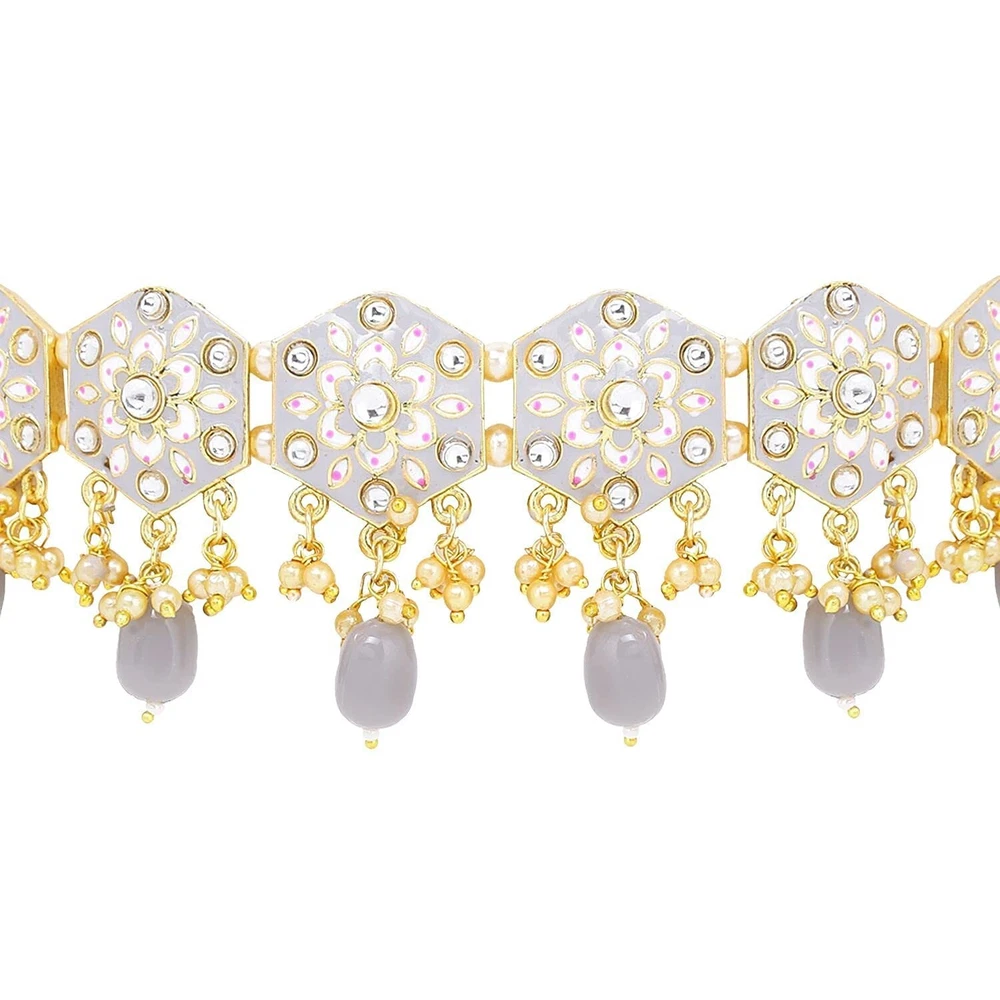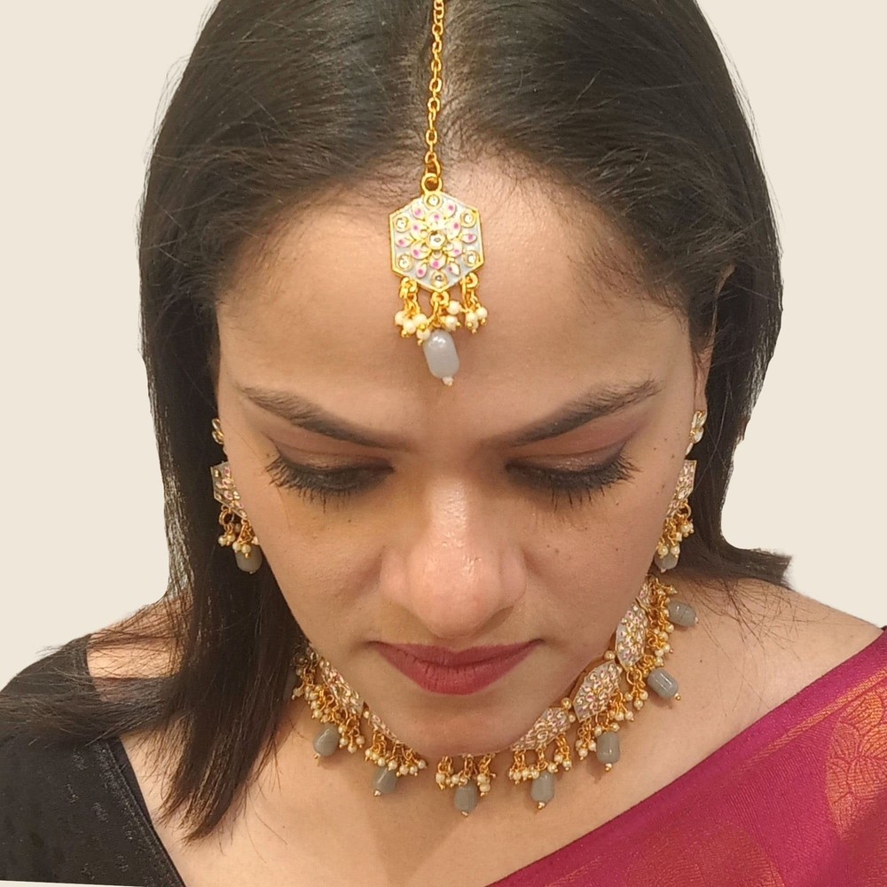 Efulgenz Meenakari Choker Set Indian Jewelry Crystal Kundan Faux Pearl Choker Necklace Earrings Maang Tikka Wedding Bollywood Bridal Jewelry Set for Women Product Details Color: Grey Brand: Efulgenz MPN: MNT1560_Color UPC: Does not apply EAN: Does not apply Department ‏ : ‎ womens Date First Available ‏ : ‎ May 24, 2024 Manufacturer ‏ : ‎ Jaipur Art Jewellery Brand, Seller, or Collection Name: Efulgenz Metal stamp: Copper Metal: alloy Material: Copper Gem Type: No Gemstone Item Length: 14 inches Chain: Bead Clasp: Adjustable Drawstring Model number: MNT1560_Color Surface markings and blemishes: Clean Traditional, vintage, boho, ethnic, elegant statement gold plated chocker necklace earrings maangtikka head chain fashion novelty wedding bridal jewelry set costume accessories for women, brides and bridesmaid. Delicate eye catching classic unique exotic jwellery. Traditional Royal Setting Style of jewellery. Embellished with enamel/ meenakari, rhinestones, kundan, crystals, beads, stones and faux pearls. Skin Friendly, environmental friendly. Wear this with your gorgeous traditional dress, saree, lehenga, gown on any wedding, party, engagement, ring ceremony,anniversary or any festive or special occasion. CARE INSTRUCTIONS: Avoid contact with heat, chemicals and water. Clean with dry cotton cloth. Pack in an air tight container/ pouch after use. It is advisable to wear the jewellery after makeup.