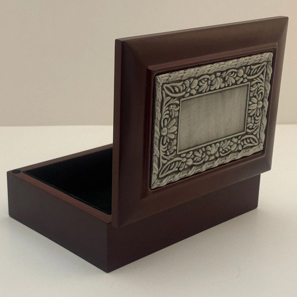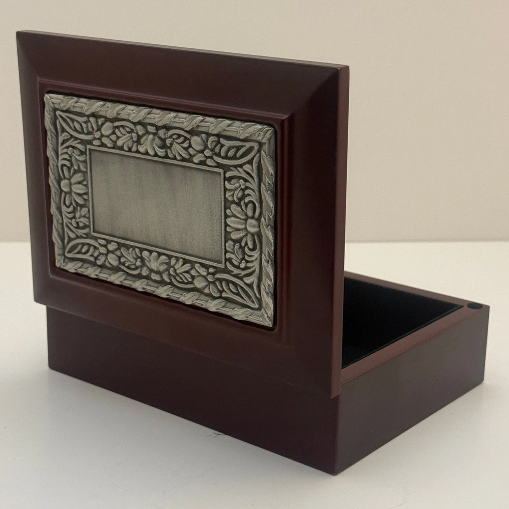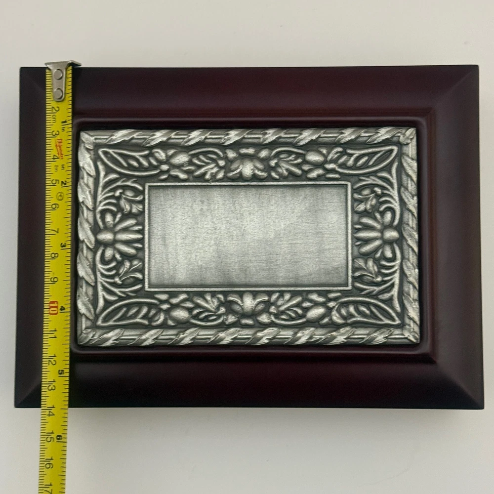 Wooden Jewelry Box with Floral Metal Inlay – 7.5 x 5.5 x 2 inches. Pre-owned item in good condition. The wooden box shows some scratches on the bottom from previous use, but the exterior and floral metal inlay are well-maintained. The velvet interior remains in good condition. Ideal for storing jewelry or trinkets, this box is both functional and stylish. Please refer to the photos for a closer look at its condition. The pictures are of the exact item you will receive. Please check the photos for more details. Please note that this item might have a slight smell of smoke due to storage and the cardboard box used for shipping. We take great care in cleaning and carefully packing the item to minimize any potential odors. Additionally, we prioritize fast shipping to ensure the item arrives quickly and in excellent condition. If you have any concerns, feel free to contact us before purchasing. Thank you for your understanding!