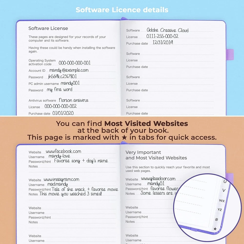Elegant Password Keeper with Thick Paper - Lavender Internet Address Organizer ‹ › ‹ › ‹ › ‹ › ‹ › ‹ › ‹ › ‹ › Elegant Password Keeper with Thick Paper - Lavender Internet Address Organizer -Never forget a password again with the password journal -Alphabetical A-Z tabs for easy organization -Sections for important passwords, wireless & email settings, software license information, and additional notes -Elegant, smart, practical, and secure password organization -Large size (7x10 inches) with premium quality eco-leather hardcover -Features elastic band, pen loop, bookmark, pocket for notes, and thick 120gsm paper -60-day money-back guarantee for customer satisfaction Benefits: Organize and secure all your passwords in one place Easy to find passwords with alphabetical tabs Anonymous cover design for added security Large size for ample writing space High-quality materials for durability Money-back guarantee for peace of mind Why choose our Password Keeper? Are you tired of forgetting passwords and struggling to keep them secure? Our Elegant Password Keeper is the perfect solution for you. With its alphabetical tabs, sections for different types of passwords, and convenient features like the pen loop and bookmark, organizing your passwords has never been easier. The anonymous cover design adds an extra layer of security, and the large size and premium quality ensure a luxurious and practical experience. Don't settle for disorganized passwords - invest in our Password Keeper and enjoy peace of mind knowing your information is safe and easily accessible. Shipping Free & Fast Shipping - We offer free shipping to most of the USA with a normal delivery time of 3-7 days. However, due to the current situation, additional delivery time (up to 3 weeks) may be required for some items. Alternative Carriers - We may use alternative carriers (e.g. USPS, FedEx, UPS, etc.) to ensure your package arrives safely and on time. Due to the use of multiple carriers, we are unable to provide a tracking number automatically. Handling Time - Orders are processed and shipped within 1-2 business days of receiving cleared payment. Shipping Restrictions - Shipping to Alaska, Hawaii, Puerto Rico, Guam, and other US territories may incur shipping charges or delivery restrictions. Please contact us before ordering, or your order can be refunded/cancelled. State Restrictions - There may be restrictions based on your state of purchase. For example, certain items may not be shipped to California due to state regulations. Contact for Tracking Updates - If you require tracking updates or have any concerns about the delivery of your order, please feel free to contact us, and we will be happy to assist you. Return 30-Day Hassle-Free Returns - We want you to be completely satisfied with your purchase. If you are not, you can return the item within 30 days of receiving it for a full refund or exchange. Easy Return Process - To start a return, simply contact us and we will provide you with a prepaid return shipping label and detailed instructions. Restocking Fee - There are no restocking fees for returns. However, the buyer is responsible for return shipping costs if the return is not due to a seller's error. Refund Processing Time - Refunds will be processed within 5 business days of receiving the returned item in its original condition. Payment We accept all major credit cards, PayPal, and Apple Pay for your convenience. Your payment information is secure and encrypted to ensure a safe and seamless transaction. Please complete your payment within 3 days of purchase to avoid any delays in shipping. Feedback Your feedback is extremely important to us. We strive to provide the best products and customer service possible. If you are satisfied with your purchase, please take a moment to leave us a positive review. If you have any concerns or issues with your order, please contact us before leaving negative feedback. We are committed to resolving any problems and ensuring your satisfaction. Contact Us If you have any questions or concerns, please feel free to reach out to our customer support team. You can contact us through the eBay messaging system. We are available Monday to Friday, 9:00 am to 5:00 pm EST, and we will do our best to respond to your inquiry within 24 hours. Thank you for supporting our small family business! Item Height: Password Book with Alphabetical Tabs Item Length: Password Book with Alphabetical Tabs Item Weight: 1.33 pounds Item Width: Password Book with Alphabetical Tabs Number of Pages: Not specified Unit Quantity: Single Author: Password Book with Alphabetical Tabs Subject: Password Book with Alphabetical Tabs Subject Area: Password Book with Alphabetical Tabs Format: Book Level: Password Book with Alphabetical Tabs Language: Password Book with Alphabetical Tabs Educational Level: Password Book with Alphabetical Tabs Features: Password Book with Alphabetical Tabs MPN: Password_Book_with_Alphabetical_Tabs Type: Password Book with Alphabetical Tabs Publication Name: Password Book with Alphabetical Tabs Publisher: Password Book with Alphabetical Tabs Series: Password Book with Alphabetical Tabs