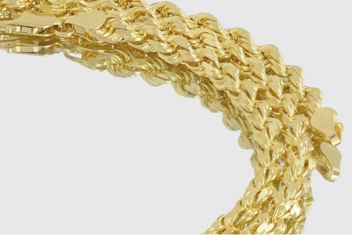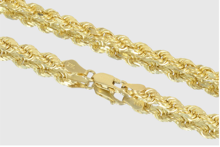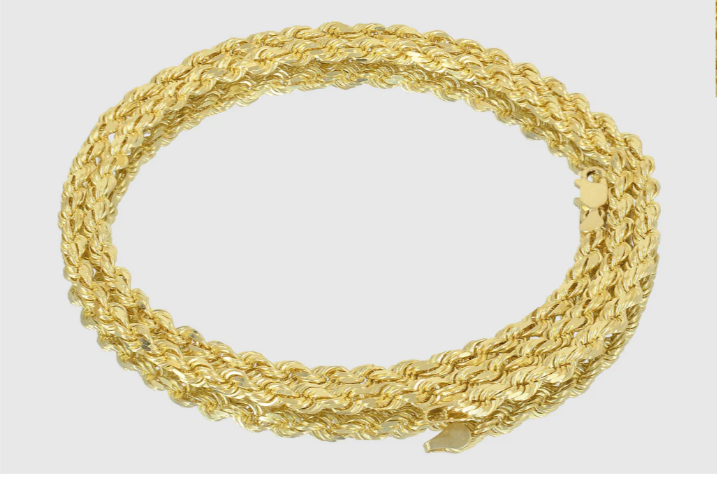 This product is a 5.5mm Solid Rope Necklace made of 10k Yellow Gold, designed for men. It features a chain-style design and is crafted with Yellow Gold. Strong and durable diamond cut rope chains. Highest Superior Quality. Comes with lobster lock. 100% Solid 10 k Gold. Available in 1.5mm to 5.5mm width and 16 inches to 30 inches length.
