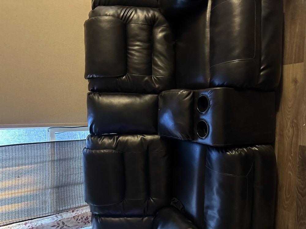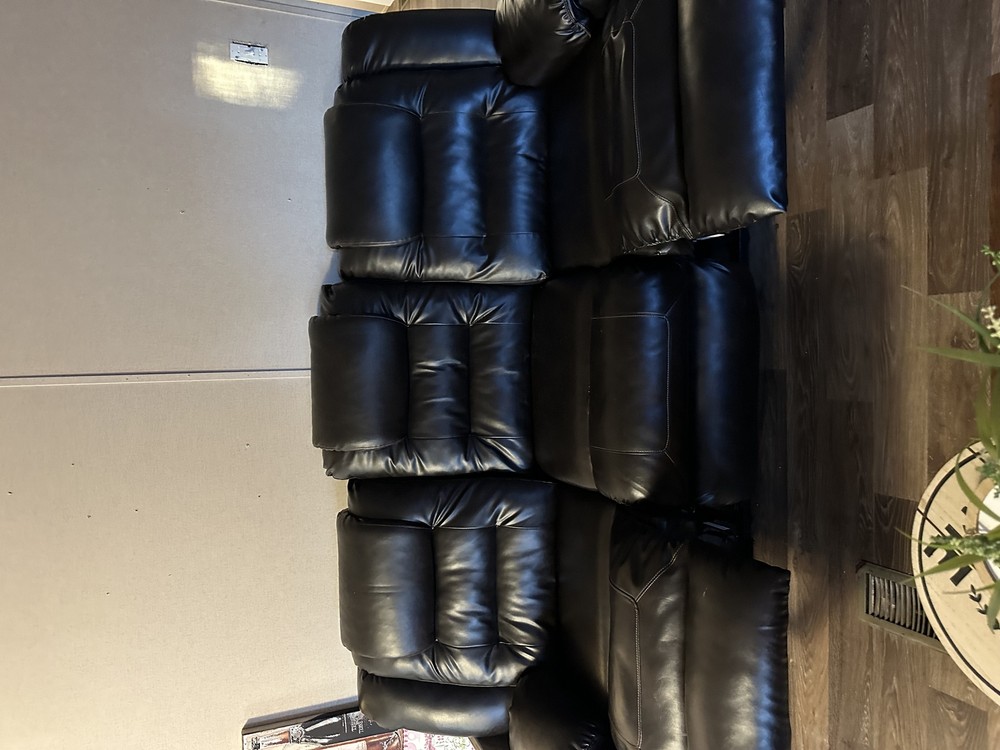 Brown leather sofa set from Ashley Furniture, suitable for a living room or dining room. This contemporary/modern style sofa has a seating capacity of 5 and is upholstered in leather. It measures 35 inches in height, 15 inches in length, and 36 inches in width.