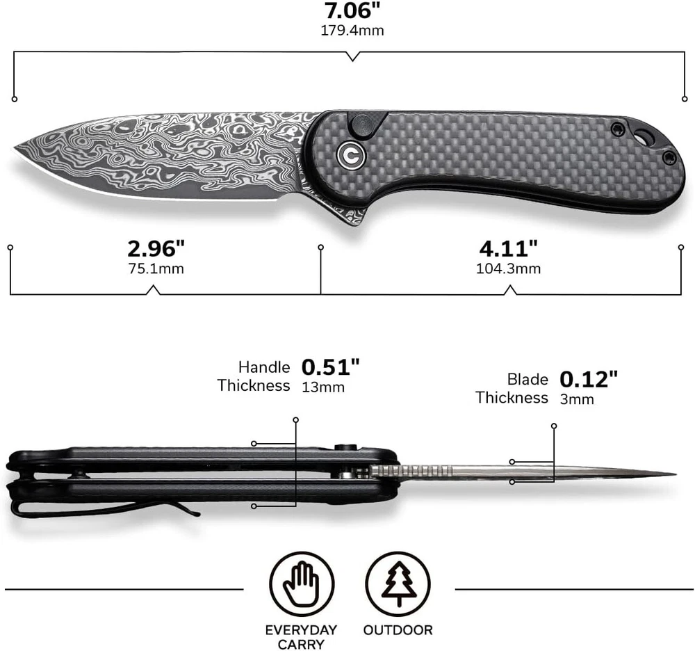 Elementum II Pocket Folding Knife, " Damascus Blade Utility Knife with Deep Carry Pocket Clip for EDC Classy, Minimalist, Aesthetic --- Flipper opener with a ceramic ball bearing pivot ensures a smooth and reliable action. The knife blade is secured in place via a button lock. Damascus Blade --- Its razor-sharp edge and ergonomic handle style effectively perform everyday tasks. All-Round Knife for Men --- This folding knife is built to excel in any environment with confidence, makes it a reliable tool for both outdoor and indoor needs. Discreet and Safety Carry --- Carry with confidence with a deep carry clip whether in your pocket or backpack, ready for immediate use. Voted "Best Edc Knife"--- This pocket knife is easy to use, suitable for all adults, also can be a nice gift to a friend whether they're into knives or not. USA Service Center --- knives and tools provide a service against defects in material and workmanship.