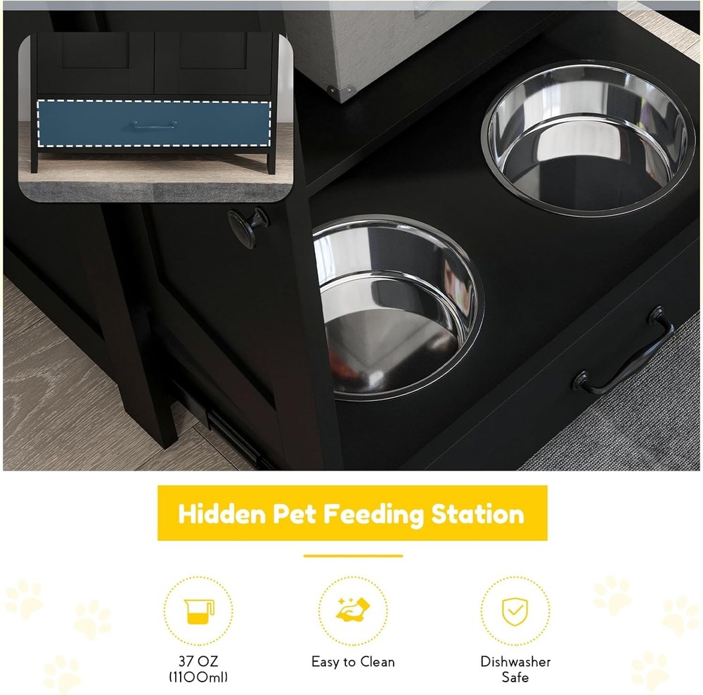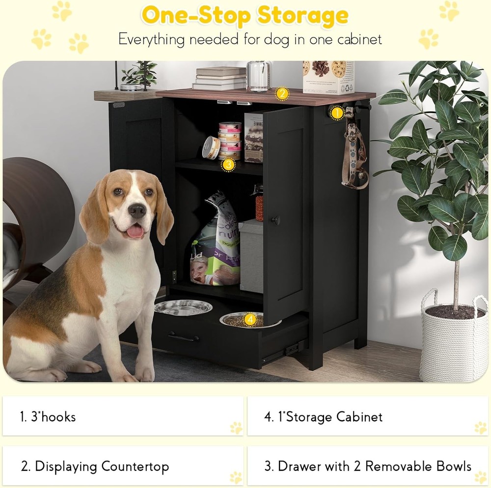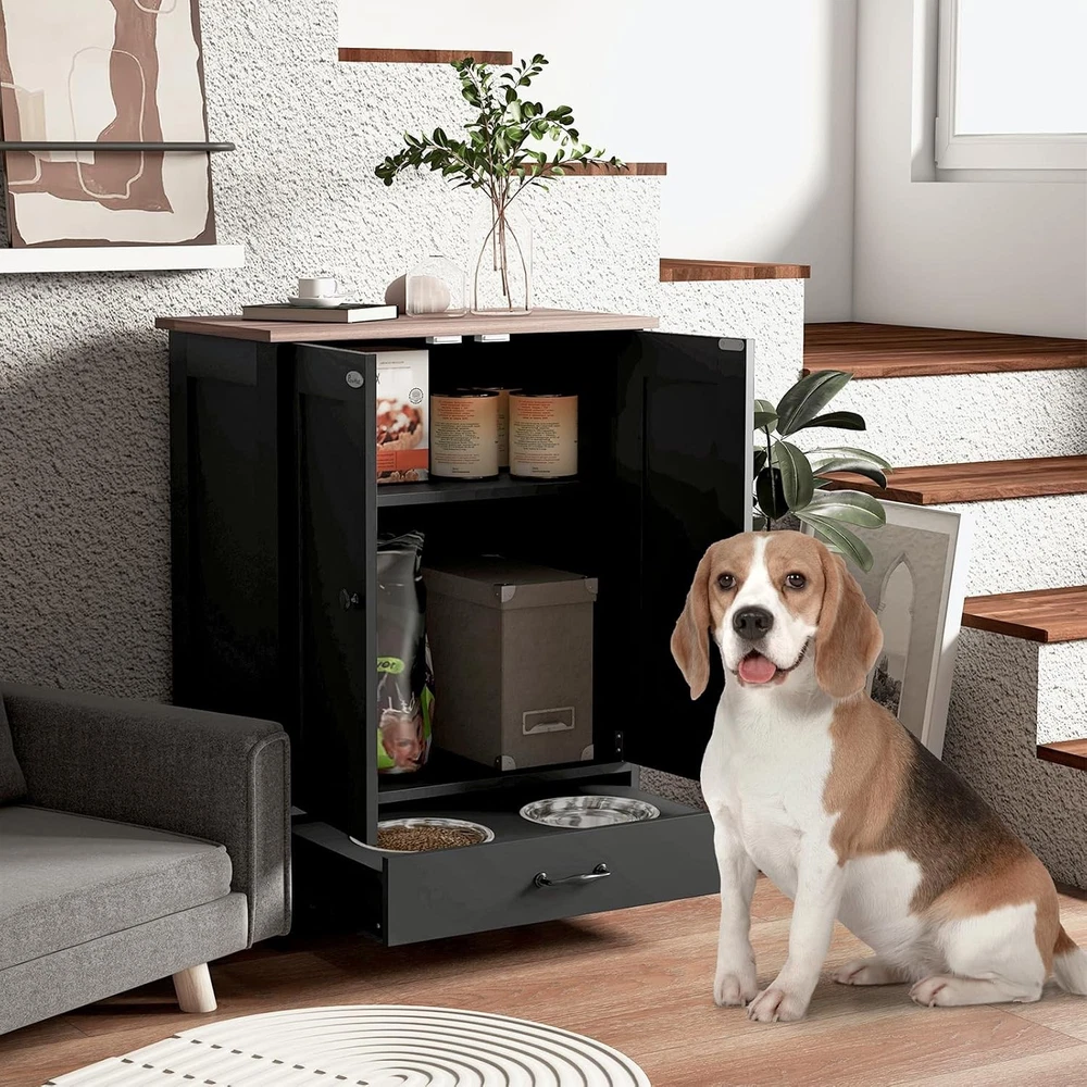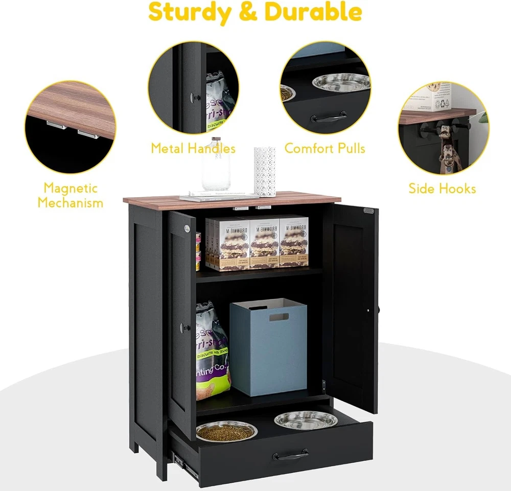 Product Description About this item Hidden Pet Food Container: The dog food storage cabinet is designed with a bottom pull-out drawer. When eating, pull out the bottom drawer to reveal the food and water bowls. When the feeding time is over, just push it back. Keep your environment as clean and tidy as ever. Store Pet Supplies: Use this pet feeding station to store all your pet supplies in one place. Three hooks on the side can hang harnesses and leashes. Cabinet can store food bags. Countertop can store cans, pet jackets or treats. Use at Home: You can use this pet food storage cabinet as a coffee table in the living room or a side table in the office or bedroom. Suitable for Bulldog, Boston Terrier, Chihuahua, Shih Tzu, Yorkshire Terrier, Labrador Retriever, Golden Retriever, German Shepherd, Rottweiler, Doberman Pinscher, etc. Beautiful and Sturdy: Our pet feeding station has a particleboard frame and base that is smooth and easy to keep clean. Comes with 2 stainless steel bowls for safe and hygienic feeding of your pets, creating a vintage industrial look that blends seamlessly into any home decor. Overall dimensions are 23.6"L x 13.8"W x 31.5"H. Installation and Service: The elevated dog bowl holder includes clear illustrated instructions and all accessories for easy installation. If you encounter any product problems after purchasing the pet storage box from us, regardless of its quality or use, don't worry, please feel free to contact us. We will provide you with a satisfactory solution and give you a good shopping experience. Product Features Hidden Feeding Solution: This dog feeding station includes two concealed bowls, ensuring a tidy space for your pet to enjoy their meals - great for maintaining a clean and organized area. Versatile Storage: Equipped with a pet food storage cabinet featuring a removable panel and three adjustable heights, this pet station adapts to your storage needs, simplifying pet mealtime routines. Convenient Accessories: This pet dish bowl set with storage offers three side hooks for hanging leashes or collars, keeping your pet's accessories organized and within reach. Stylish and Functional: The large top of our dog food storage container with bowls is a functional piece of furniture, blending seamlessly with your home decor while providing a dedicated space for your pet's feeding area. Dog Feeder Station Info: Overall Dimensions: 23.6" L x 13.8" W x 31.5" H. Suitable for medium-sized pets measuring 14"-20" in shoulder height. Assembly required. Specification Main Material: Particle Board Product Dimensions: 23.6"L x 13.8"W x 31.5"H. Weight (lbs.): 18.20 Package Size: 36"L x 25.4"W x 5.7"H. Weight (lbs.):45.20