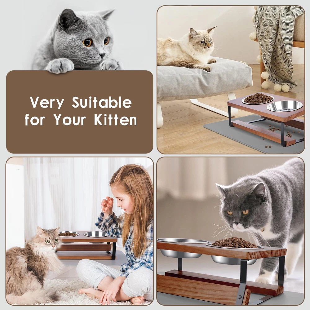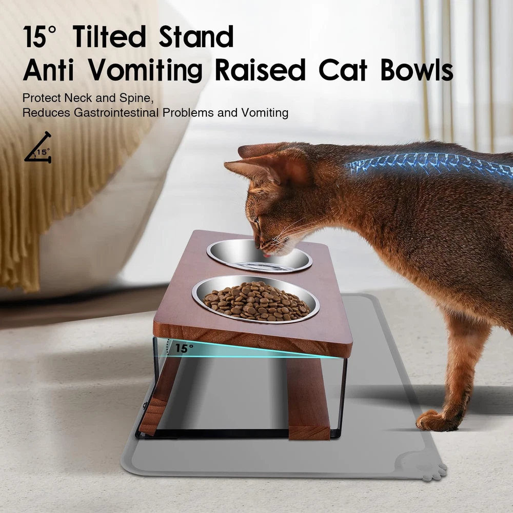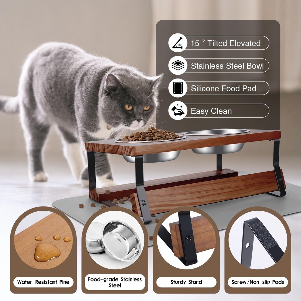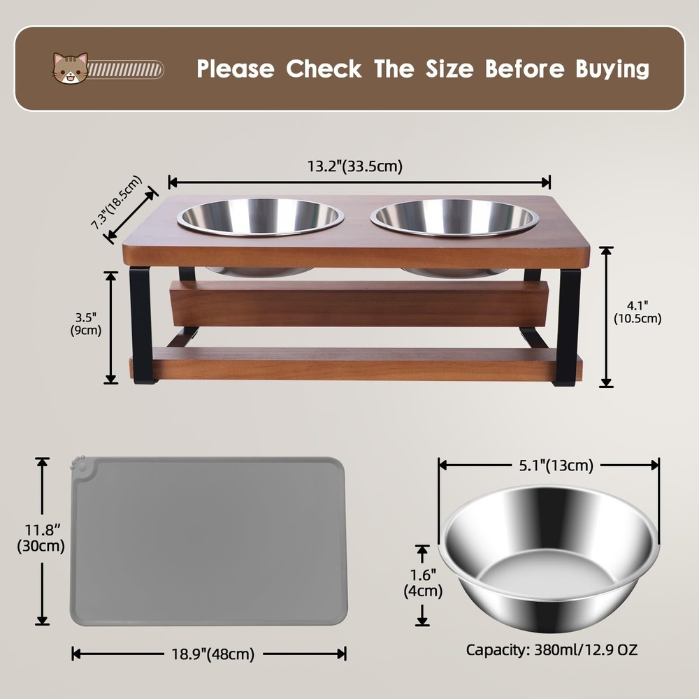 15°Tilted Elevated Cat Bowls with Food Mat, 2 Stainless Steel Bowls 【Easy to Assemble】 Step 1: Connect the bowl holder to the iron frame with screws. Step 2: Use screws to connect the 2 fixed wooden slats with the corresponding holes, and put a non-slip pads on each of the bottom 4 feet to avoid scratching the floor 【Packing List】 Elevated cat bowls set includes 1 x solid wood bowl holder, 2 x fixed solid wood plates, 2 x iron frames, 2 x stainless steel bowls, 1 x silicone food mat, and accessories: 1 x screwdriver, 8 x screws, 6 x non-slip pads 【Solid Wooden Stand】 Our cat bowl is made of natural wood, anti-deformation. It is polished to be thornless, no odorless, will not harm your pet (Note: Wood products should not be exposed to continuous humidity. If it gets wet, please dry it in time !) 【Upgraded Pet Bowls】 2 stainless steel bowls, each with a capacity of 12.9 OZ. Silicone food mat can prevent cats and puppies from spilling food residues on the floor while feeding, and keep the room or carpet clean. Food mat size: 18.9" x 11.8" 【15° Tilted Design】 Our cat bowls elevated tilted 15° design protect the cervical spine of pets, which can effectively relieve the pressure on the neck and stomach of cats when eating, and help reduce the risk of vomiting and indigestion