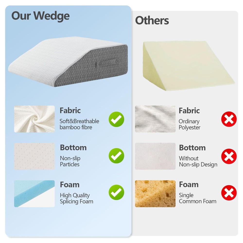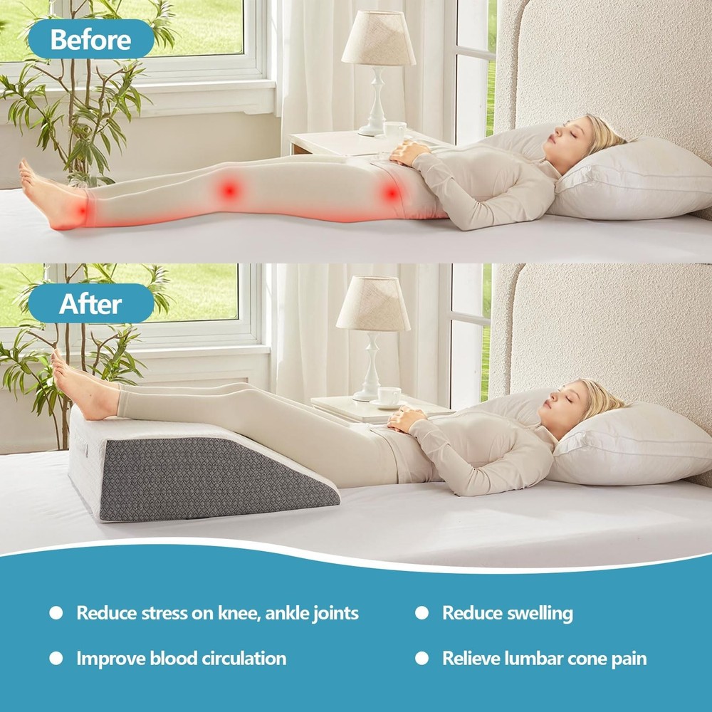 Leg Pillow for Elevation & Support, 24"x22"x8" Memory Foam Cushion with Grey White Patterned Polyester Cover, Ideal for Improving Circulation & Relaxing Leg ERGONOMICAL SHAPE: Our elevated leg pillow measures 24 inch * 22 inch * 8 inch with an inclination angle of 45 degrees, ergonomically designed to help promote blood circulation FIRM SUPPORT: The inner core of this leg pillow for sleeping is made of 1.2 inches memory foam on the top and high quality sponge on the bottom, which provides firm support, won't collapse, sturdy and durable SKIN-FRIENDLY FABRIC: The surface of the leg elevation wedge for circulation pillowcase is made of soft and breathable fabric, which is moisture-wicking and breathable; refreshing and comfortable. the pillowcase is individually removable and machine washable, very easy to clean and care for THOUGHTFUL DESIGN: The elevated leg pillow for leg swelling is designed with a carrying handle for easy movement. In addition, the bottom of the elevated pillows for legs has a non-slip design to ensure stability during use IDEAL FOR GIFT: Whether you have leg elevation needs or reading & watching TV in bed, the elevated pillows for sleeping is a quality choice and an ideal gift for seniors; pregnant women; family and friends. A night's restful sleep is the most precious gift for your family and friends QUALITY AFTER-SALES SERVICE: If you encounter any problems while using the wedge pillow, please feel free to contact us and we will try our best to solve them for you. Upon receipt of the wedge pillow, we recommend that you leave it in a cool and ventilated place for twenty-four hours, this will help the odor of the new pillow dissipate and allow the pillow to fully recover its original shape