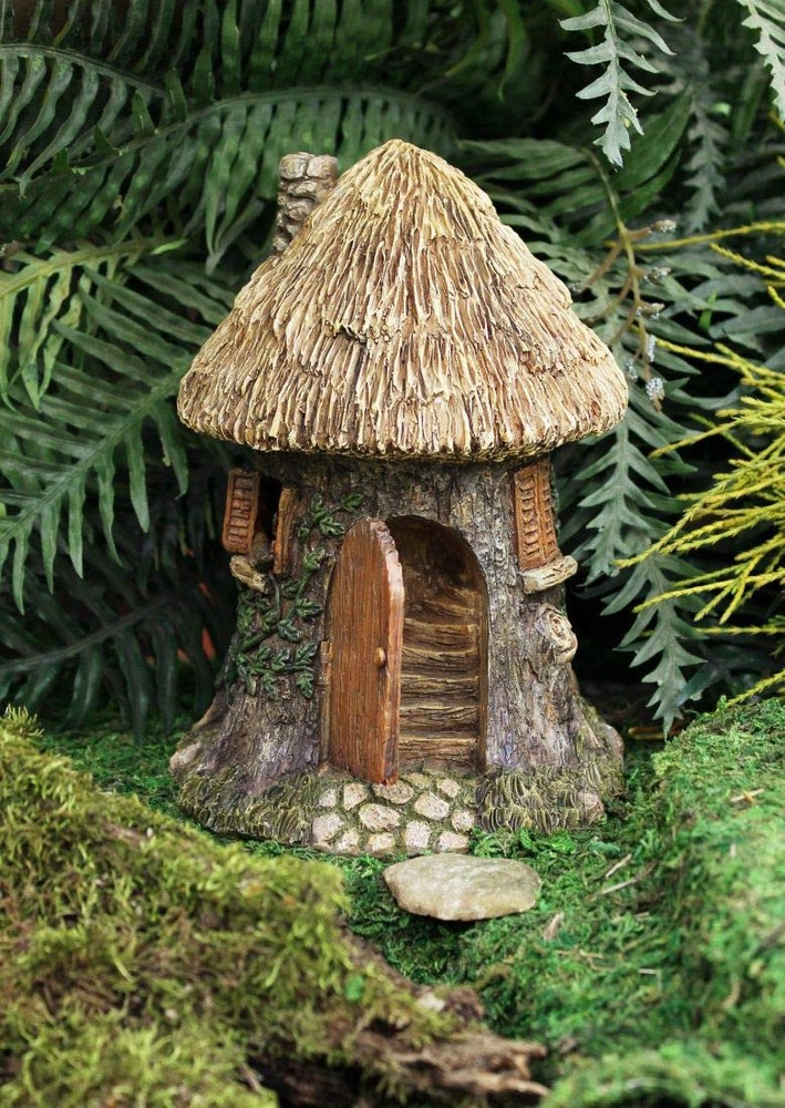 Add new real estate to your fairy garden villages with this realistic, round mini thatched-roof house. Composed of a strong polyresin, this detailed fairy garden ornament features: a detailed tree trunk and bark with vines, a functional door that opens to a flight of detailed wooden stairs, wooden shutters on a second story loft, yellow thatch roof covering, open windows, and a stone chimney. Your fairies will be eternally grateful for upgrading their neighborhood with this miniature gnome cottage. Great decor for any dollhouse or fairy garden, this realistic elf home also makes a great gift for fairy garden enthusiast friends and family members. Rustic fairy house measures approximately 5 1/4" wide and 7 1/2" tall. Fairy garden accessory ships brand new with our 100% customer satisfaction guarantee. Give your fairy garden villages and cottages a miniature upgrade with this mini thatched-roof house Detailed gnome home decor features detailed tree trunk with growing vines, a functional door and wooden shutters Elf cottage also features a yellow thatch roof covering, open windows, and a stone chimney Dollhouse ornament makes a great gift for fairy garden enthusiast friends and family members Thatched-roof house fairy garden accessory measures approximately 5 1/4" wide and 7 1/2" tall