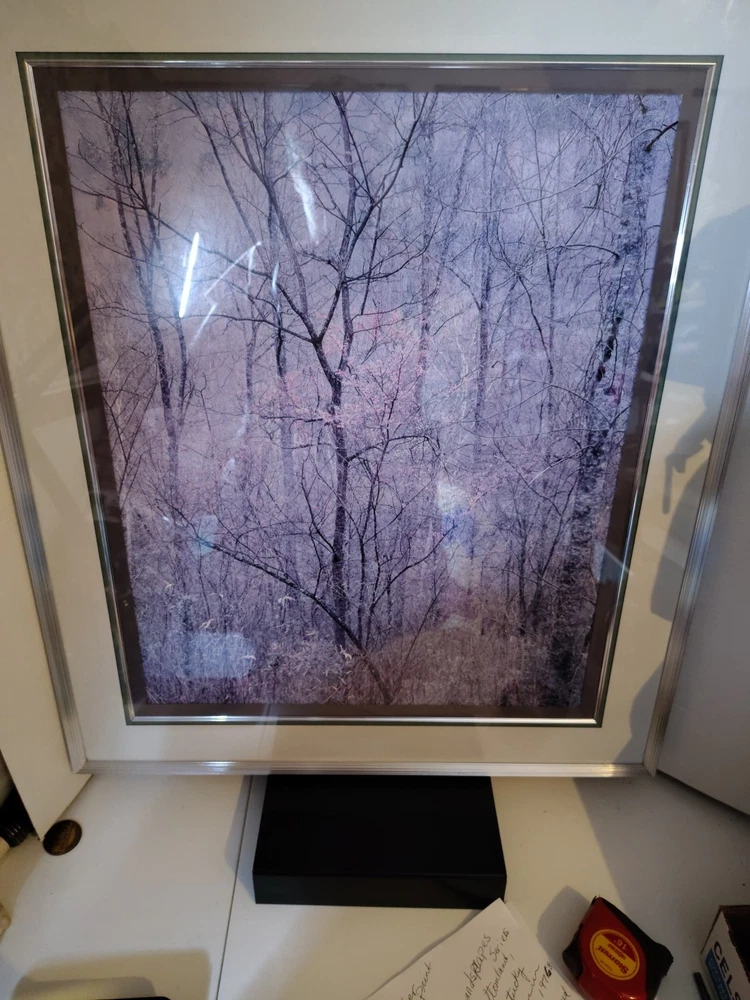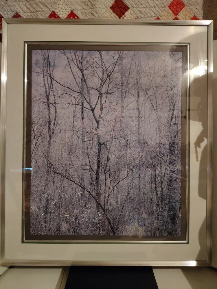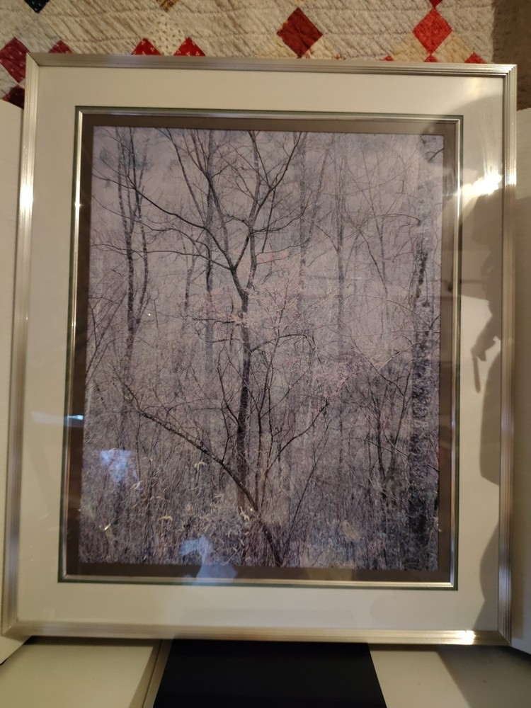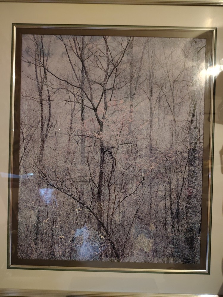 This beautiful scenery done by Elliot Porter is a print part of the intimate landscape series this is redbud tree in bottom land Red River gorge Kentucky it was taken in 1968 it has formattings professionally framed by creative framing and laser art gallery in Canton Ohio it is a beautiful beautiful scenery I must see