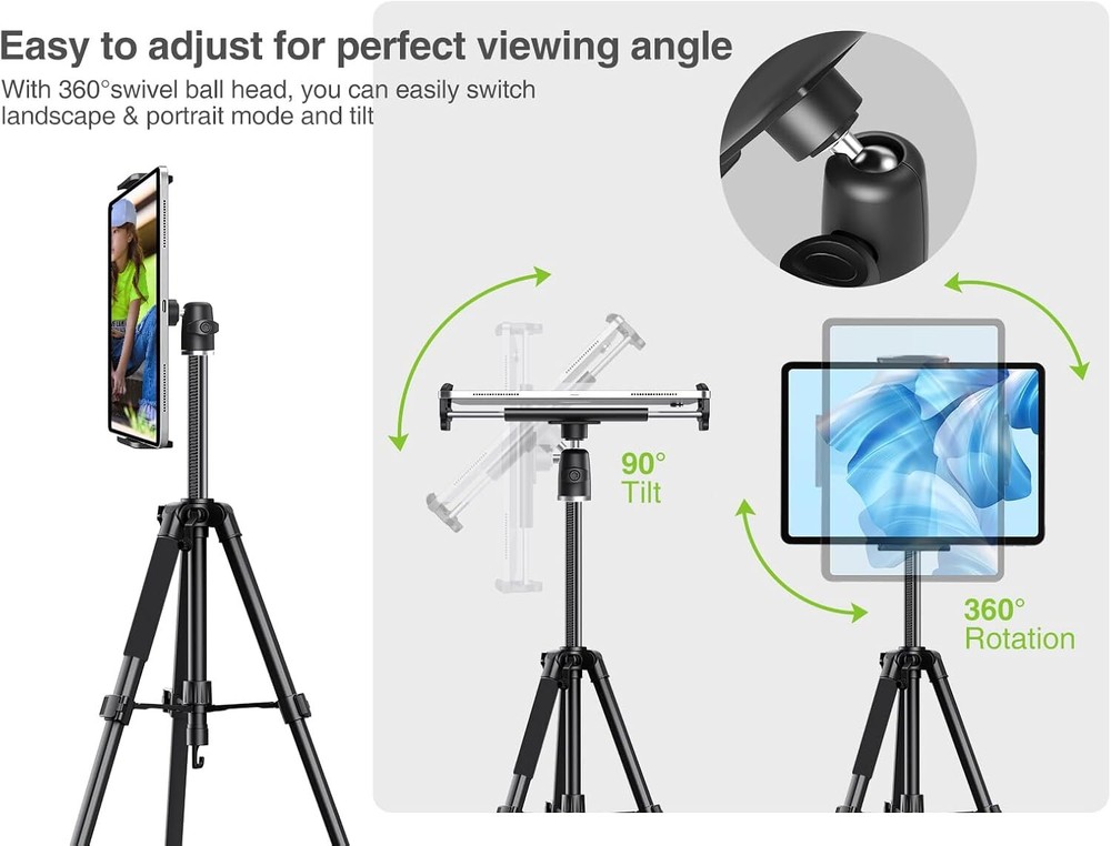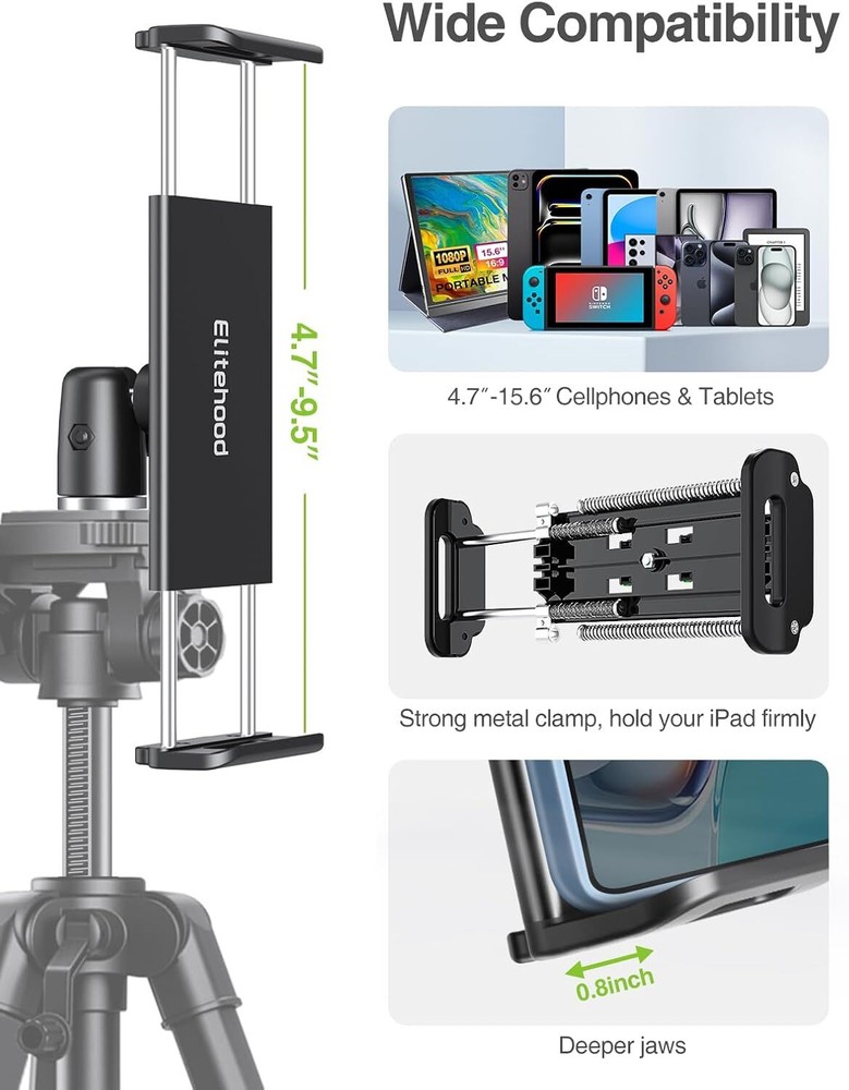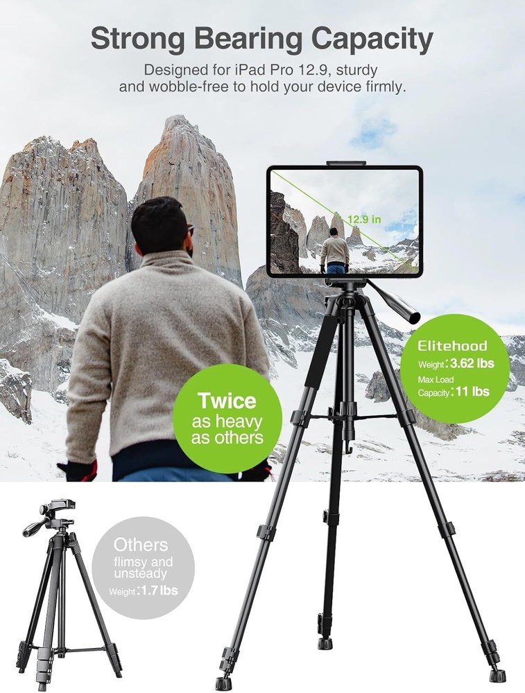 Product Description Elitehood 68" Heavy Duty iPad Tripod, Ultra-Stable Camera Tripod for iPad Pro 12.9, iPad Tripod Stand Mount for Video Recording/Photography, Compatible with 4.7-13inch Tablet/iPad Pro/Webcam/DSLR Heavy Duty Design & Ultra Stability--Made of aluminum, weighing 2.87 pounds, this iPad tripod legs are thicker and stronger, extending longer spacing and wider range, making this tripod heavier and more and stable than others on the market. Designed for large tablets such as iPad pro 12.9 inch, regardless of wind and rain, it can provide safer weight support for your device, allowing you to make video recording or photography with reliability. 68in Tall iPad Tripod & Multi-height Level--This iPad tripod stand is adjustable from 18 to 68 inches, about 10 inches higher than other tripods on the market. Each of 3 legs has 5 extendable sections, enabling it to be configured to rest on any type of surfaces without the fear of tipping over, and the height of the pan-head can be adjusted. It not only meets the needs of different people at multiple height level, but also provides a higher shooting perspective than other tripods for iPad. Wide Compatibility & Versatile Use--Adjusted from 4.7" to 9.7", this iPad holder suits all 4 -13" tablets with thick case. Compatible with: iPad Pro12.9 11/ iPad 10 9 8/Air/Mini/ Microsoft Surface/ Galaxy Tab/ Nexus and more. You can either place the iPad holder on the 1/4" screw with this tripod or remove the pan-head and join the holder to the tripod to use it individually. Also it’s suitable for Gopro/ring light/Binocular/Canon Nikon Sony Panasonic DSRL cameras and Olympus Fujifilm cameras. Flexible Angles & Countless Applications--With 3-way pan-head with screw attachment, the pan head realizes 360°panoramic shooting, while satisfying vertical or 180°tilting and almost any angle you can imagine. Additionally, our metal iPad holder, different from others, is made with ball joint design, realizing any adjustable angles. This tablet tripod is the best choice for photography, video recording, live streaming, stargazing, camping, hiking, etc. Professional Features & User Friendly—Easy to assemble with smooth rotation and extension of legs. A built-in lever and weight hook are provided for added stability on windy days. Foam on the leg makes it more portable and leave you more comfort when carrying it in hand. Anti-slip rubber feet increase the friction with the ground so it’s more stable for the stand with uneven terrain. All detailed designs are user-friendly and professional for those who need a tripod for iPad and camera. About Us We are a reputable seller with many years of experience selling on eBay. Our goal is to provide high-quality products and excellent customer service. Shipping Items will be shipped within 1-3 business days when we received payment. (Orders are not processed on weekends & holidays) Tracking information will be sent once item is shipped. Delivery time depends on destination and other factors Item is shipped to ebay address. Leaving correct address can minimize delay. For international shipping and shipping to Guam, Hawaii and Alaska, Please contact us before placing the order. International buyers please note: Import duties, taxes and charges are not included in the item price or shipping charges. These charges are buyer’s responsibility. We will try our best to reduce the risk of the custom duties. Local pick-up is unavailable at the moment. Contact Us We reply any email messages within 1 business / working days(off-duty at weekend). If you do not get a response from us, then please check your junk or spam mailbox. Our Business hours: Mon-Fri 9:00-18:00, UTC/GMT +8 hours. Please contact us either by clicking "contact seller" in the "purchase history" section or simply click "ask a question" at the bottom of this page. If you are unsatisfied with our item or service, please contact us before leaving any feedback. We are committed to resolve all issues in a friendly and satisfactory manner.