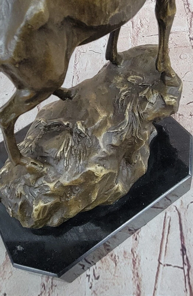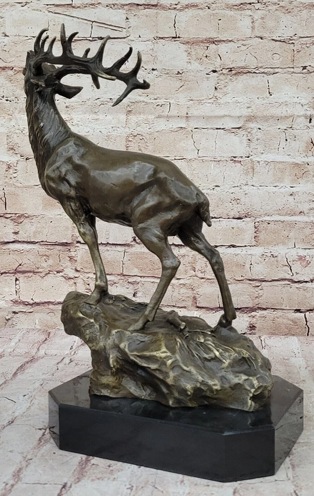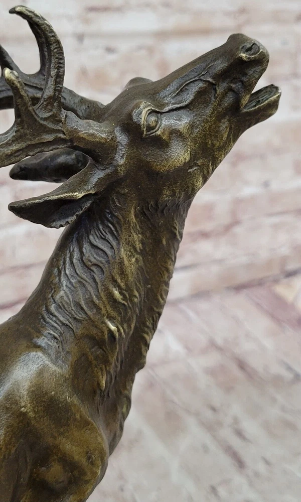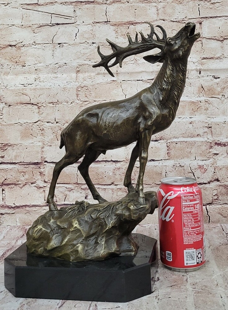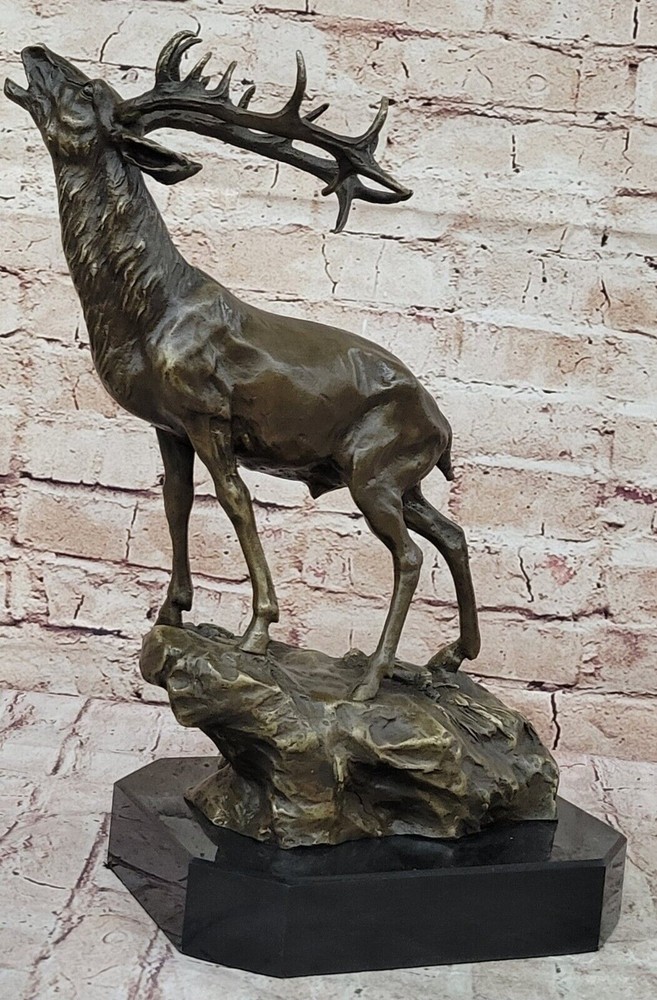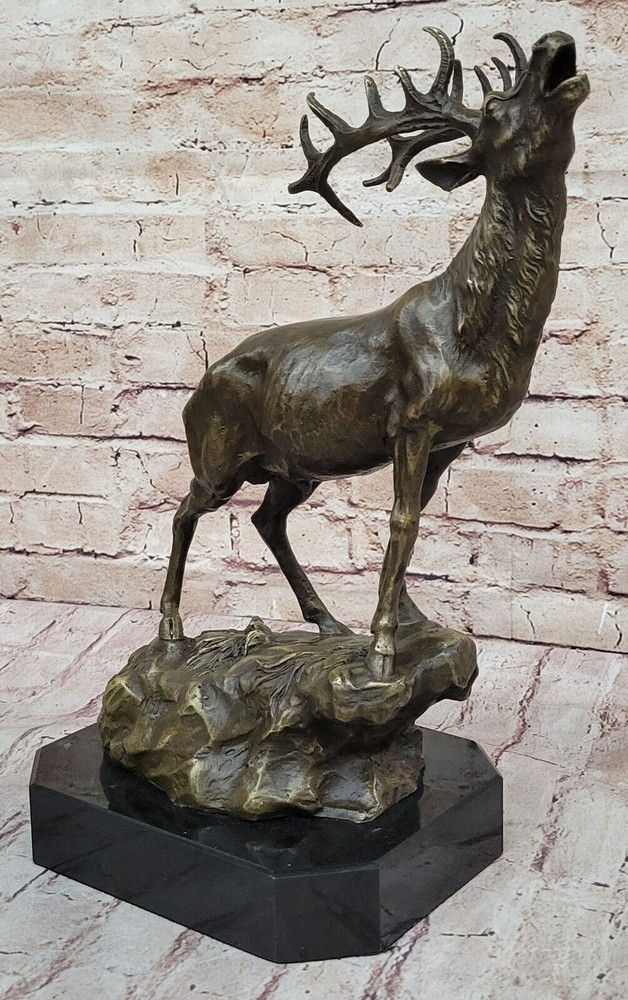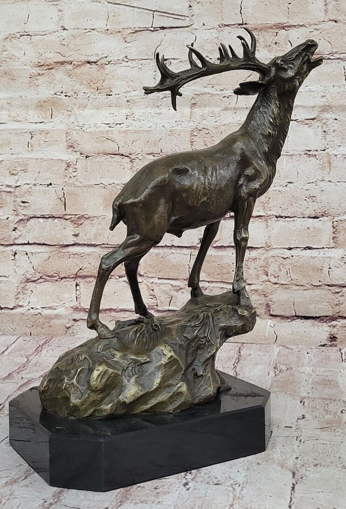 Condition : This sculpture is in perfect condition. Bronze Dimensions with Marble Base: Height 14" X Width 16" Marble Dimensions:8" X 7" Height without base:13" Weight:14 LBS Inventory:69-Y2735596 This captivating bronze sculpture brings to life the image of a magnificent Reindeer (Caribou) in a moment of vocal expression, resonating across the expansive tundra of the North. The sculpture skillfully captures the essence of the animal's call, with intricate details conveying the power and grace of this majestic creature. The breath of the Reindeer is subtly portrayed in the cold air, adding a touch of realism to the scene. Crafted using the ancient lost-wax casting method, the sculpture exemplifies the artist's dedication to preserving the beauty and spirit of wildlife in bronze. The brown patina finish enhances the textures and contours, creating a sense of depth and character. Mounted on a sleek black marble base, this sculpture becomes a focal point of admiration, with the artist Milo's signature providing an authentic seal of craftsmanship. Whether displayed in a curated art collection or as a standalone piece, this bronze sculpture captures the allure of nature and the untamed beauty of the North. It serves as a testament to the artist's skill in immortalizing the majesty of the animal kingdom and stands as a remarkable addition to any art enthusiast's repertoire. Chalet Lodge Art Elk Stag Buck Deer Hunter Bronze Marble Base Sculpture Statue Video will open in a new window Using the eBay App? Paste link into a browser window: [isdntekvideo]
