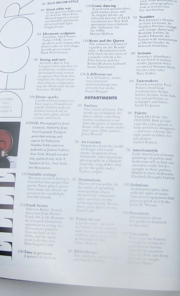 Elle Decor fashion magazine, November 1990 issue, from Hachette Magazines. 162 pages. Contents page is shown in 2nd picture. CONDITION: Exact item as pictured, it is not a stock photo. Very Fine- grade copy, slight waving that has mostly settled already, (nothing major at all), other minor wear, great copy overall. The item pictured is the exact item we are selling. Feel free to ask questions if you have them - we offer discounts on multiple purchases! GRADING: We grade our comics and magazines according to the Overstreet guide as noted on eBay. Click HERE to see that page. If you are unsatisfied with your purchase, PLEASE let us know. We strive to be easy to work with! SHIPPING NOTES FOR MAGAZINES: If First Class shipping to the US is not shown as a shipping option, this item is too heavy for that option. Sorry, cannot be shipped via Media Mail as it does not qualify (we found out the hard way). All other shipping options are available. We will be glad to combine shipping on multiple items and reduce to actual cost. CLICK OR TAP HERE TO SEE ALL THE VINTAGE MAGAZINES IN OUR EBAY STORE! LOTS of rare Saturday Evening Post, Life, womens interests and more! CLICK OR TAP HERE to visit our eBay Store and save on shipping with ONE INTERNET STOP! With over 1500 different items to choose from, we have something for every kid on your list (even the big ones)! Buy with confidence from us -- we have over 20 years experience selling on eBay and other venues! ing on eBay and other venues!