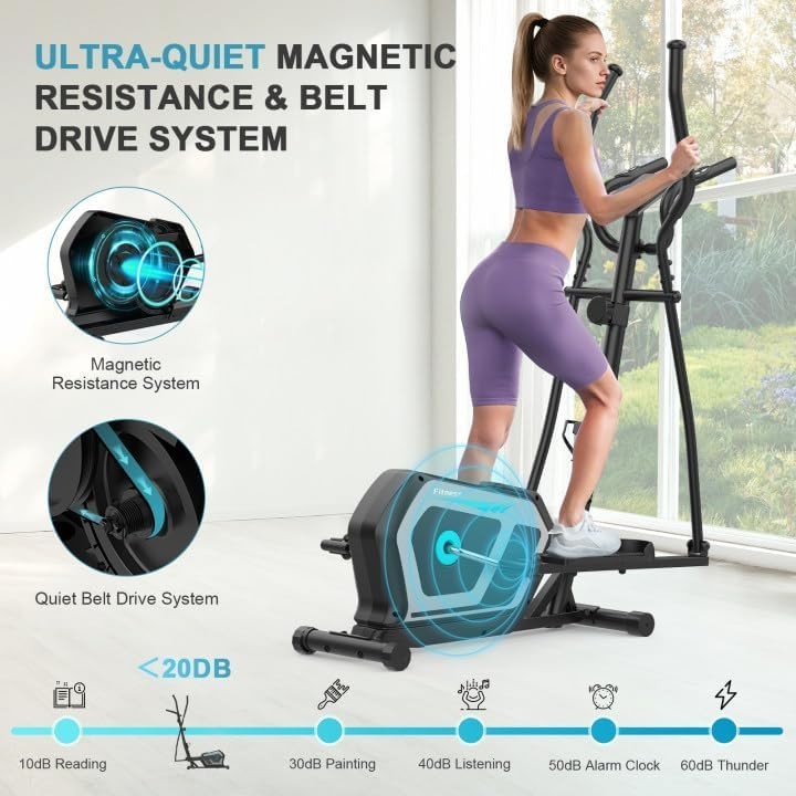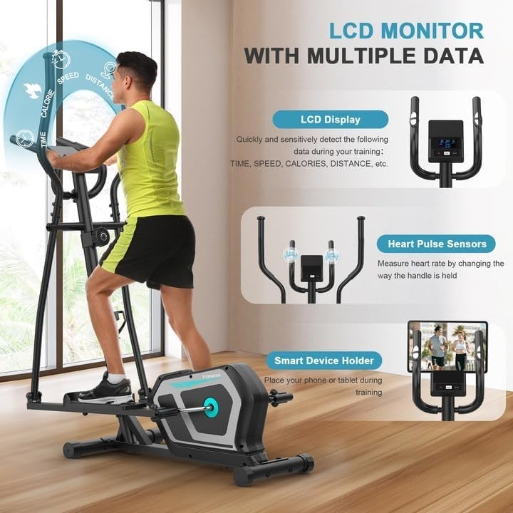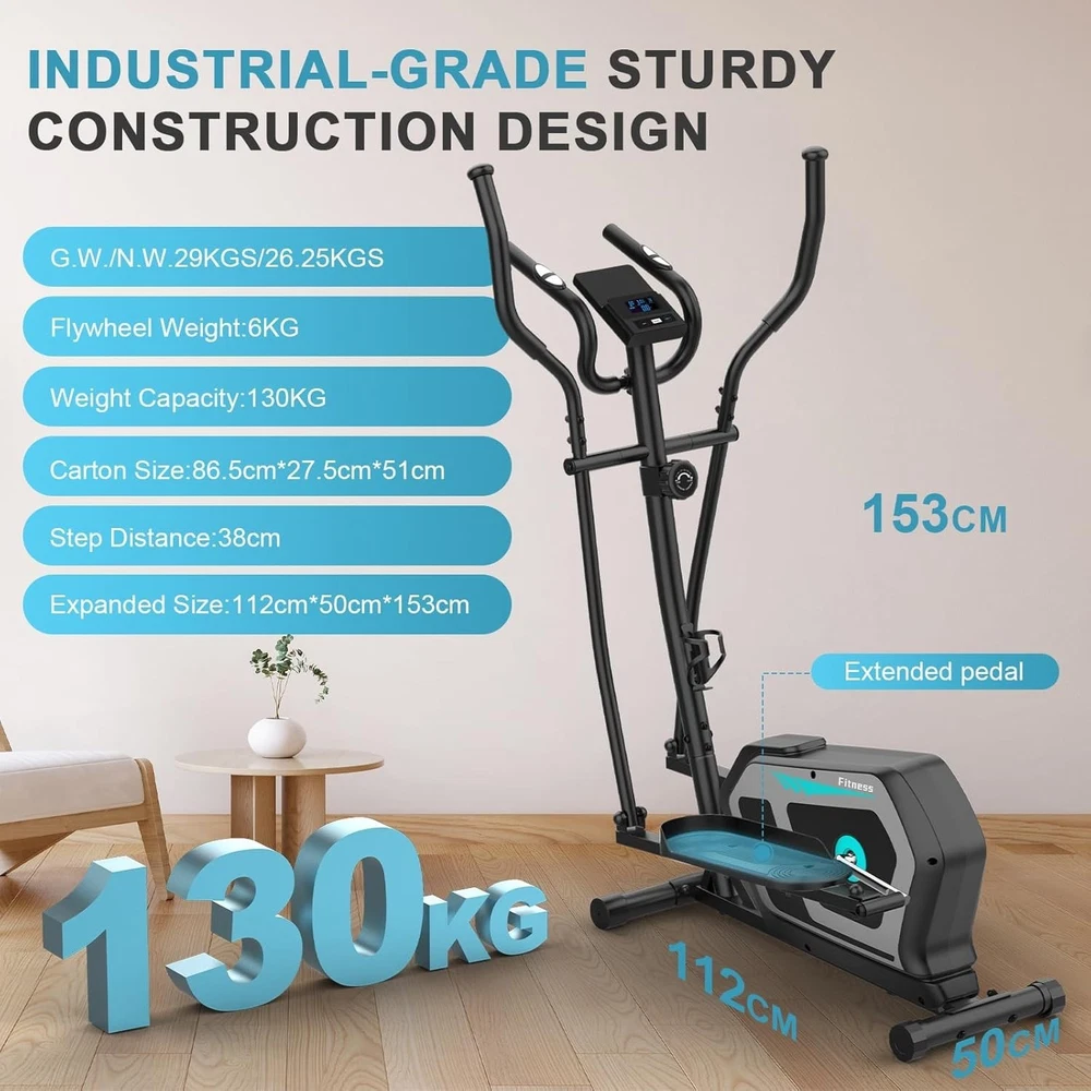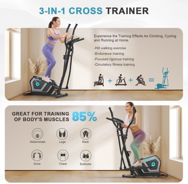 【3 in 1 Elliptical Cross Trainer】Cowmew is dedicated to the research of cross trainers, after testing by 3000 groups of fitness people, we designed and developed this 3 in 1 elliptical machine. This cross trainer has a complete 16-level resistance system for smooth adjustment of resistance. The elliptical machine also has a bright, high-definition LCD display, equipped with a double armrest design, which can exercise the muscles of the whole body and suitable for family members with different workout needs. 【16 Levels of Adjustable Resistance】The elliptical machine has 16 levels of adjustable resistance. Levels 1-4 are suitable for warm-up training, 5-8 are suitable for exercise, 9-12 are suitable for fat burning training, and 14-16 are suitable for people who need higher resistance. You can easily adjust the resistance to different levels by simply turning the knob, so it is suitable for novices and experienced exercisers. The amount of resistance required for elliptical machine fitness training can be adjusted by turning the knob to meet the different workout needs of family members. 【Multi-Function Display】 The bright, high-definition display of the elliptical machine has multiple modes, and it can be set by adjusting the display button. The display of the cross trainer can quickly and sensitively detect the following data during your training: TIME, SPEED, CALORIES, DISTANCE, TOTAL DISTACE, WATT, PULSE/BPM, providing you with real-time sports data to detect your workout effect. 【Ergonomic Design & Effective Fitness Effect】The elliptical machine optimizes the stride distance during workout, the exercise stroke is more scientific, and provides a more effective fat burning effect. The cross trainer is a simple but powerful fitness equipment that allows you to easily perform full-body aerobic training at home without plugging in, adapting to your needs for rehabilitation, shaping, fat burning, etc. It helps you to exercise the muscles of the whole body, especially the leg and buttocks muscles. It only takes 15-20 minutes of continuous training to let you to experience the same training effects as running, swimming, and cycling at home. 【Sturdiness of the Elliptical Machine】The elliptical machine is made of high-quality materials, and the front and rear foot tubes are double reinforced, ensuring the stability and durability of the cross trainer fitness, which making it an affordable choice for the family. The main frame can provide stable support for users weighing up to 130 kg, so it is suitable for family members to use together. 【Dual Handle Design & Easy to Store】The elliptical machine adopts a dual handle design, it could meet different training needs by using different grips during your training period. The widened and thickened foot pedals provide a more comfortable workout experience while protecting the knees and ankles. It is also equipped with silent transport wheels, which can be easily moved to any place in the room. After exercise, it can also be conveniently stored in your living room, bedroom and other corners without taking up space of your home. 【Easy Installation & After-Sales Guarantee】This elliptical cross trainer comes with a detailed instruction manual and installation tools, which is very easy to install. We have 24-hour customer service support. If you have any questions, welcome to contact us at any time. Our elliptical machines have a 12-month warranty and are equipped with professional engineers to answer your questions.(Get help with order:1.Click on the seller's username to ask a question, 2.Contact through past orders.)