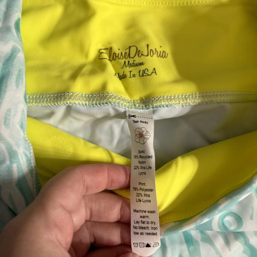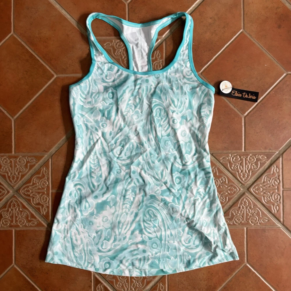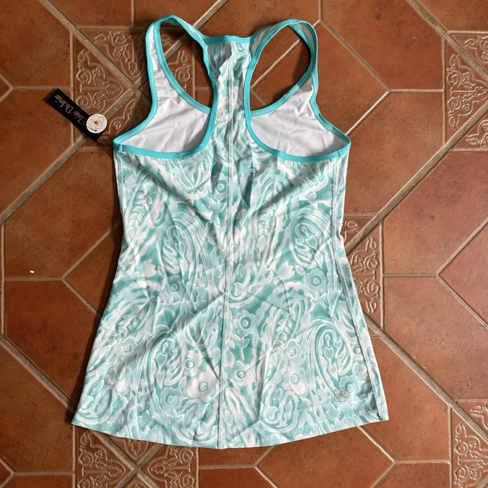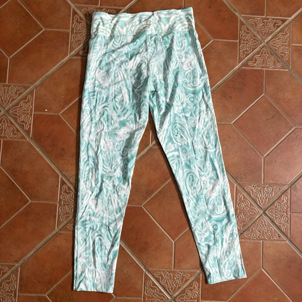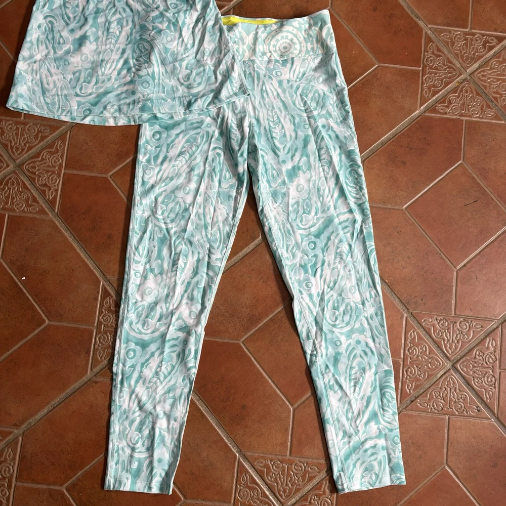Eloise DeJoria Aqua Leggings and Racerback Top 2 Piece Workout Set Women Size M Brand new, tank has hanging tags intact, leggings are brand new but tags are not intact. No tears/holes or stains. Brand label says fits a women’s size medium. Includes white and aqua floral and paisley printed leggings, and matching white and aqua Racerback tank workout top. I have other Eloise DeJoria athletic wear in this size, check my page for other options and reach out to bundle. Aqua & Chartreuse set #1